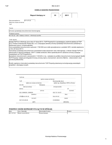 TUP RB 33 2011 KOMISJA NADZORU FINANSOWEGO Raport bieżący nr 33 / 2011 2011-07-22 Data sporządzenia: Skrócona nazwa emitenta TUP Temat Umowa sprzedaży nieruchomości komercyjnej Podstawa prawna Art. 56 ust. 1 pkt 1 Ustawy o ofercie - informacje poufne Treść raportu: Zarząd TUP S.A. informuje, że w dniu 21 lipca 2011r. TUP Property S.A. (sprzedająca, podmiot zależny od TUP S.A.) i Portico Investments Poland Sp. z o.o. (kupująca) zawarły umowę sprzedaży nieruchomości położonej w Katowicach przy ul. Uniwersyteckiej. Cena sprzedaży nieruchomości wyniosła 1 726 000 euro netto (powiększona o podatek VAT) i została zapłacona w dniu 22 lipca 2011r. Transakcja sprzedaży nieruchomości poprzedzona była zawarciem listu intencyjnego, o którym Zarząd TUP S.A. informował w raporcie bieżącym 1/2011 a także aneksów, które opóźniały termin zawarcia umowy z przyczyn niezależnych od TUP Property S.A. Sprzedana nieruchomość o powierzchni 1 543,65 m. kw., należała do portfela nieruchomości komercyjnych Spółki TUP Property i objęta jest długoterminową umową najmu z koncernem Jeronimo Martins - właścicielem sieci handlowej Biedronka. Środki uzyskane z transakcji sprzedaży nieruchomości TUP Property przeznaczy na kontynuację pozostałych projektów i akwizycję nowych. TUP SA (pełna nazwa emitenta) TUP Developerska (dev) (skróc ona nazwa emitenta) 00-108 (sektor wg. klasyfikacji GPW w W-wie) Warszawa (kod pocztowy) (miejscowość) Zielna 37 (ulica) (numer) 022 3386629, 3386620 022 721 38 57 (telefon) (fax) [email protected] tup.c om.pl (e-mail) (www) 527-010-29-48 012835824 (NIP) (REGON) PODPISY OSÓB REPREZENTUJĄCYCH SPÓŁKĘ Data Imię i Nazwisko Stanowisko/Funkc ja 2011-07-22 Robert Jacek Moritz Prezes Zarządu Podpis Komisja Nadzoru Finansowego 1