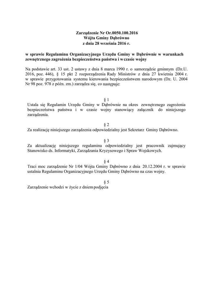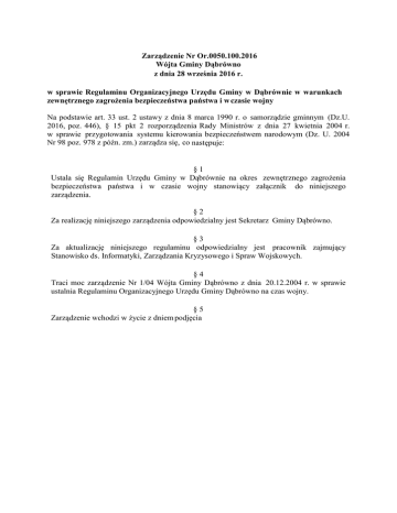 Zarządzenie Nr Or.0050.100.2016 Wójta Gminy Dąbrówno z dnia 28 września 2016 r. w sprawie Regulaminu Organizacyjnego Urzędu Gminy w Dąbrównie w warunkach zewnętrznego zagrożenia bezpieczeństwa państwa i w czasie wojny Na podstawie art. 33 ust. 2 ustawy z dnia 8 marca 1990 r. o samorządzie gminnym (Dz.U. 2016, poz. 446), § 15 pkt 2 rozporządzenia Rady Ministrów z dnia 27 kwietnia 2004 r. w sprawie przygotowania systemu kierowania bezpieczeństwem narodowym (Dz. U. 2004 Nr 98 poz. 978 z późn. zm.) zarządza się, co następuje: §1 Ustala się Regulamin Urzędu Gminy w Dąbrównie na okres zewnętrznego zagrożenia bezpieczeństwa państwa i w czasie wojny stanowiący załącznik do niniejszego zarządzenia. §2 Za realizację niniejszego zarządzenia odpowiedzialny jest Sekretarz Gminy Dąbrówno. §3 Za aktualizację niniejszego regulaminu odpowiedzialny jest pracownik zajmujący Stanowisko ds. Informatyki, Zarządzania Kryzysowego i Spraw Wojskowych. §4 Traci moc zarządzenie Nr 1/04 Wójta Gminy Dąbrówno z dnia 20.12.2004 r. w sprawie ustalnia Regulaminu Organizacyjnego Urzędu Gminy Dąbrówno na czas wojny. §5 Zarządzenie wchodzi w życie z dniem podjęcia Załącznik do Zarządzenia Wójta Gminy Dąbrówno Nr Or.0050.100.2016 z dnia 28.09.20164r. w sprawie Regulaminu Organizacyjnego Urzędu Gminy w Dąbrównie w warunkach zewnętrznego zagrożenia bezpieczeństwa państwa i w czasie wojny. REGULAMIN ORGANIZACYJNY URZĘDU GMINY W DĄBRÓWNIE w warunkach zewnętrznego zagrożenia bezpieczeństwa państwa i w czasie wojny Dąbrówno 2016 rok 2 CZĘŚĆ PIERWSZA ZASADY FUNKCJONOWANIA I KIEROWANIA PRACĄ URZĘDU ROZDZIAŁ I POSTANOWIENIA OGÓLNE §1 Regulamin organizacyjny Urzędu Gminy w Dąbrównie w warunkach zewnętrznego zagrożenia bezpieczeństwa państwa i w czasie wojny jest aktem normatywnym, który wprowadza Wójt Gminy Dąbrówno w celu kontynuowania na obszarze gminy działalności administracyjnej, gospodarczo – obronnej, obronnej i obrony cywilnej w czasie zewnętrznego zagrożenia bezpieczeństwa państwa i wojny. §2 Ilekroć w regulaminie jest mowa o: 1. Gminie – należy przez to rozumieć Gminę Dąbrówno. 2. Wójcie, Zastępcy Wójta, Sekretarzu, Skarbniku – należy przez to rozumieć odpowiednio Wójta Gminy Dąbrówno, Zastępcę Wójta Gminy Dąbrówno, Sekretarza Gminy Dąbrówno, Skarbnika Gminy Dąbrówno. 3. Urzędzie - należy przez to rozumieć Urząd Gminy w Dąbrównie. 4. Stanowiskach pracy - należy przez to rozumieć poszczególne stanowiska pracy w Urzędzie Gminy w Dąbrównie. 5. Regulaminie - należy przez to rozumieć niniejszy regulamin. §3 Regulamin Organizacyjny Urzędu Gminy w Dąbrównie w warunkach zewnętrznego zagrożenia bezpieczeństwa państwa i w czasie wojny określa: 1. Zasady funkcjonowania urzędu. 2. Organizację i zasady kierowania urzędem. 3. Zakres czynności, uprawnień i odpowiedzialności na poszczególnych stanowiskach pracy. 4. Zasady planowania pracy. 5. Zasady opracowywania i podpisywania aktów prawnych wydawanych przez organy gminy. 6. Zasady podpisywania pism i decyzji. 7. Organizację działalności kontrolnej w urzędzie. 8. Zasady przyjmowania skarg i wniosków obywateli. 9. Zasady udostępniania informacji publicznej. 10. Strukturę organizacyjną urzędu. 11. Zasady obiegu dokumentów w urzędzie. 12. Stanowiska pracy i ich zadania 3 1. 2. 3. 4. §4 Urząd stanowi aparat wykonawczy i pomocniczy Wójta. Kierownikiem Urzędu jest Wójt. Siedzibą urzędu jest wieś Dąbrówno, ul. Kościuszki 21. Strukturę organizacyjną urzędu zawiera § 7 Regulaminu Organizacyjnego Urzędu Gminy Dąbrówno. ROZDZIAŁ II ZASADY FUNKCONOWANIA URZĘDU §5 1. Niniejszy regulamin określa i precyzuje zadania Urzędu Gminy w Dąbrównie realizowane w okresie kryzysu, zewnętrznego zagrożenia bezpieczeństwa państwa i w czasie wojny. 2. Niniejszy regulamin nie narusza postanowień obowiązującego regulaminu organizacyjnego Urzędu Gminy w Dąbrównie jest natomiast jego rozwinięciem i uzupełnieniem o zadania realizowane w czasie kryzysu, zewnętrznego zagrożenia bezpieczeństwa państwa i w czasie wojny, wynikające z obowiązujących przepisów prawa i dokumentów obronnych. 3. Zadaniem Urzędu Gminy w Dąbrównie jest zapewnienie na wypadek kryzysu, zewnętrznego zagrożenia bezpieczeństwa państwa i wojny warunków realizacji zadań w zakresie bezpieczeństwa i obronności powierzonych Wójtowi, jako organowi samorządu terytorialnego, zgodnie z obowiązującymi przepisami prawnymi i decyzjami Wojewody Warmiońsko-Mazurskiego z uwzględnieniem postanowień zawartych w regulaminie organizacyjnym czasu „P”. 4. W wypadku wprowadzenia stanu wyjątkowego, Urząd działa na zasadach określonych w ustawie z dnia 21 czerwca 2002 r. o stanie wyjątkowym (t.j. Dz. U. z 2016, poz. 886). 5. W przypadku wprowadzenia stanu wojennego, Urząd działa na zasadach określonych w ustawie z dnia 29 sierpnia 2002 r. o stanie wojennym oraz o kompetencjach Naczelnego Dowódcy Sił Zbrojnych i zasadach jego podległości konstytucyjnym organom Rzeczypospolitej Polskiej (t.j. Dz. U. z 2016, poz. 851). 6. Urząd ma swoją siedzibę w Dąbrównie, ul. Kościuszki 21, zwanym Głównym Stanowiskiem Kierowania w stałej siedzibie – GSK. 7. Liczba etatów w komórkach organizacyjnych w warunkach zewnętrznego zagrożenia bezpieczeństwa państwa i w czasie wojny pozostaje w wyłącznej kompetencji Wójta. ROZDZIAŁ III ORGANIZACJA I ZASADY KIEROWANIA URZĘDEM §6 1. Wójt kieruje pracą Urzędu przy pomocy Zastępcy Wójta, Sekretarza i Skarbnika. 2. Wójta w czasie jego nieobecności zastępuje Zastępca Wójta. 3. Wójt kierując pracą Urzędu zapewnia warunki do realizacji zadań z zakresu spraw obronnych, gospodarczo-obronnych i obrony cywilnej, a w szczególności: − organizuje wykonywanie zadań w ramach powszechnego obowiązku obrony przez Urząd oraz podległe jednostki organizacyjne i podmioty gospodarcze; 