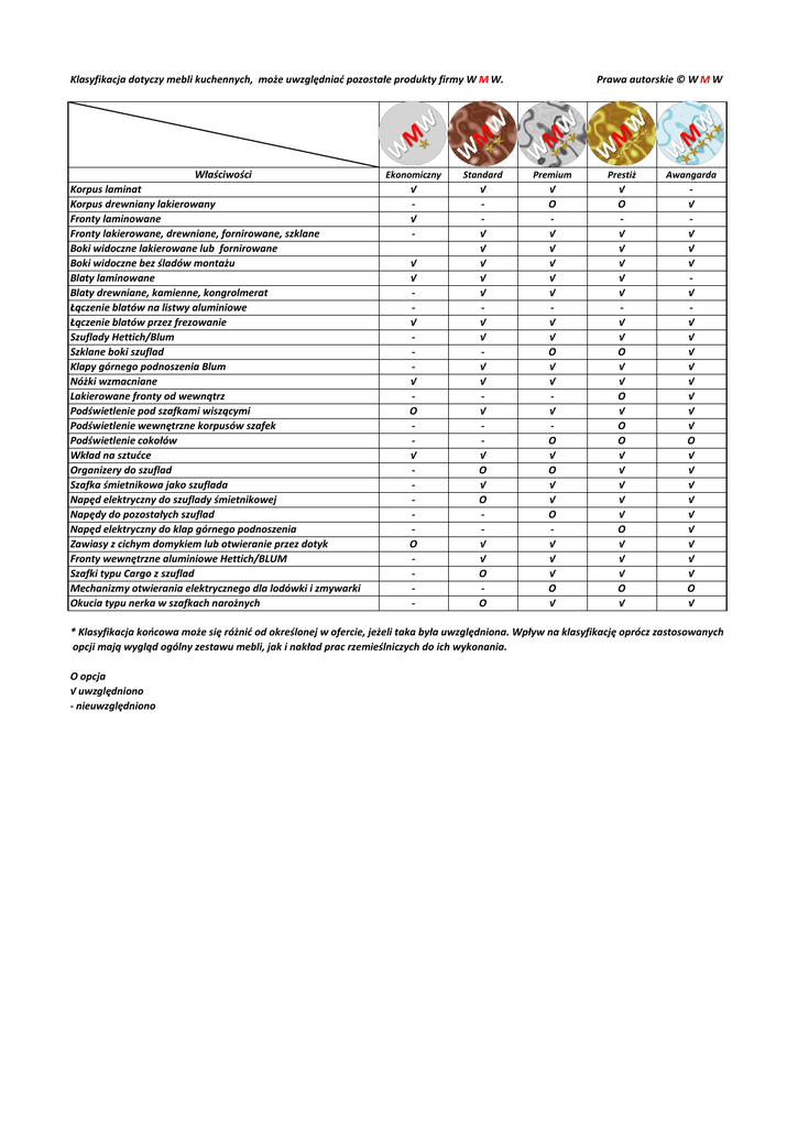 Klasyfikacja dotyczy mebli kuchennych, może uwzględniać pozostałe produkty firmy W M W. Właściwości Korpus laminat Korpus drewniany lakierowany Fronty laminowane Fronty lakierowane, drewniane, fornirowane, szklane Boki widoczne lakierowane lub fornirowane Boki widoczne bez śladów montażu Blaty laminowane Blaty drewniane, kamienne, kongrolmerat Łączenie blatów na listwy aluminiowe Łączenie blatów przez frezowanie Szuflady Hettich/Blum Szklane boki szuflad Klapy górnego podnoszenia Blum Nóżki wzmacniane Lakierowane fronty od wewnątrz Podświetlenie pod szafkami wiszącymi Podświetlenie wewnętrzne korpusów szafek Podświetlenie cokołów Wkład na sztućce Organizery do szuflad Szafka śmietnikowa jako szuflada Napęd elektryczny do szuflady śmietnikowej Napędy do pozostałych szuflad Napęd elektryczny do klap górnego podnoszenia Zawiasy z cichym domykiem lub otwieranie przez dotyk Fronty wewnętrzne aluminiowe Hettich/BLUM Szafki typu Cargo z szuflad Mechanizmy otwierania elektrycznego dla lodówki i zmywarki Okucia typu nerka w szafkach narożnych Prawa autorskie © W M W Ekonomiczny Standard Premium Prestiż Awangarda √ √ - √ √ √ √ √ √ √ √ √ √ √ √ O √ O √ √ O O √ O √ √ √ √ √ √ √ O √ √ √ O √ O √ √ O √ √ √ O √ √ O √ √ √ √ √ √ √ O √ √ O √ O O √ √ √ √ √ O √ √ √ O √ √ √ √ √ √ √ √ √ √ √ √ √ √ O √ √ √ √ √ √ √ √ √ O √ √ √ √ √ O √ O - * Klasyfikacja końcowa może się różnić od określonej w ofercie, jeżeli taka była uwzględniona. Wpływ na klasyfikację oprócz zastosowanych opcji mają wygląd ogólny zestawu mebli, jak i nakład prac rzemieślniczych do ich wykonania. O opcja √ uwzględniono - nieuwzględniono