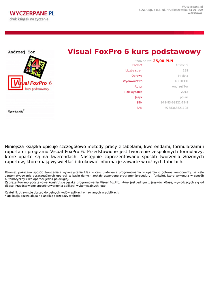 Wyczerpane.pl SOWA Sp. z o.o. ul. Hrubieszowska 6a 01-209 Warszawa Visual FoxPro 6 kurs podstawowy Cena brutto: Format: 25,00 PLN 165x235 Liczba stron: 158 Oprawa: Miękka Wydawnictwo: TORTECH Autor: Andrzej Tor Rok wydania: 2012 Język: polski ISBN: 978-83-63821-12-8 EAN: 9788363821128 Niniejsza książka opisuje szczegółowo metody pracy z tabelami, kwerendami, formularzami i raportami programu Visual FoxPro 6. Przedstawione jest tworzenie zespolonych formularzy, które oparte są na kwerendach. Następnie zaprezentowano sposób tworzenia złożonych raportów, które mają wyświetlać i drukować informacje zawarte w różnych tabelach. Również pokazano sposób tworzenia i wykorzystania klas w celu ułatwienia programowania w oparciu o gotowe komponenty. W celu zautomatyzowania poszczególnych operacji w bazie danych zostały utworzone programy (procedury i funkcje), które wykonują w sposób automatyczny kilka operacji jedna po drugiej. Zaprezentowano podstawowe konstrukcje języka programowania Visual FoxPro, który jest jednym z języków xBase, wywodzących się od dBase. Przedstawiono sposób utworzenia aplikacji wykonywalnych .exe. Czytelnik otrzymuje dostęp do pełnych kodów aplikacji omawianych w publikacji: * aplikacja pozwalająca na analizę sprzedaży w firmie