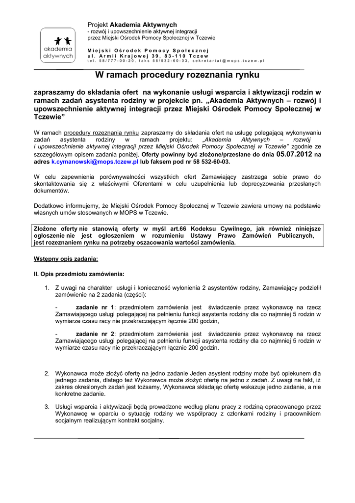 Projekt Akademia Aktywnych - rozwój i upowszechnienie aktywnej integracji przez Miejski Ośrodek Pomocy Społecznej w Tczewie Miejski Ośrodek Pomocy Społecznej ul. Armii Krajowej 39, 83-110 Tczew tel. 58/777-00-20, faks 58/532-60-03, [email protected] W ramach procedury rozeznania rynku zapraszamy do składania ofert na wykonanie usługi wsparcia i aktywizacji rodzin w ramach zadań asystenta rodziny w projekcie pn. „Akademia Aktywnych – rozwój i upowszechnienie aktywnej integracji przez Miejski Ośrodek Pomocy Społecznej w Tczewie” W ramach procedury rozeznania rynku zapraszamy do składania ofert na usługę polegającą wykonywaniu zadań asystenta rodziny w ramach projektu: „Akademia Aktywnych – rozwój i upowszechnienie aktywnej integracji przez Miejski Ośrodek Pomocy Społecznej w Tczewie” zgodnie ze szczegółowym opisem zadania poniżej. Oferty powinny być złożone/przesłane do dnia 05.07.2012 na adres [email protected] lub faksem pod nr 58 532-60-03. W celu zapewnienia porównywalności wszystkich ofert Zamawiający zastrzega sobie prawo do skontaktowania się z właściwymi Oferentami w celu uzupełnienia lub doprecyzowania przesłanych dokumentów. Dodatkowo informujemy, że Miejski Ośrodek Pomocy Społecznej w Tczewie zawiera umowy na podstawie własnych umów stosowanych w MOPS w Tczewie. Złożone oferty nie stanowią oferty w myśl art.66 Kodeksu Cywilnego, jak również niniejsze ogłoszenie nie jest ogłoszeniem w rozumieniu Ustawy Prawo Zamówień Publicznych, jest rozeznaniem rynku na potrzeby oszacowania wartości zamówienia. Wstępny opis zadania: II. Opis przedmiotu zamówienia: 1. Z uwagi na charakter usługi i konieczność wyłonienia 2 asystentów rodziny, Zamawiający podzielił zamówienie na 2 zadania (części): zadanie nr 1: przedmiotem zamówienia jest świadczenie przez wykonawcę na rzecz Zamawiającego usługi polegającej na pełnieniu funkcji asystenta rodziny dla co najmniej 5 rodzin w wymiarze czasu racy nie przekraczającym łącznie 200 godzin, zadanie nr 2: przedmiotem zamówienia jest świadczenie przez wykonawcę na rzecz Zamawiającego usługi polegającej na pełnieniu funkcji asystenta rodziny dla co najmniej 5 rodzin w wymiarze czasu racy nie przekraczającym łącznie 200 godzin. 2. Wykonawca może złożyć ofertę na jedno zadanie Jeden asystent rodziny może być opiekunem dla jednego zadania, dlatego też Wykonawca może złożyć ofertę na jedno z zadań. Z uwagi na fakt, iż zakres określonych zadań jest tożsamy, Wykonawca składając ofertę wskazuje jedno zadanie, a nie konkretne zadanie. 3. Usługi wsparcia i aktywizacji będą prowadzone według planu pracy z rodziną opracowanego przez Wykonawcę w oparciu o sytuację rodziny we współpracy z członkami rodziny i pracownikiem socjalnym realizującym kontrakt socjalny. Projekt Akademia Aktywnych - rozwój i upowszechnienie aktywnej integracji przez Miejski Ośrodek Pomocy Społecznej w Tczewie Miejski Ośrodek Pomocy Społecznej ul. Armii Krajowej 39, 83-110 Tczew tel. 58/777-00-20, faks 58/532-60-03, [email protected] 4. Zakres zadań asystenta rodziny jest określony w art. . 15 Ustawy z dnia 9 czerwca 2011 o wspieraniu rodziny i systemie pieczy zastępczej (Dz.U. z 2011 nr 149 poz. 887 ze zm.) 5. Usługa wsparcia i aktywizacji rodziny realizowane będą z uwzględnieniem niestereotypowego przekazu dotyczącego płci, ukierunkowane na znoszenie stereotypów społeczno-kulturowych płci. 6. Zlecenie wykonania zadań dla jednego asystenta rodziny poprzez realizację usług wsparcia i aktywizacji rodzin marginalizowanych obejmie łącznie 200 godzin zegarowych, przy czym liczba godzin i okres realizacji usług wsparcia i aktywizacji na 1 rodzinę określona zostanie w oparciu o sytuację rodziny w ramach kontraktu socjalnego. Dopuszcza się zmianę rodziny w okresie realizacji kontraktu socjalnego, środowisko zostanie wskazane z grupy pozostałych rodzin osób uczestniczących w projekcie. Dodatkowo poza 200 godzinami pracy z co najmniej 5 rodzinami w ramach zadań asystenta rodziny zlecenie obejmie czas na sporządzenie wymaganej dokumentacji dotyczącej pracy z rodziną wynikającej ze stosownych przepisów. 7. Wykonanie usług wsparcia i aktywizacji odbywać się będzie w terminach odpowiadających harmonogramowi zajęć osób uczestniczących w projekcie w okresie do 14 grudnia 2012 roku. 8. Termin rozpoczęcia planuje się nie później niż 30 lipca 2012 roku. 9. Celem pracy asystenta rodziny jest świadczenie usług wsparcia i aktywizacji rodzin osób uczestniczących w projekcie w odniesieniu do sytuacji rodziny w okresie realizacji kontraktu socjalnego. 10. Zajęcia będą prowadzone na terenie Tczewa, w środowisku osób objętych usługą wsparcia i aktywizacji. 11. Wykonawca zobowiązany jest do prowadzenia i przedłożenia w terminach określonych przez Zamawiającego dokumentacji dotyczącej realizacji zadań asystenta i wynikającej ze stosownych przepisów. 12. Wykonawca na moment składania oferty musi spełniać następujące wymagania: a) posiada wykształcenie wyższe na kierunku pedagogika, psychologia, socjologia, nauki o rodzinie lub praca socjalna lub b) posiada wykształcenie wyższe na dowolnym kierunku uzupełnione szkoleniem z zakresu pracy z dziećmi lub rodziną i udokumentuje co najmniej roczny staż pracy z dziećmi lub rodziną lub studiami podyplomowymi obejmującymi zakres programowy szkolenia określony na podstawie art. 12 ust. 3 ustawy z dnia 9 czerwca 2011 r. o wspieraniu rodziny i systemie pieczy zastępczej ( Dz. U. z 2011 Nr 149, poz. 887 ze zm.) i udokumentuje co najmniej roczny staż pracy z dziećmi lub rodziną c) posiada wykształcenie średnie i szkolenie z zakresu pracy z dziećmi lub rodziną, a także udokumentuje co najmniej 3 letni staż pracy z dziećmi lub rodziną. - Zakres programowy szkolenia o którym mowa powyżej określa rozporządzenie Ministra Pracy i Polityki Społecznej z dnia 9 grudnia