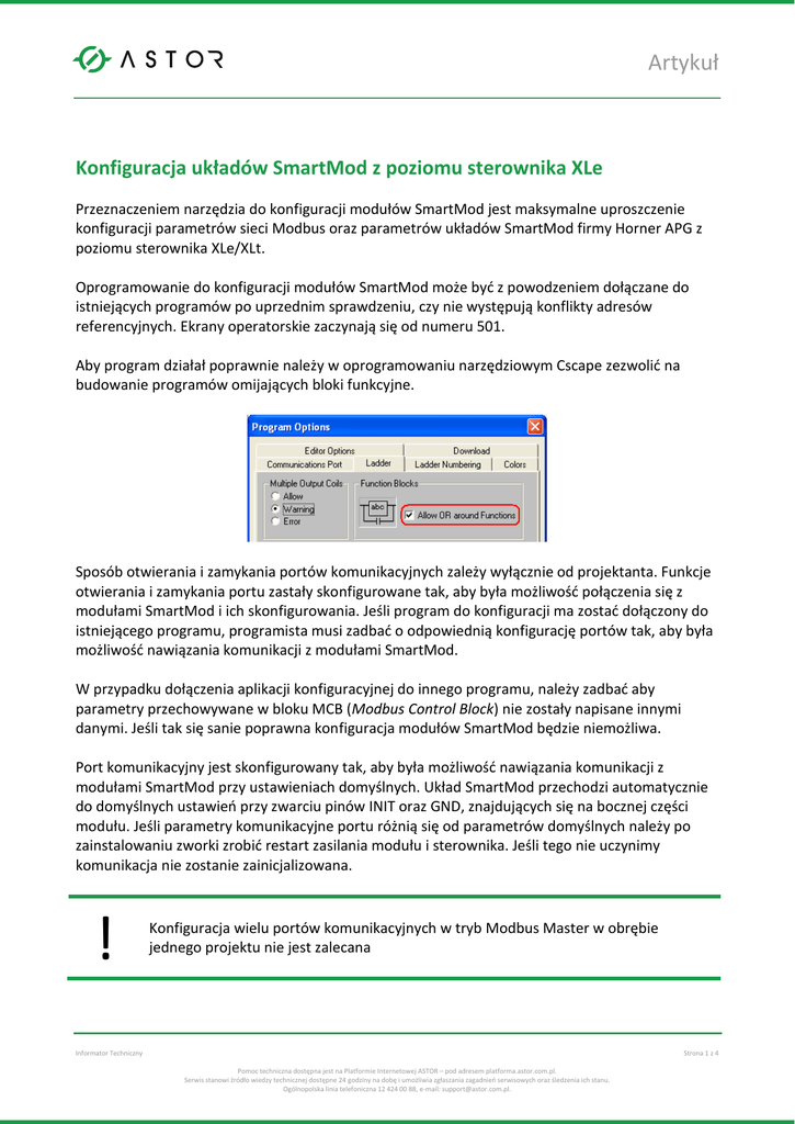 Artykuł Konfiguracja układów SmartMod z poziomu sterownika XLe Przeznaczeniem narzędzia do konfiguracji modułów SmartMod jest maksymalne uproszczenie konfiguracji parametrów sieci Modbus oraz parametrów układów SmartMod firmy Horner APG z poziomu sterownika XLe/XLt. Oprogramowanie do konfiguracji modułów SmartMod może być z powodzeniem dołączane do istniejących programów po uprzednim sprawdzeniu, czy nie występują konflikty adresów referencyjnych. Ekrany operatorskie zaczynają się od numeru 501. Aby program działał poprawnie należy w oprogramowaniu narzędziowym Cscape zezwolić na budowanie programów omijających bloki funkcyjne. Sposób otwierania i zamykania portów komunikacyjnych zależy wyłącznie od projektanta. Funkcje otwierania i zamykania portu zastały skonfigurowane tak, aby była możliwość połączenia się z modułami SmartMod i ich skonfigurowania. Jeśli program do konfiguracji ma zostać dołączony do istniejącego programu, programista musi zadbać o odpowiednią konfigurację portów tak, aby była możliwość nawiązania komunikacji z modułami SmartMod. W przypadku dołączenia aplikacji konfiguracyjnej do innego programu, należy zadbać aby parametry przechowywane w bloku MCB (Modbus Control Block) nie zostały napisane innymi danymi. Jeśli tak się sanie poprawna konfiguracja modułów SmartMod będzie niemożliwa. Port komunikacyjny jest skonfigurowany tak, aby była możliwość nawiązania komunikacji z modułami SmartMod przy ustawieniach domyślnych. Układ SmartMod przechodzi automatycznie do domyślnych ustawień przy zwarciu pinów INIT oraz GND, znajdujących się na bocznej części modułu. Jeśli parametry komunikacyjne portu różnią się od parametrów domyślnych należy po zainstalowaniu zworki zrobić restart zasilania modułu i sterownika. Jeśli tego nie uczynimy komunikacja nie zostanie zainicjalizowana. ! Konfiguracja wielu portów komunikacyjnych w tryb Modbus Master w obrębie jednego projektu nie jest zalecana Informator Techniczny Strona 1 z 4 Pomoc techniczna dostępna jest na Platformie Internetowej ASTOR – pod adresem platforma.astor.com.pl. Serwis stanowi źródło wiedzy technicznej dostępne 24 godziny na dobę i umożliwia zgłaszania zagadnień serwisowych oraz śledzenia ich stanu. Ogólnopolska linia telefoniczna 12 424 00 88, e-mail: [email protected]. Artykuł Połączenie Komunikacja sterowników XLe z modułami SmartMod wykorzystuje dwuprzewodowy standard RS485. Konfiguracja XLe dla przykładu do komunikacji w standardzie RS485 wymaga wprowadzenia pewnych zmian w ustawieniach systemowych. Aby port szeregowy pracował poprawnie należy ustawić polaryzację wstępną (bias). W celu wejścia do ustawień systemowych naciskamy jednocześnie klawisze ↑↓. Do poruszania się po menu wykorzystywane są klawisze kierunkowe. Naciśnięcie klawisz ESC powoduje wyjście z menu systemowego. Konfiguracja portu MJ2 do pracy w trybie RS485. W menu systemowym przechodzimy do Set Serial Port i parametr MJ2 R485 Bias ustawiamy na Yes. Ustawienie port szeregowego dokonywane jest z poziomu zakładki Set Serial Ports menu systemowego. Jeśli w sterowniku nie zainstalowano modułu do sieci Ethernet (HEXECA) lub do komunikacji modemowej parametr Deft Pgm Port ustawiamy jako MJ1-232. Deft Pgm Port: MJ1-232 = port MJ1 RS232 jest domyślnym portem do programowania Enet = port Ethernet jest domyślnym portem do programowania Modem = port Modemowy jest domyślnym portem do programowania MJ1 RS485 Bias No = rezystor wstępnej polaryzacji portu MJ1 RS485 jest odłączony Yes = rezystor wstępnej polaryzacji portu MJ1 RS485 jest podłączony MJ2 RS485 Bias No = rezystor wstępnej polaryzacji portu MJ2 RS485 jest odłączony Yes = rezystor wstępnej polaryzacji portu MJ2 RS485 jest podłączony Set Ethernet (Enet) = naciśnij Enter w celu konfiguracji modułu Informator Techniczny Strona 2 z 4 Pomoc techniczna dostępna jest na Platformie Internetowej ASTOR – pod adresem platforma.astor.com.pl. Serwis stanowi źródło wiedzy technicznej dostępne 24 godziny na dobę i umożliwia zgłaszania zagadnień serwisowych oraz śledzenia ich stanu. Ogólnopolska linia telefoniczna 12 424 00 88, e-mail: [email protected]. Artykuł Kabel komunikacyjny Porty MJ1 i MJ2 w sterowniku XLe wyglądają tak samo, ale różnią się oznaczeniem pinów oraz funkcjonalnością, dlatego kabel należy wykonać zgodnie z jego przeznaczeniem. Końce kable komunik acyjnego powinny być zaopatrzone w rezystor terminujący o impedancji 120Ω, ¼ W pomiędzy pinami D- i D+. Terminacja końca linii po stronie XLe może zostać dokonana przy pomocy zewnętrznych zworek instalowanych w odpowiednich miejscach na bocznej ściance modułu. Ustawienie zewnętrznych zworek terminujących w sterowniku XLe (Port RS485) Zasilenie sterownika i układu SmartMod Jeśli program do konfiguracji układów SmartMod został prawidłowo przesłany do kontrolera, podłączono poprawnie wykonany kabel komunikacyjny oraz zainstalowano zworkę pomiędzy pinami GND oraz INIT po restarcie zasilania na sterowniku powinien pojawić się następujący ekran: Informator Techniczny Strona 3 z 4 Pomoc techniczna dostępna jest na Platformie Internetowej ASTOR – pod adresem platforma.astor.com.pl. Serwis stanowi źródło wiedzy technicznej dostępne 24 godziny na dobę i umożliwia zgłaszania zagadnień serwisowych oraz śledzenia ich stanu. Ogólnopolska linia telefoniczna 12 424 00 88, e-mail: [email protected]. Artykuł Należy nacisnąć klawisz Init Default Setup Po kilku sekundach sterownik automatycznie rozpozna podłączony do niego moduł SmatrMod i umożliwi jego konfigurację. Od tego momentu ustawienie parametrów komunikacyjnych oraz konfiguracja modułu SmartMod może być realizowana z poziomu sterownika XLe. Należy pamiętać o zapisaniu zmian po wprowadzeniu odpowiednich modyfikacji ustawień. Informator Techniczny Strona 4 z 4 Pomoc techniczna dostępn