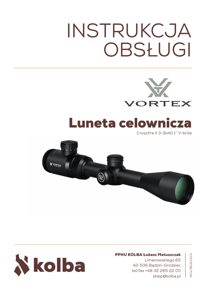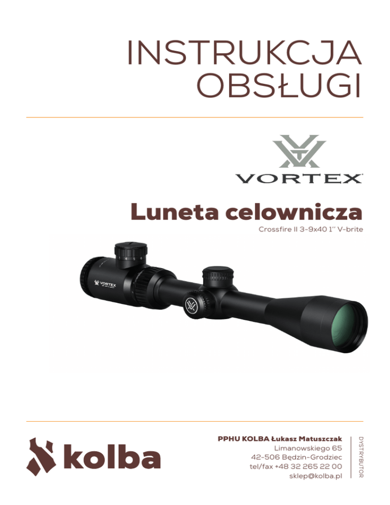 INSTRUKCJA OBSŁUGI Luneta celownicza Crossfire II 39x40 1’’ Vbrite DYSTRYBUTOR PPHU KOLBA Łukasz Matuszczak Limanowskiego 65 42506 BędzinGrodziec tel/fax +48 32 265 22 00 [email protected] 2 I regulowanie lunety Ustawienie ostrości krzyża Lunety Vortex posiadają pierścień do szybkiej regulacji ostrości krzyża. W pierwszej kolejności należy spojrzeć gołym okiem na cel, znajdujący się w oddali. Następnie należy skierować lune tę w stronę nieba i na bardzo krótką chwilę spojrzeć w okular lunety. Nie należy kierować lune ty bezpośrednio w stronę słońca. Zwróć uwagę na ostrość krzyża i dostosuj pierścień okularu do momentu, aż obraz będzie w pełni satysfakcjonujący. Krzyż powinien być wyraźny i ostry, za każdym razem. Regulacja pozioma i pionowa Lunety Vortex posiadają wieżyczki do regulacji poziomej i pionowej. W celu regulacji należy w pierwszej kolejności zdjąć osłony wieżyczek. Następnie należy przekręcić każdą z wieżyczek na żądaną pozycję w celu regulacji. II Montaż lunety W przypadku braku doświadczenia w montażu lunety zaleca się skorzystanie z usług specjalisty. Nie należy regulować położenia krzyża przed zamontowaniem lunety. W przypadku regulacji pio nowej lub poziomej przed montażem lunety na broni należy podjąć następujące kroki: Obrócić pokrętło regulacji pionowej lub poziomej w jedną stronę do końca. Obrócić pokrętło w odwrotną stronę do końca, licząc kliknięcia. Obróć pokrętło w odwrotną stronę, zatrzymując się w połowie kliknięć. Należy powtórzyć całą procedurę dla drugiego pokrętła. Lunetę należy zamontować jak najniżej na broni. Należy ustawić możliwie największą odległość od oka. Ustaw powiększenie na najmniejsze i przesuń lunetę jak najbardziej do przodu. Ustawiając się w pozycji do strzału, spojrzyj w okular i przesuń lunetę w swoim kierunku. Kiedy tylko zobaczysz pełne pole widzenia, zatrzymaj się. Powoli obróć lunetę, aż regulacja pionowa będzie na górze, a poziome ramiona krzyża są w linii z poziomą osią broni. Dokręć śruby montażu. III Wyzerowanie wieżyczek Odkręć pokrywę, a następnie odkręć śrubę wewnętrzną, jednocześnie przytrzymując srebrną ściankę wieżyczki tak, aby się nie obróciła. Po odkręceniu śruby, unieś srebrną część wieżyczki i zdejmij ją, ponownie starając się unik nięcia obrotu. Nałóż wieżyczkę tak, aby „0” było w jednej linii z pionową kreską. Nałóż śrubę i delikatnie ją do kręć, przytrzymując srebrną część wieżyczki, unikając obrotu. Nałóż pokrywę i dokręć ją. IV Konserwacja Lunety Vortex wymagają jedynie podstawowych czynności konserwacyjnych, takich jak czysz czenie zewnętrznych powierzchni soczewek. Wszystkie części są odpowiednio nasmarowane i nie ma potrzeby stosowania żadnych środków smarujących. 3 V Czyszczenie soczewek Do czyszczenia soczewek zalecane jest używanie takich produktów, jak Vortex Lens Pen lub ze staw Fog Free, które są przeznaczone do soczewek powlekanych. Przed wytarciem szklanych powierzchni należy usunąć z nich kurz lub pył. VI Czyszczenie obudowy Obudowę należy czyścić z użyciem delikatnej, miękkiej szmatki dołączonej do lunety. Należy unikać przechowywania lunety w nasłonecznionych miejscach lub takich, w których jest bardzo wysoka temperatura, jako że może ona uszkodzić znajdujący się wewnątrz środek smarujący. pierścień boczny do ustawieni paralaksy (tylko dla modeli pa) okular regulacja pozioma obiektyw regulacja pionowa pierścień boczny do ustawieni paralaksy (tylko dla modeli pa) powiększenie regulacja dioptrii 4 KARTA GWARANCYJNA Nazwa towaru Typ Luneta celownicza Crossfire II Numer fabryczny Data sprzedaży Pieczątka i podpis punktu sprzedaży Data przyjęcia Data wydania Opis usterki Pieczęć serwisu 5 PRAWO DO REKLAMACJI ORAZ WARUNKI GWARANCJI 1. PPHU Kolba Łukasz Matuszczak z siedzibą w Będzinie ponosi odpowiedzialność w okresie 24 miesięcy od daty sprzedaży w myśl ustawy z dnia 27 lipca 2002 roku o szczególnych wa runkach sprzedaży konsumenckiej. 2. Producent, firma Vortex, udziela wieczystej gwarancji na produkt, w ramach poniższych warunków: • firma Vortex zobowiązuje się do naprawy lub wymiany produktu na nowy, jeżeli ulegnie on uszkodzeniu lub będzie miał wadę fabryczną, na własny koszt • prawo do gwarancji przechodzi na kolejnych właścicieli produktu • nie ma potrzeby przedstawienia karty gwarancyjnej • nie ma potrzeby posiadania dowodu zakupu • gwarancja nie obejmuje zgubienia, kradzieży lub celowego uszkodzenia • uszkodzeń kosmetycznych nie mających wpływu na działanie produktu OŚWIADCZAM, ŻE ZAPOZNAŁEM SIĘ I AKCEPTUJĘ WARUNKI NINIEJSZEJ GWARANCJI PODPIS I DATA ___________________________________________ PUNKT SERWISU GWARANCYJNEGO PPHU Kolba Matuszczak Łukasz ul. Limanowskiego 65; 42-506 Będzin-Grodziec tel/fax 32 265 22 00 wew. 24 www.kolba.pl [email protected] 6 NOTATKI 7 NOTATKI DYSTRYBUTOR PPHU KOLBA Łukasz Matuszczak Limanowskiego 65 42-506 Będzin-Grodziec tel/fax +48 32 265 22 00 [email protected]