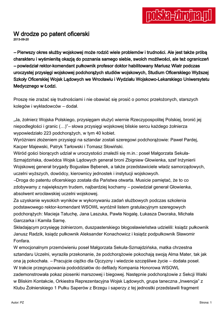 W drodze po patent oficerski 2013-09-20 – Pierwszy okres służby wojskowej może rodzić wiele problemów i trudności. Ale jest także próbą charakteru i wyśmienitą okazją do poznania samego siebie, swoich możliwości, ale też ograniczeń – powiedział rektor-komendant pułkownik profesor doktor habilitowany Mariusz Wiatr podczas uroczystej przysięgi wojskowej podchorążych studiów wojskowych, Studium Oficerskiego Wyższej Szkoły Oficerskiej Wojsk Lądowych we Wrocławiu i Wydziału Wojskowo-Lekarskiego Uniwersytetu Medycznego w Łodzi. Proszę nie zrażać się trudnościami i nie obawiać się prosić o pomoc przełożonych, starszych kolegów i wykładowców – dodał. „Ja, żołnierz Wojska Polskiego, przysięgam służyć wiernie Rzeczypospolitej Polskiej, bronić jej niepodległości i granic (…)”– słowa przysięgi wojskowej bliskie sercu każdego żołnierza wypowiedziało 223 podchorążych, w tym 40 kobiet. Wyróżnieni złożeniem przysięgi na sztandar zostali szeregowi podchorążowie: Paweł Pardej, Kacper Majewski, Patryk Tarłowski i Tomasz Słowiński. Wśród gości biorących udział w uroczystości znaleźli się m.in.: poseł Małgorzata SekułaSzmajdzińska, dowódca Wojsk Lądowych generał broni Zbigniew Głowienka, szef Inżynierii Wojskowej generał brygady Bogusław Bębenek, a także przedstawiciele władz samorządowych, uczelni wyższych, dowódcy, kierownicy jednostek i instytucji wojskowych. –Droga do patentu oficerskiego została dla Państwa otwarta. Musicie pamiętać, że to co zdobywamy z największym trudem, najbardziej kochamy – powiedział generał Głowienka, absolwent wrocławskiej uczelni wojskowej. Za uzyskanie wysokich wyników w wykonywaniu zadań służbowych podczas szkolenia podstawowego rektor-komendant WSOWL wyróżnił listem gratulacyjnym szeregowych podchorążych: Macieja Tatuchę, Jana Laszuka, Pawła Nogalę, Łukasza Dworaka, Michała Garczarka i Kamila Sarnę. Składającym przysięgę żołnierzom, duszpasterskiego błogosławieństwa udzielili: ksiądz pułkownik Janusz Radzik, ksiądz pułkownik Aleksander Konachowicz i ksiądz podpułkownik Sławomir Fonfara. W emocjonalnym przemówieniu poseł Małgorzata Sekuła-Szmajdzińska, matka chrzestna sztandaru Uczelni, wyraziła przekonanie, że podchorążowie pokochają swoją Alma Mater, tak jak ona ją pokochała. – Pracujcie ciężko dla Ojczyzny i wiedzcie szczęśliwe życie – dodała poseł. W trakcie przegrupowania pododdziałów do defilady Kompania Honorowa WSOWL zademonstrowała pokaz piosenki marszowej i biegowej. Następnie podchorążowie z Sekcji Walki w Bliskim Kontakcie, Orkiestra Reprezentacyjna Wojsk Lądowych, grupa taneczna „Inwencja” z Klubu Żołnierskiego 1 Pułku Saperów z Brzegu i saperzy z tej jednostki przedstawili fragment Autor: PZ Strona: 1 pokazu, który promował Wojska Lądowe podczas tegorocznego Festiwalu Orkiestr Wojskowych Wojska Polskiego. Licznie przybyłe tego dnia do Uczelni rodziny nowo zaprzysiężonych żołnierzy mogły podziwiać swoich najbliższych podczas defilady pododdziałów kończącej uroczystość. Po ceremonii podchorążowie otrzymali pierwsze przepustki. Źródło: mjr Piotr Szczepański Autor: PZ Strona: 2