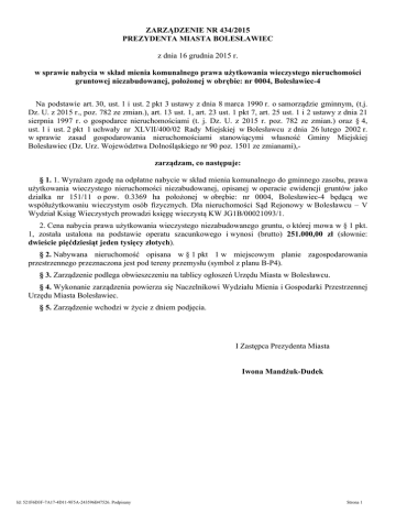 ZARZĄDZENIE NR 434/2015 PREZYDENTA MIASTA BOLESŁAWIEC z dnia 16 grudnia 2015 r. w sprawie nabycia w skład mienia komunalnego prawa użytkowania wieczystego nieruchomości gruntowej niezabudowanej, położonej w obrębie: nr 0004, Bolesławiec-4 Na podstawie art. 30, ust. 1 i ust. 2 pkt 3 ustawy z dnia 8 marca 1990 r. o samorządzie gminnym, (t.j. Dz. U. z 2015 r., poz. 782 ze zmian.), art. 13 ust. 1, art. 23 ust. 1 pkt 7, art. 25 ust. 1 i 2 ustawy z dnia 21 sierpnia 1997 r. o gospodarce nieruchomościami (t. j. Dz. U. z 2015 r. poz. 782 ze zmian.) oraz § 4, ust. 1 i ust. 2 pkt 1 uchwały nr XLVII/400/02 Rady Miejskiej w Bolesławcu z dnia 26 lutego 2002 r. w sprawie zasad gospodarowania nieruchomościami stanowiącymi własność Gminy Miejskiej Bolesławiec (Dz. Urz. Województwa Dolnośląskiego nr 90 poz. 1501 ze zmianami),zarządzam, co następuje: § 1. 1. Wyrażam zgodę na odpłatne nabycie w skład mienia komunalnego do gminnego zasobu, prawa użytkowania wieczystego nieruchomości niezabudowanej, opisanej w operacie ewidencji gruntów jako działka nr 151/11 o pow. 0.3369 ha położonej w obrębie: nr 0004, Bolesławiec-4 będącą we współużytkowaniu wieczystym osób fizycznych. Dla nieruchomości Sąd Rejonowy w Bolesławcu – V Wydział Ksiąg Wieczystych prowadzi księgę wieczystą KW JG1B/00021093/1. 2. Cena nabycia prawa użytkowania wieczystego niezabudowanego gruntu, o której mowa w § 1 pkt. 1, została ustalona na podstawie operatu szacunkowego i wynosi (brutto) 251.000,00 zł (słownie: dwieście pięćdziesiąt jeden tysięcy złotych). § 2. Nabywana nieruchomość opisana w § 1 pkt 1 w miejscowym planie zagospodarowania przestrzennego przeznaczona jest pod tereny przemysłu (symbol z planu B-P4). § 3. Zarządzenie podlega obwieszczeniu na tablicy ogłoszeń Urzędu Miasta w Bolesławcu. § 4. Wykonanie zarządzenia powierza się Naczelnikowi Wydziału Mienia i Gospodarki Przestrzennej Urzędu Miasta Bolesławiec. § 5. Zarządzenie wchodzi w życie z dniem podjęcia. I Zastępca Prezydenta Miasta Iwona Mandżuk-Dudek Id: 521F6D3F-7A17-4D11-9F5A-243596B47526. Podpisany Strona 1 Załącznik nr 1 do zarządzenia Prezydenta Miasta Bolesławiec Nr …../15 z dnia …………………………… 2015 r. Id: 521F6D3F-7A17-4D11-9F5A-243596B47526. Podpisany Strona 2 Uzasadnienie W wyniku rozstrzygniętego przetargu na oddanie nieruchomości w użytkowanie wieczyste aktem notarialnym nr Rep "A"2470/2008 z dnia 26 lutego 2008 r. nieruchomość oddano w użytkowanie wieczyste obecnym współużytkownikom wieczystym. Terminy zabudowy działki były kilkakrotnie przedłużane. Obecnie terminy zostały określone następująco: rozpoczęcie budowy 01.07.2015 r., zakończenie budowy 31.12.2016 r. Od chwili ustanowienia użytkowania wieczystego nieruchomość w 2008 r., kiedy na rynku nieruchomości panował „boom inwestycyjny", sytuacja na rynku nieruchomości uległa znacznemu pogorszeniu. Mimo przygotowanego projektu architektonicznego oraz pozwolenia na budowę, do dnia dzisiejszego współużytkownikom wieczystym ze względów ekonomicznych (wysokie opłaty roczne) nie udało się pozyskać operatora tj. podmiotu zainteresowanego prowadzeniem centrum handlowo-usługowego. Nabycie do zasobu mienia komunalnego prawa użytkowania wieczystego działki nr 151/11 położonej przy ul. S. Staszica w Bolesławcu, pozwoli Gminie Miejskiej Bolesławiec ponownie zaoferować nieruchomość innym podmiotom do sprzedaży na własność w drodze przetargu nieograniczonego, co z kolei stworzy możliwość społecznie oczekiwanej zabudowy tego terenu i przyczyni się do dalszego rozwoju miasta. Gmina Miejska w okresie trwania użytkowania wieczystego uzyskała korzyść netto kilkakrotnie przewyższającą nakłady ponoszone na nabycie nieruchomości do zasobu nieruchomości gminnych. Z tych względów odpłatne nabycie od dotychczasowych współużytkowników wieczystych jest ekonomicznie uzasadnione. JP/JP I Zastępca Prezydenta Miasta Iwona Mandżuk-Dudek Id: 521F6D3F-7A17-4D11-9F5A-243596B47526. Podpisany Strona 1