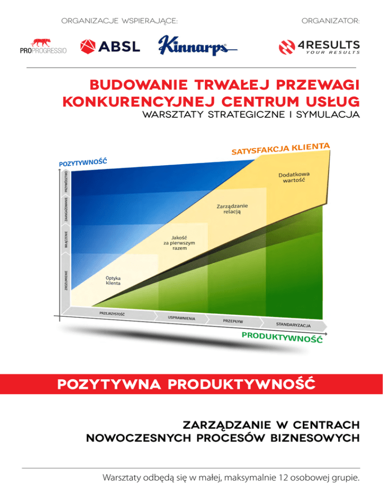 Organizacje wspierające: Organizator: Budowanie trwałej przewagi konkurencyjnej Centrum Usług Warsztaty strategiczne i symulacja POZYTYWNA PRODUKTYWNOŚĆ Zarządzanie w centrach nowoczesnych procesów biznesowych Warsztaty odbędą się w małej, maksymalnie 12 osobowej grupie. Jaką przyjąć strategię optymalizacji? Warsztaty strategiczne i symulacja • • • • • • Na czym to polega? Jaki jest potencjał wzrostu? – wykorzystanie narzędzia Optimization Opportunity Gap Rozwiązanie dylematu: rekrutować czy optymalizować ? Obsługa portfelowa czy procesowa? Jak zarządzać zmianą i zaangażować pracowników? Jak łączyć narzędzia i podejście: Lean, Six Sigma, Performance Management i BPM? Skuteczna strategia a Pozytywność i Produktywność? Dlaczego powinieneś tu być? • • • • • Na warsztatach staniesz się pracownikiem centrum operacyjnego. W trakcie kolejnych etapów symulacji będziesz odkrywał i wdrażał w działaniu narzędzia i zasady umożliwiające wzrost efektywności i budowanie zaangażowania pracowników. Kolejne rundy przeplatane są dającymi wiedzę i inspiracje modułami warsztatów. Elementem spotkania jest też prezentacja wyników i case study z praktycznych wdrożeń. Poznasz praktyczną stronę narzędzi optymalizacyjnych, analitycznych i zarządczych Doświadczysz korzyści z metodyki lean six sigma w procesach usługowych Dostrzeżesz nowe możliwości rozwoju i stymulowania zaangażowania pracowników Odkryjesz nowy potencjał twojej organizacji Zyskasz inspirację do stworzenia i wdrożenia planu usprawnienia biznesu Czego doświadczysz? POZNASZ SPOSOBY IDENTYFIKOWANIA MARNOTRAWSTWA ORAZ ELIMINOWANIA STRAT W ORGANIZACJI. ZOBACZYSZ, ŻE USPRAWNIANIE BIZNESU TO PROCES, POZNASZ NARZĘDZIA STANDARYZACJI I DYSTRYBUCJI PRACY, wdrażanie kolejnych narzędzi zwiększa zyskowność i poprawia inne kluczowe wskaźniki biznesowe. dzięki którym udaje się systematycznie poprawiać efektywność w organizacji. SPOTKANIE TO ŹRÓDŁO INSPIRACJI, Zobaczysz, że można wizualizować poziom produktywności, terminowości, jakości i zaangażowania pracowników, co otwiera drogę do skuteczniejszego zarządzania procesami. LACJI U M Y S A D I RUN Narzędzia, które poznasz: Opinie uczestników: • • • • • Określanie wartości dodanej Identyfikacja marnotrawstwa Mapa strumienia wartości (VSM) Tablice wizualizacyjne Raport A3 „Warsztaty przekroczyły moje oczekiwania w odniesieniu do metody w jakiej cele warsztatów zostały osiągnięte, jasnych i intuicyjnych materiałów, które zostały dostarczone, nowoczesnej technologii umożliwiającej optymalizację procesów, użytej podczas spotkania oraz zbudowania właściwej interakcji między uczestnikami. Dzięki udziałowi w warsztatach uświadomiłem sobie, jakie konkretne metody i narzędzia mogę stosować na co dzień, by podnosić produktywność w organizacji.” ANDREAS CIOSKA, HEAD OF EUROPE FINANCIAL SHARED SERVICE CENTERS MOTOROLA SOLUTIONS II RUNDA SYMULACJI • • • • Wyciąganie pracy Poziomowanie pracy Standaryzacja Zarządzanie portfelowe a zarządzanie procesowe pozwala poznać metody i potencjalne kierunki dalszej optymalizacji biznesu. CJ A L U M Y III RUNDA S I • Macierz kompetencji • Spotkania „szybki start” • Metoda TWI „Podobało mi się to że w przeciągu 1 dnia poznaliśmy ustrukturyzowaną metodę przekładania Lean, Six Sigma, BPM na prosty język łatwych do wdrożenia działań, które jednocześnie wpływają na rozwój pracowników i menedżerów oraz budują trwałe zaangażowanie w podnoszenie produktywności. Dotychczas mieliśmy poszczególne elementy, ale brakowało nam kompleksowego podejścia – przedstawiona metodologia pokazuje jasna ścieżkę dojścia do celu jakim jest zaangażowanie pracowników w ciągłe usprawnienie procesu i budowanie pozytywnej kultury organizacyjnej.” „Moim zadaniem warsztaty 4 Results są dobrą opcją zarówno dla tych, którzy właśnie szukają możliwości wynikających z praktycznego zastosowania Lean, jak i dla tych, którzy są zaawansowanymi praktykami. Pierwsza grupa pozna narzędzia i metody pracy, druga znajdzie inspirację do dalszego rozwoju Lean w ich organizacjach. Osobiście najwięcej skorzystałem ze zrozumienia wpływu jaki ma budowanie kultury Pozytywności na Produktywność i podkręcenie naszych kluczowych miar.” Ireneusz Truszkowski, General Manager, Metsa Global Financial Shared Services Dariusz Bazeli, General Manager Geoban Poland, część Santander Group Dodatkowe informacje: Ponad 300 przedstawicieli wyższej kadry zarządzającej uczestniczyło w warsztatach. Reprezentowali wiodące firmy z sektora nowoczesnych usług biznesowych, bankowości i ubezpieczeń oraz wsparcia biznesu. 100% uczestników kończy warsztaty z konkretnymi inspiracjami strategicznymi dotyczącymi potencjału poprawy efektywności oraz metod na osiągnięcie znaczących zmian w ich firmach. 90% to wynik Net Promoter Score po warsztatach – oznacza to, że wszyscy uczestnicy są zadowoleni z udziału w warsztacie i polecają ten program swoim kolegom i koleżankom na równorzędnych stanowiskach. Sprawdź na www.4results.pl/warsztaty-opinie czy znajdziesz tam opinię swojego znajomego. Warsztaty poprowadzi: Krzysztof Pimpicki – Partner w zespole Services 4 Results. Absolwent SGH. Coach. Certyfikowany Doradca Business Process Modelling & Design. Praktyk Lean. Doświadczenie zdobywał jako kierownik projektów optymalizacyjnych w firmach z sektora nowoczesnych procesów biznesowych oraz jako konsultant w wiodących firmach doradczych. Specjalizuje się we wdrażaniu kompleksowych, systemowych rozwiązań ukierunkowanych na stworzenie środowiska ciągłego doskonalenia i podnoszenia efektywności operacyjnej. 4 RESULTS: Jesteśmy partnerem w podnoszeniu efektywności operacyjnej firm usługowych. Wdrażamy rozwiązania gwarantujące szybkie i trwałe rezultaty zmian optymalizacyjnych. An