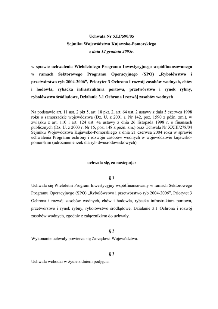Uchwała Nr XLI/590/05 Sejmiku Województwa Kujawsko-Pomorskiego z dnia 12 grudnia 2005r. w sprawie uchwalenia Wieloletniego Programu Inwestycyjnego współfinansowanego w ramach Sektorowego Programu Operacyjnego (SPO) „Rybołówstwo i przetwórstwo ryb 2004-2006”, Priorytet 3 Ochrona i rozwój zasobów wodnych, chów i hodowla, rybacka infrastruktura portowa, przetwórstwo i rynek rybny, rybołówstwo śródlądowe, Działanie 3.1 Ochrona i rozwój zasobów wodnych Na podstawie art. 11 ust. 2 pkt 5, art. 18 pkt. 2, art. 64 ust. 2 ustawy z dnia 5 czerwca 1998 roku o samorządzie województwa (Dz. U. z 2001 r. Nr 142, poz. 1590 z późn. zm.), w związku z art. 110 i art. 124 ust. 4a ustawy z dnia 26 listopada 1998 r. o finansach publicznych (Dz. U. z 2003 r. Nr 15, poz. 148 z późn. zm.) oraz Uchwała Nr XXIII/278/04 Sejmiku Województwa Kujawsko-Pomorskiego z dnia 21 czerwca 2004 roku w sprawie uchwalenia Programu ochrony i rozwoju zasobów wodnych w województwie kujawskopomorskim (udrożnienie rzek dla ryb dwuśrodowiskowych) uchwala się, co następuje: §1 Uchwala się Wieloletni Program Inwestycyjny współfinansowany w ramach Sektorowego Programu Operacyjnego (SPO) „Rybołówstwo i przetwórstwo ryb 2004-2006”, Priorytet 3 Ochrona i rozwój zasobów wodnych, chów i hodowla, rybacka infrastruktura portowa, przetwórstwo i rynek rybny, rybołówstwo śródlądowe, Działanie 3.1 Ochrona i rozwój zasobów wodnych, zgodnie z załącznikiem do uchwały. §2 Wykonanie uchwały powierza się Zarządowi Województwa. §3 Uchwała wchodzi w życie z dniem podjęcia. UZASADNIENIE Zgodnie z art. 11 ust. 2 pkt. 5 ustawy z dnia 5 czerwca 1998 roku o samorządzie województwa (tekst jednolity Dz. U. z 2001 r., Nr 142, poz. 1590 z późn. zm.) samorząd województwa prowadzi politykę rozwoju województwa, na którą składa się m.in. racjonalne korzystanie z zasobów przyrody oraz kształtowanie środowiska naturalnego, zgodnie z zasadą zrównoważonego rozwoju. Mając na uwadze powyższe Sejmik Województwa Kujawsko-Pomorskiego Uchwałą Nr XXIII/278/04 z dnia 21 czerwca 2004 roku uchwalił „Program ochrony i rozwoju zasobów wodnych w województwie kujawsko-pomorskim (udrożnienie rzek dla ryb dwuśrodowiskowych)”. Przedmiotowy Program zawiera działania związane z budową umożliwiającą wędrówkę ryb dwuśrodowiskowych. Minister Rolnictwa i Rozwoju Wsi wyraził pozytywną opinię stwierdzającą wspólny interes użytkowników wód w przypadku realizacji projektów dotyczących budowy urządzeń umożliwiających wędrówkę ryb dwuśrodowiskowych dla następujących zadań: • Przepławka dla ryb dwuśrodowiskowych z uwzględnieniem istniejących budowli na rzece Tążynie w miejscowości Otłoczyn, • Przepławka dla ryb dwuśrodowiskowych na rzece Zielona Struga w miejscowości Dybowo, • Przepławka dla ryb dwuśrodowiskowych na rzece Osie w miejscowości Mokre, • Przepławka dla ryb dwuśrodowiskowych przez stopień wodny w miejscowości Tama Brodzka na rzece Skarlance, W celu przystąpienia do realizacji zatwierdzonego przez Sejmik Województwa programu konieczne jest przyjęcie przez organ stanowiący samorządu województwa wieloletniego programu inwestycyjnego współfinansowanego ze środków funduszy strukturalnych w ramach SPO, którego projekt jest załącznikiem do niniejszej uchwały. W programie tym wskazano zadania inwestycyjne, zaplanowane przez jednostkę budżetową samorządu województwa kujawsko-pomorskiego w latach 2004-2006 finansowane w ramach SPO. W ramach Sektorowego Programu Operacyjnego Samorząd Województwa i jednostki organizacyjne im podległe, regionalne zarządy gospodarki wodnej, jednostki organizacyjne nie posiadające osobowości prawnej, osoby prawne i fizyczne uprawnione są do otrzymania środków finansowych z funduszy strukturalnych (SPO) „Rybołówstwo i przetwórstwo ryb 2004-2006”, Priorytet 3 Ochrona i rozwój zasobów wodnych, chów i hodowla, rybacka infrastruktura portowa, przetwórstwo i rynek rybny, rybołówstwo śródlądowe, Działanie 3.1 Ochrona i rozwój zasobów wodnych. W celu otrzymania pomocy w ramach SPO istnieje konieczność przedstawienia dokumentów formalnie zatwierdzających budżet województwa z uwzględnieniem przedmiotowych inwestycji. Dla inwestycji tak jak w tym określonym przypadku, które rozpoczną się w roku 2006 niezbędne jest utworzenie ”Wieloletniego programu inwestycyjnego”, który zostanie zatwierdzony przez Sejmik Województwa. Pomoc w ramach SPO „Rybołówstwo i przetwórstwo ryb 2004-2006” może być udzielona na realizację projektów z zakresu adaptacji, remontu, wymiany, naprawy lub technicznego wyposażenia urządzenia lub zespołu urządzeń umożliwiających wędrówkę ryb dwuśrodowiskowych, dokonane w celu poprawy efektywności ich działania lub poprawy bezpieczeństwa wędrówki ryb dwuśrodowiskowych. Wnioski aplikacyjne tych projektów składane są we właściwych oddziałach Agencji Restrukturyzacji i Modernizacji Rolnictwa. Następnie wniosek podlega weryfikacji wstępnej, formalnej i zgodności z SPO oraz ocenie merytorycznej przez Instytucje Wdrażającą. Pomoc otrzymana w ramach SPO polega na refundacji 100 % kosztów kwalifikowalnych zgodnie z wytycznymi Programowymi. Istnieje konieczność zabezpieczenia środków własnych w inwestycyjnego. budżecie województwa wynikających z wieloletniego programu