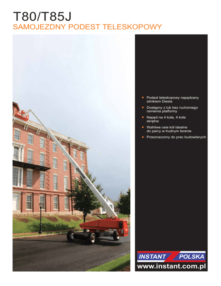 T80/T85J SAMOJEZDNY PODEST TELESKOPOWY • Podest teleskopowy napędzany silnikiem Diesla • Dostępny z lub bez ruchomego ramienia platformy • Napęd na 4 koła, 4 koła skrętne • Wahliwe osie kół idealne do parcy w trudnym terenie • Przeznaczony do prac budowlanych www.instant.com.pl T80/T85J SAMOJEZDNY PODEST TELESKOPOWY WYMIARY T80 T85J Max. wysokość robocza 26.4m 27.9m Max. wysokość platformy 24.4m 25.9m Max. zasięg pracy 21.7m Wymiar platformy 0.76m x 2.44m Szerokość (A) 2.6m 2.6m Długość (B) 11.8m 12.9m Wysokość transportowa (C) 2.9m 2.9m Prześwit podwozia 23.4m A 0.76m x 2.44m 330mm 330mm Udźwig platformy (SWL) 227kg 227kg Max. wysokość podczas jazdy 24.4m 25.9m Max. prędkość jazdy (złożony) 4.8km/h 4.8km/h Max. prędkość jazdy (rozłożony) 1.0km/h 1.0km/h Długość wysięgnika n/a C DANE TECHNICZNE B 1.8m Zakres pracy wysięgnika n/a 140º Zakres pracy platformy 165º 170º Max. obrót bazy (z kontynuacją) 360º Czas podnoszenia/opuszczania 360º 195/175 s Zdolność pokonywania wzniesień Wewnętrzny promień skrętu Opony 230/210 s 30% 30% 2.4m 2.4m 15 x 625 loader lug poly filled Sterowanie proporcjonalne Napęd WYPOSAŻENIE STANDARDOWE • • • • • • • • • • Ruchomy wysięgnik 1.8m, 140º (tylko model T85J) Hydrauliczny obrót platformy Napęd na 4 koła 4 koła skrętne Proporcjonalne sterowanie Opony wypełnione (poly filled) Możliwośc jazdy przy pełnym rozłożeniu Sygnał dźwiękowy Przewody elekt. doprowadzone do platformy (bez gniazd) CE na 4 koła OPCJE ZASILANIE Zailanie chłodzony powietrzem silnik Diesla Deutz F4L-2011, 64hp WAGA Waga 16,480kg 17,100kg CHARAKTERYSTYKA PRACY 2 4 6 Generator hydrauliczny Zabezpieczenie panelu sterującego Dwie lampy na platformie Instalacja pneumatyczna Światło ostrzegawcze Obrotowe wejścia na platformę Zabezpieczenie przed piaskowaniem Światła drogowe Zestaw chroniący przed zimnem Zestaw do podgrzewania układu hydraulicznego Alarm ruchu Pakiet holowniczy 30 28 26 24 22 20 18 16 14 12 10 8 6 4 2 0 2 4 6 8 10 12 14 16 18 20 22 24 26 28 30 metr 30 28 26 24 22 20 18 16 14 12 10 8 6 4 2 0 • • • • • • • • • • • • Specyfikacja może ulec zmianie. Zdjęcia oraz dane techniczne w broszurze utworzone zostały w celach poglądowych. Szczegółowe parametry znajdują się w instrukcji obsługi poszczególnych maszyn.