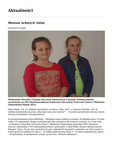 Aktualności Słowem uchwycić świat 05/05/2014, dodał: Młodziutkie literatki z Zespołu Placówek Oświatowych w Kasinie Wielkiej zdobyły wyróżnienia na XXX Międzynarodowym Konkursie Literackiej Twórczości Dzieci i Młodzieży Gimnazjalnej Słupsk 2014. Edyta Ślaga z kl. 4 a zdobyła wyróżnienie za wiersz „Mały król” a Zuzanna Wątroba z kl. 4a zdobyła wyróżnienie za prozę „Dlaczego trawa jest zielona?”. Uczennice powtórzyły sukcesy swoich starszych koleżanek z lat poprzednich. Po przeprowadzeniu przez bibliotekę, szkolnego etapu konkursu wysłano do Słupska prace 10 osób z klas 1-6 i gimnazjum. Ranga wyróżnień jest tym ważniejsza dla naszych uczennic, że w tym roku na Konkurs Literackiej Twórczości Dzieci i Młodzieży Gimnazjalnej nadesłano 6547 zestawów wierszy i opowiadań z 453 szkół podstawowych i gimnazjów z całej Polski, Stanów Zjednoczonych, Niemiec, Litwy i Turcji. Jury spośród tych prac wyłoniło 81 laureatów, wyróżniło zaś 192 uczniów w trzech grupach wiekowych: klasy I – IV szkoły podstawowej, klasy V – VI szkoły podstawowej, klasy I – III gimnazjum, w kategoriach: poezja i proza oraz „Wiersze malowane”. Na uwagę zasługuje fakt, że prace oceniała Komisja Konkursowa na czele ze znaną i lubianą poetką Wandą Chotomską oraz literaturoznawcy, poeci, dziennikarze i poloniści. Nagrodzone i wyróżnione utwory literackie zostały opublikowane w książce pokonkursowej „Piórem poznaję siebie”. Organizatorzy konkursu z okazji XXX Jubileuszu dziękują uczestnikom konkursu, za to, że potrafią i pragną „piórem poznawać siebie”, że „kierują się sercem”, że piękna jest „ich miłość do babci, która jak plaster na skaleczenie” i mamy, która „roztrzaskane pozbiera, poskleja i jak puchar kolejny na półce zwycięstw ustawi w szeregu”, że widzą swój „czternastoletni brak umiaru” i „każdy dzień malują inną barwą”, że zadają sobie głębokie pytania „co zrobić z Jezusem, który nie ćpa i nie pali, lecz uzdrawia chorych”, że „idą z kluczem do wybranych drzwi” i pragną, „by los prowadził ich dobrymi drogami, z nadzieją, z uśmiechem na nowy dzień”. Podziwiamy Was, Młodzi Literaci, że w zmaganiach twórczych „wyrywacie się jak ptak do świata”, „zadajecie się z księżycem”, nie rezygnujecie z marzeń i pragniecie „wywołać u kogoś codziennie chociaż jeden szczery uśmiech”, że potraficie wyczarować „konfitury ze słońca”. Gratulujemy uczennicom talentu i zapału literackiego, życzymy dalszych sukcesów. Słowa uznania należą się również rodzicom, bo literatura dziecięca rozwija się zawsze tam, gdzie są wrażliwi na słowo dorośli. Wyniki dostępne są na stronie Gimnazjum Nr 2 w Słupsku www.gimnazjum2slupsk.edupage.org przeczytaj : "Mały Król", "DLACZEGO TRAWA JEST ZIELONA?" red. Teresa Kicmal