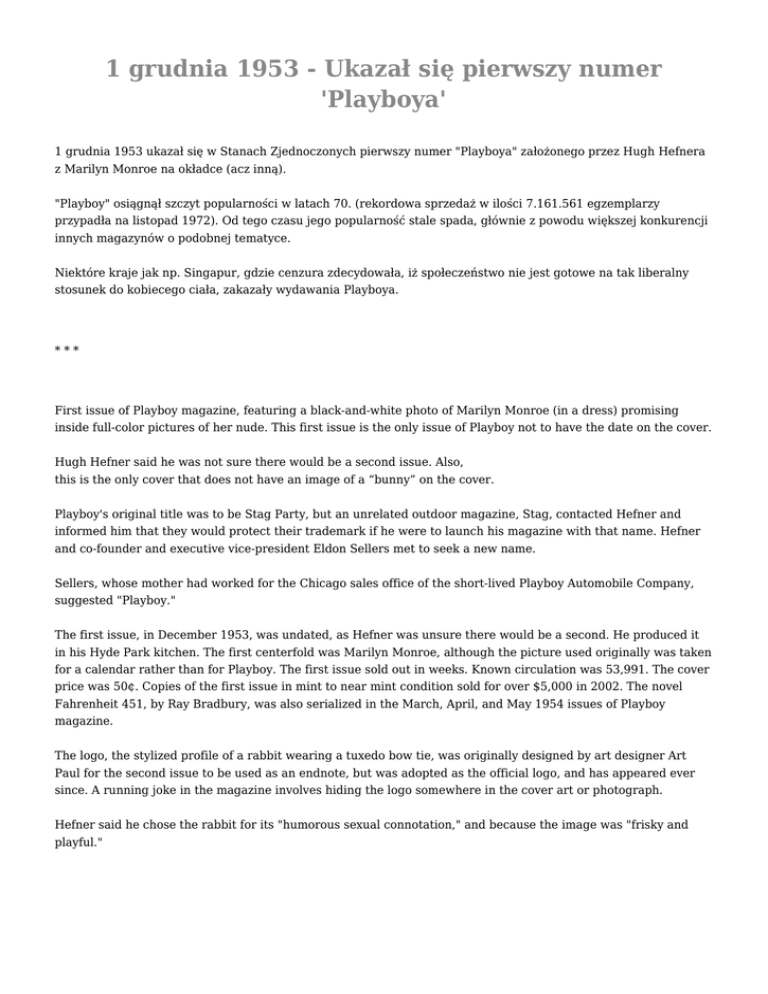 1 grudnia 1953 - Ukazał się pierwszy numer 'Playboya' 1 grudnia 1953 ukazał się w Stanach Zjednoczonych pierwszy numer "Playboya" założonego przez Hugh Hefnera z Marilyn Monroe na okładce (acz inną). "Playboy" osiągnął szczyt popularności w latach 70. (rekordowa sprzedaż w ilości 7.161.561 egzemplarzy przypadła na listopad 1972). Od tego czasu jego popularność stale spada, głównie z powodu większej konkurencji innych magazynów o podobnej tematyce. Niektóre kraje jak np. Singapur, gdzie cenzura zdecydowała, iż społeczeństwo nie jest gotowe na tak liberalny stosunek do kobiecego ciała, zakazały wydawania Playboya. *** First issue of Playboy magazine, featuring a black-and-white photo of Marilyn Monroe (in a dress) promising inside full-color pictures of her nude. This first issue is the only issue of Playboy not to have the date on the cover. Hugh Hefner said he was not sure there would be a second issue. Also, this is the only cover that does not have an image of a “bunny” on the cover. Playboy's original title was to be Stag Party, but an unrelated outdoor magazine, Stag, contacted Hefner and informed him that they would protect their trademark if he were to launch his magazine with that name. Hefner and co-founder and executive vice-president Eldon Sellers met to seek a new name. Sellers, whose mother had worked for the Chicago sales office of the short-lived Playboy Automobile Company, suggested "Playboy." The first issue, in December 1953, was undated, as Hefner was unsure there would be a second. He produced it in his Hyde Park kitchen. The first centerfold was Marilyn Monroe, although the picture used originally was taken for a calendar rather than for Playboy. The first issue sold out in weeks. Known circulation was 53,991. The cover price was 50¢. Copies of the first issue in mint to near mint condition sold for over $5,000 in 2002. The novel Fahrenheit 451, by Ray Bradbury, was also serialized in the March, April, and May 1954 issues of Playboy magazine. The logo, the stylized profile of a rabbit wearing a tuxedo bow tie, was originally designed by art designer Art Paul for the second issue to be used as an endnote, but was adopted as the official logo, and has appeared ever since. A running joke in the magazine involves hiding the logo somewhere in the cover art or photograph. Hefner said he chose the rabbit for its "humorous sexual connotation," and because the image was "frisky and playful."