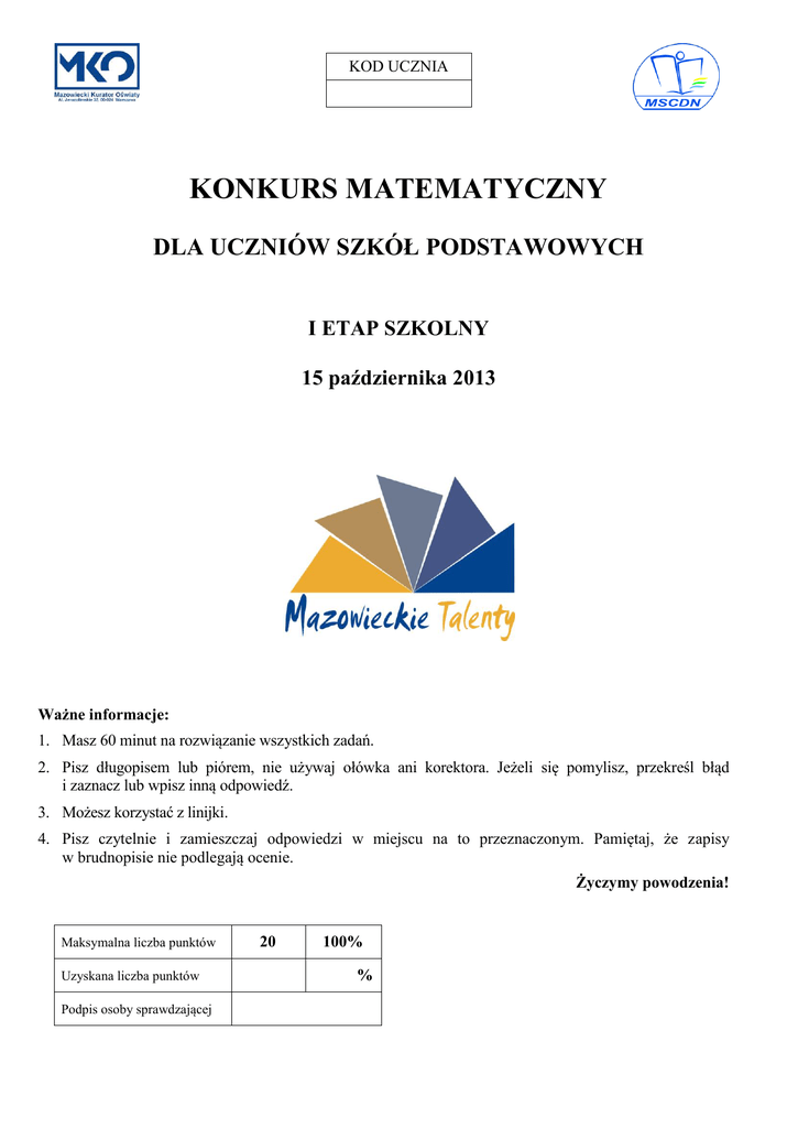 KOD UCZNIA KONKURS MATEMATYCZNY DLA UCZNIÓW SZKÓŁ PODSTAWOWYCH I ETAP SZKOLNY 15 października 2013 Ważne informacje: 1. Masz 60 minut na rozwiązanie wszystkich zadań. 2. Pisz długopisem lub piórem, nie używaj ołówka ani korektora. Jeżeli się pomylisz, przekreśl błąd i zaznacz lub wpisz inną odpowiedź. 3. Możesz korzystać z linijki. 4. Pisz czytelnie i zamieszczaj odpowiedzi w miejscu na to przeznaczonym. Pamiętaj, że zapisy w brudnopisie nie podlegają ocenie. Życzymy powodzenia! Maksymalna liczba punktów Uzyskana liczba punktów Podpis osoby sprawdzającej 20 100% % Konkurs matematyczny. Etap szkolny Zadanie 1. ( 0 – 4 pkt ) 3 Suma dwóch liczb jest równa 600 . Jeżeli jeden ze składników podzielimy przez dwa, 4 to nowa suma będzie równa 488,5. Oblicz, jakie to liczby. 2 Konkurs matematyczny. Etap szkolny Zadanie 2. ( 0 – 4 pkt ) Po lekcjach, o godzinie 1330, chłopcy umówili się na spotkanie. Ustalili godzinę spotkania 1 w następujący sposób: czas, który upłynął od południa do godziny 1330, jest równy czasu, 5 który pozostał do wyznaczonego momentu spotkania. Oblicz, o której godzinie chłopcy się umówili. 3 Konkurs matematyczny. Etap szkolny Zadanie 3. ( 0 – 4 pkt ) Na poniższym rysunku półproste k i m są równoległe. Odcinki AC i BC są równej długości, a kąt ACB ma miarę 32 . Oblicz miarę kąta . k m B 32 A C 4 Konkurs matematyczny. Etap szkolny Zadanie 4. ( 0 – 4 pkt ) W prostokącie ABCD punkt P jest środkiem boku BC, zaś punkt R jest środkiem boku CD. Trójkąt APR ma pole równe 30 cm2 . Oblicz pole prostokąta ABCD. 5 Konkurs matematyczny. Etap szkolny Zadanie 5. ( 0 – 4 pkt ) Miasta Lipowo i Sosnowo są oddalone od siebie o 60 km. Na rysunku podano odległości między miastami Lipowo, Sosnowo i Klonowo na pewnej mapie. Oblicz, jaką odległość pokona kierowca jadący z Lipowa przez Sosnowo do Klonowa. Lipowo 3 cm Sosnowo 2 cm Klonowo 6 Konkurs matematyczny. Etap szkolny BRUDNOPIS 7