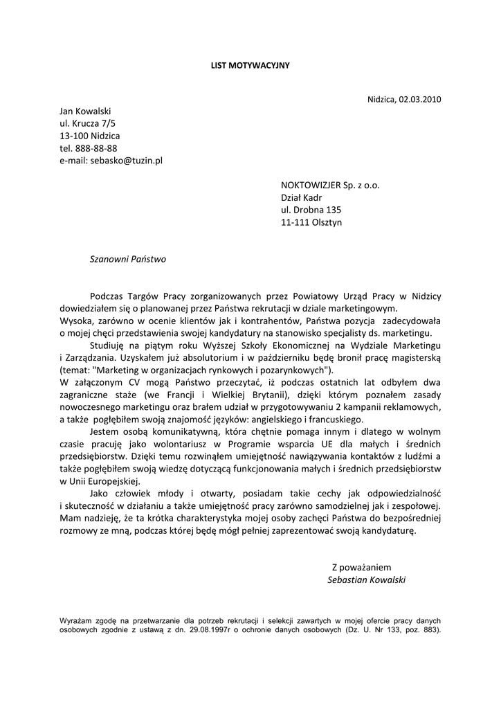 LIST MOTYWACYJNY Nidzica, 02.03.2010 Jan Kowalski ul. Krucza 7/5 13-100 Nidzica tel. 888-88-88 e-mail: [email protected] NOKTOWIZJER Sp. z o.o. Dział Kadr ul. Drobna 135 11-111 Olsztyn Szanowni Państwo Podczas Targów Pracy zorganizowanych przez Powiatowy Urząd Pracy w Nidzicy dowiedziałem się o planowanej przez Państwa rekrutacji w dziale marketingowym. Wysoka, zarówno w ocenie klientów jak i kontrahentów, Państwa pozycja zadecydowała o mojej chęci przedstawienia swojej kandydatury na stanowisko specjalisty ds. marketingu. Studiuję na piątym roku Wyższej Szkoły Ekonomicznej na Wydziale Marketingu i Zarządzania. Uzyskałem już absolutorium i w październiku będę bronił pracę magisterską (temat: "Marketing w organizacjach rynkowych i pozarynkowych"). W załączonym CV mogą Państwo przeczytać, iż podczas ostatnich lat odbyłem dwa zagraniczne staże (we Francji i Wielkiej Brytanii), dzięki którym poznałem zasady nowoczesnego marketingu oraz brałem udział w przygotowywaniu 2 kampanii reklamowych, a także pogłębiłem swoją znajomość języków: angielskiego i francuskiego. Jestem osobą komunikatywną, która chętnie pomaga innym i dlatego w wolnym czasie pracuję jako wolontariusz w Programie wsparcia UE dla małych i średnich przedsiębiorstw. Dzięki temu rozwinąłem umiejętność nawiązywania kontaktów z ludźmi a także pogłębiłem swoją wiedzę dotyczącą funkcjonowania małych i średnich przedsiębiorstw w Unii Europejskiej. Jako człowiek młody i otwarty, posiadam takie cechy jak odpowiedzialność i skuteczność w działaniu a także umiejętność pracy zarówno samodzielnej jak i zespołowej. Mam nadzieję, że ta krótka charakterystyka mojej osoby zachęci Państwa do bezpośredniej rozmowy ze mną, podczas której będę mógł pełniej zaprezentować swoją kandydaturę. Z poważaniem Sebastian Kowalski Wyrażam zgodę na przetwarzanie dla potrzeb rekrutacji i selekcji zawartych w mojej ofercie pracy danych osobowych zgodnie z ustawą z dn. 29.08.1997r o ochronie danych osobowych (Dz. U. Nr 133, poz. 883).