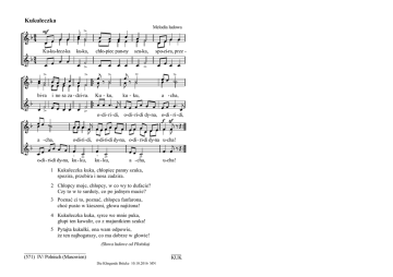 Kukułeczka Ku-ku-łecz-ka ku-ka, chło-piec pan-ny szu-ka, Melodia ludowa spo-zi-ra, prze - Ku - ku, ku - ku, a - cha, o- di- ri- di, o-di- ri-di dy-na, o-di - ri- di, a - cha, o-di-ri- di, o-di-ri-di dy-na, o-di- ri-di dy-na u-cha! bi-ra i no sa za - dzi-ra. o-di- ri-di dy-na, ku - ku, ku - ku, a - cha, u-cha! 1 Kukułeczka kuka, chłopiec panny szuka, spozira, przebira i nosa zadzira. 2 Chłopcy moje, chłopcy, w co wy to dufacie? Czy to w te surduty, co po jednym macie? 3 Poznać ci to, poznać, chłopca fanfarona, choć pusto w kieszeni, głowa najiżona! 4 Kukułeczka kuka, syrce we mnie puka, głupi ten kawalir, co z majuntkiem szuka! 5 Pytajta kukułki, ona wam odpowie, że ten najbogatszy, co ma dobrze w głowie! (Słowa ludowe od Płońska) _________________________ (571) IV/ Polnisch (Masowien) ____ KUK Die Klingende Brücke 10.10.2016 MN Kukułeczka Melodia ludowa Volksmelodie 1 Kukułeczka (dim. fem.) kuka, chłopiec panny szuka, spozira, przebira i nosa zadzira. Der Kuckuck ruft Kuckuck (wörtl. kuckuckt), der Bursche ein Mädchen sucht, er schaut, wählt, und die Nase hält (er) hoch. 2 Chłopcy moje, chłopcy, w co wy to dufacie? Czy to1 w te surduty, co po jednym macie? Burschen, meine Burschen, worauf seid ihr so stolz? Ist es auf diese Gehröcke (=Volkstracht) von denen (jeder von euch) nur einen hat? 3 Poznać ci2 to, poznać, chłopca fanfarona, choć pusto w kieszeni, głowa najiżona! Man erkennt (den) prahlerischen Jüngling, obschon nichts (wörtl. leer) in der Tasche, (trägt er) den Kopf erhoben. 4 Kukułeczka kuka, syrce we mnie puka, głupi ten kawalir, co z majuntkiem szuka! Der Kuckuck ruft, Das Herz in mir klopft, dumm (ist) der Freier, der (eine Braut) mit Vermögen sucht. 5 Pytajta kukułki, ona wam odpowie, że ten najbogatszy, co ma dobrze w głowie! Fragt den Kuckuck, er wird euch antworten, dass der am reichsten (ist), der hat einen gutgeordneten Kopf. Słowa ludowe od Płonska Dialekt aus der Gegend von Plońsk (Stadt 50 km nordwestl. von Warschau) 1 2 czy Fragepartikel; to ‚das‘, oft als Füllwort zur Betonung gebraucht ci dir, Dativus ethicus; dient nur der Verstärkung SG/II/GE/KH/KG/UBS 130301 _______________________________________________ ________ (571) IV/ Polnisch (Masowien) KUK Die Klingende Brücke 10.10.2016/MN
