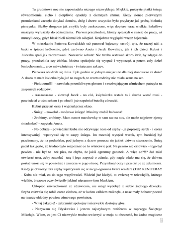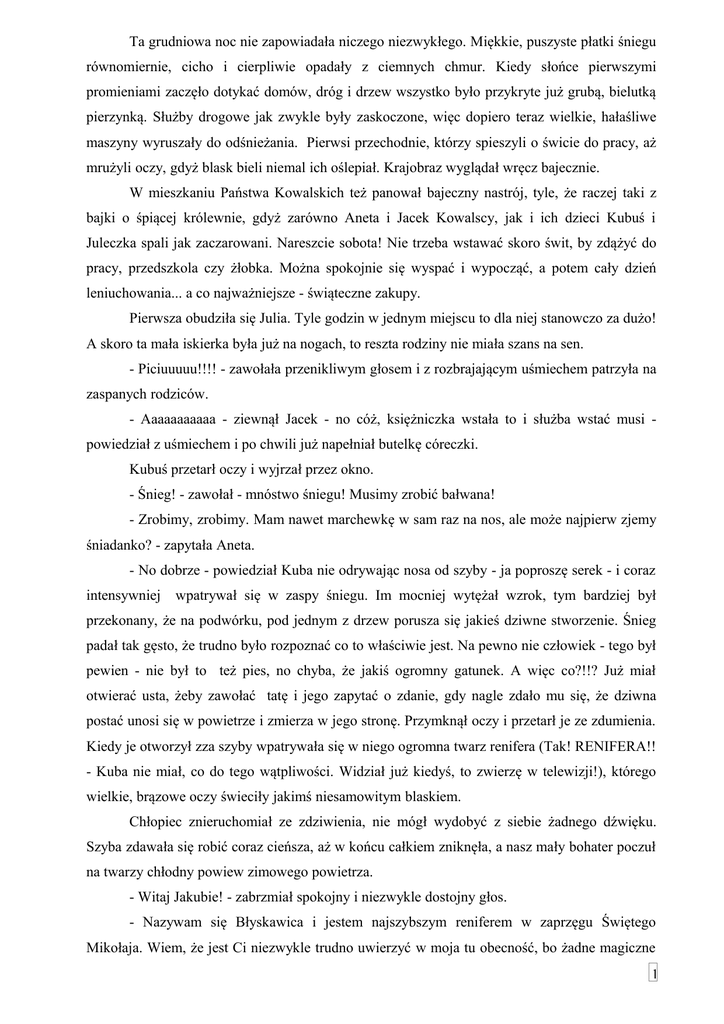 Ta grudniowa noc nie zapowiadała niczego niezwykłego. Miękkie, puszyste płatki śniegu równomiernie, cicho i cierpliwie opadały z ciemnych chmur. Kiedy słońce pierwszymi promieniami zaczęło dotykać domów, dróg i drzew wszystko było przykryte już grubą, bielutką pierzynką. Służby drogowe jak zwykle były zaskoczone, więc dopiero teraz wielkie, hałaśliwe maszyny wyruszały do odśnieżania. Pierwsi przechodnie, którzy spieszyli o świcie do pracy, aż mrużyli oczy, gdyż blask bieli niemal ich oślepiał. Krajobraz wyglądał wręcz bajecznie. W mieszkaniu Państwa Kowalskich też panował bajeczny nastrój, tyle, że raczej taki z bajki o śpiącej królewnie, gdyż zarówno Aneta i Jacek Kowalscy, jak i ich dzieci Kubuś i Juleczka spali jak zaczarowani. Nareszcie sobota! Nie trzeba wstawać skoro świt, by zdążyć do pracy, przedszkola czy żłobka. Można spokojnie się wyspać i wypocząć, a potem cały dzień leniuchowania... a co najważniejsze - świąteczne zakupy. Pierwsza obudziła się Julia. Tyle godzin w jednym miejscu to dla niej stanowczo za dużo! A skoro ta mała iskierka była już na nogach, to reszta rodziny nie miała szans na sen. - Piciuuuuu!!!! - zawołała przenikliwym głosem i z rozbrajającym uśmiechem patrzyła na zaspanych rodziców. - Aaaaaaaaaaa - ziewnął Jacek - no cóż, księżniczka wstała to i służba wstać musi powiedział z uśmiechem i po chwili już napełniał butelkę córeczki. Kubuś przetarł oczy i wyjrzał przez okno. - Śnieg! - zawołał - mnóstwo śniegu! Musimy zrobić bałwana! - Zrobimy, zrobimy. Mam nawet marchewkę w sam raz na nos, ale może najpierw zjemy śniadanko? - zapytała Aneta. - No dobrze - powiedział Kuba nie odrywając nosa od szyby - ja poproszę serek - i coraz intensywniej wpatrywał się w zaspy śniegu. Im mocniej wytężał wzrok, tym bardziej był przekonany, że na podwórku, pod jednym z drzew porusza się jakieś dziwne stworzenie. Śnieg padał tak gęsto, że trudno było rozpoznać co to właściwie jest. Na pewno nie człowiek - tego był pewien - nie był to też pies, no chyba, że jakiś ogromny gatunek. A więc co?!!? Już miał otwierać usta, żeby zawołać tatę i jego zapytać o zdanie, gdy nagle zdało mu się, że dziwna postać unosi się w powietrze i zmierza w jego stronę. Przymknął oczy i przetarł je ze zdumienia. Kiedy je otworzył zza szyby wpatrywała się w niego ogromna twarz renifera (Tak! RENIFERA!! - Kuba nie miał, co do tego wątpliwości. Widział już kiedyś, to zwierzę w telewizji!), którego wielkie, brązowe oczy świeciły jakimś niesamowitym blaskiem. Chłopiec znieruchomiał ze zdziwienia, nie mógł wydobyć z siebie żadnego dźwięku. Szyba zdawała się robić coraz cieńsza, aż w końcu całkiem zniknęła, a nasz mały bohater poczuł na twarzy chłodny powiew zimowego powietrza. - Witaj Jakubie! - zabrzmiał spokojny i niezwykle dostojny głos. - Nazywam się Błyskawica i jestem najszybszym reniferem w zaprzęgu Świętego Mikołaja. Wiem, że jest Ci niezwykle trudno uwierzyć w moja tu obecność, bo żadne magiczne 1 stworzenie nie pokazuje się zwykłym ludziom, zwłaszcza w świetle dziennym, ale sprawa jest na tyle poważna, że musiałem to zrobić. Mikołaj potrzebuje pomocy!!! Wzywa więc Ciebie i Twoją rodzinę do swojej wioski... 2