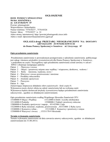 OGŁOSZENIE DOM POMOCY SPOŁECZNEJ 58-564 SOSNÓWKA ul. LICZYRZEPY 87 Powiat: jeleniogórski Województwo: dolnośląskie Numer telefonu: 757610237 , 757610326 Numer faksu: 757610237 w. 14 Adres strony internetowej: http://powiat.jeleniogorski.sisco.info Adres e-mail :[email protected] OGŁASZA drugi PRZETARG NIEOGRANICZONY NA: DOSTAWY ARTYKUŁÓW ŻYWNOŚCIOWYCH do Domu Pomocy Społecznej w Sosnówce ul. Liczyrzepy 87 Opis przedmiotu zamówienia Przedmiotem zamówienia w prowadzonym postępowaniu o udzielenie zamówienia publicznego jest zakup i dostawa artykułów żywnościowych dla Domu Pomocy Społecznej w Sosnówce , z podziałem na części. Szczegółowy opis przedmiotu zamówienia został zawarty w zał.nr1 SIWZ i obejmuje następujące pakiety: Pakiet 1 - Warzywa i owoce Pakiet 2 - Mięso i przetwory mięsne oraz wędliny / wieprzowe, drobiowe, wołowe / Pakiet 3 - Ryby /mrożone, wędzone, żywe / Pakiet 4 - Warzywa i owoce przetworzone i mrożone Pakiet 5 - Produkty mleczarskie Pakiet 6 - Artykuły spożywcze Pakiet 7 - Pieczywo Pakiet 8 - Jaja Zamawiający dopuszcza składanie ofert częściowych : ilość części 8. Wykonawca może złożyć ofertę na całość zamówienia lub na wybraną część. Wykonawca będzie dostarczał artykuły żywnościowe będące przedmiotem zamówienia sukcesywnie , zgodnie ze składanymi zamówieniami. Opis przedmiotu zamówienia według Wspólnego Słownika Zamówień CPV: 15100000-9 Mięso i Wędliny 15112000-6 Drób i wyroby drobiarskie 15114000-0 Podroby 15500000-3 Nabiał i przetwory mleczne 15800000-6 Produkty spożywcze i napoje , 03142500-3 Jaja 15220000-6 Ryby mrożone ,wędzone, przetworzone , 03311000 -2 Ryby żywe 15240000-2 Konserwy rybne , 15131000-5 Konserwy i przetwory z mięsa 15300000-0 Warzywa i owoce. , 15331170-9 Mrożonki Termin wykonania zamówienia Termin wykonania zamówienia od dnia zawarcia umowy sukcesywnie, zgodnie ze składanymi zamówieniami do 31.08.2011r. Warunki udziału w postępowaniu oraz opis sposobu dokonywania oceny spełniania tych warunków O udzielenie zamówienia publicznego mogą ubiegać się Wykonawcy, którzy spełniają warunki dotyczące : 1. posiadania uprawnień do wykonywania określonej działalności lub czynności , jeżeli przepisy prawa nakładają obowiązek ich posiadania, 2. posiadania niezbędnej wiedzy i doświadczenia; 3. dysponowania odpowiednim potencjałem technicznym oraz osobami zdolnymi do wykonywania zamówień; 4. sytuacji ekonomicznej i finansowej zapewniającej wykonanie zamówienia. Ocena spełniania warunków udziału w postępowaniu zostanie dokonana według ,,spełnia/nie spełnia , w oparciu o informacje zawarte w SIWZ. Informacje o sposobie porozumiewania się Zamawiającego z Wykonawcami oraz przekazywania oświadczeń i dokumentów , a także wskazanie osób uprawnionych do porozumiewania się z wykonawcami Oświadczenia ,wnioski, zawiadomienia oraz informacje Zamawiający i Wykonawcy przekazują pisemnie lub faksem. Fakt otrzymania oświadczeń ,wniosków, zawiadomień oraz informacji przekazywanych faksem, każda ze stron na żądanie drugiej niezwłocznie potwierdza fakt ich otrzymania. Za datę powzięcia wiadomości uważa się dzień ,w którym strony postępowania otrzymały informację za pomocą faksu w sposób umożliwiający zapoznanie się z tą informacją , a dla pism wysłanych pocztą liczy się data dostarczenia ich do siedziby adresata. Wszelkie pytania i wątpliwości dotyczące prowadzonego postępowania należy kierować w języku polskim do Zamawiającego: -faksem-na nr 75 76 10 237 wewnętrzny 14 -w formie pisemnej na adres :Dom Pomocy Społecznej ul. Liczyrzepy 87 58-564 Sosnówka -lub dostarczyć osobiście do siedziby Domu Pomocy Społecznej w Sosnówce Wymagania dotyczące wadium Zamawiający nie wymaga wadium. Termin związania ofertą Zgodnie z art.85 ust 1 pkt.1 ustawy Prawo zamówień publicznych Wykonawca pozostaje związany złożoną ofertą przez okres 30 dni. Bieg terminu związania ofertą rozpoczyna się wraz z upływem terminu składania ofert . Miejsce oraz termin składania 1.Miejsce składania ofert: Dom Pomocy Społecznej , 58-564 Sosnówka , ul. Liczyrzepy 87 2.Termin składania ofert upływa w dniu 7 październik 2010 r. o godz. 10.00 (za termin złożenia oferty przyjmuje się dzień i godzinę zarejestrowania w Domu Pomocy Społecznej w Sosnówce ul.Liczyrzepy87.) Dla ofert wysłanych pocztą liczy się data i godzina dostarczenia oferty do siedziby Zamawiającego jak wyżej. Oferty , które wpłyną do Zamawiającego po wyznaczonym terminie do składania ofert, zostaną niezwłocznie odesłana do Wykonawcy ,bez otwierania. 3.Otwarcie ofert jest jawne. Opis kryteriów , którymi zamawiający będzie się kierował przy wyborze oferty, wraz z podaniem znaczenia tych kryteriów i sposoby oceny ofert Zamawiający wybierze najkorzystniejszą ofertę na podstawie kryteriów oceny ofert określonych w SIWZ. Przy wyborze najkorzystniejszej oferty Zamawiający będzie stosował wyłącznie kryterium : cena całkowita-waga 100% O wyborze najkorzystniejszej oferty zadecyduje najwyższa liczba uzyskanych punktów. Pod uwagę będą brane liczby zaokrąglone do dwóch miejsc po przecinku. Wymagania dotyczące zabezpieczenia należytego wykonania umowy Zamawiający nie wymaga wniesienia zabezpieczenia należytego wykonania umowy. Maksymalna liczba wykonawców ,z którymi zamawiający zawrze umowę ramową Zamawiający nie przewiduje zawarcia umowy ramowej. Informacje o przewidywanych zamówieniach uzupełniających ,o których mowa w art.67 ust.1 pkt. 6 i 7 Zamawiający nie przewiduje udzielenia zamówień uzupełniających ,zgodnie z art.67 ust.1 pkt 7 ustawy Prawo zamówień publicznych. Opis sposobu przedstawienia ofert wariantowych oraz minimalne warunki, jakim muszą odpowiadać oferty wariantowe Zamawiający nie dopuszcza składania ofert wariantowych. Adres poczty elektronicznej lub strony internetowej zamawiającego A