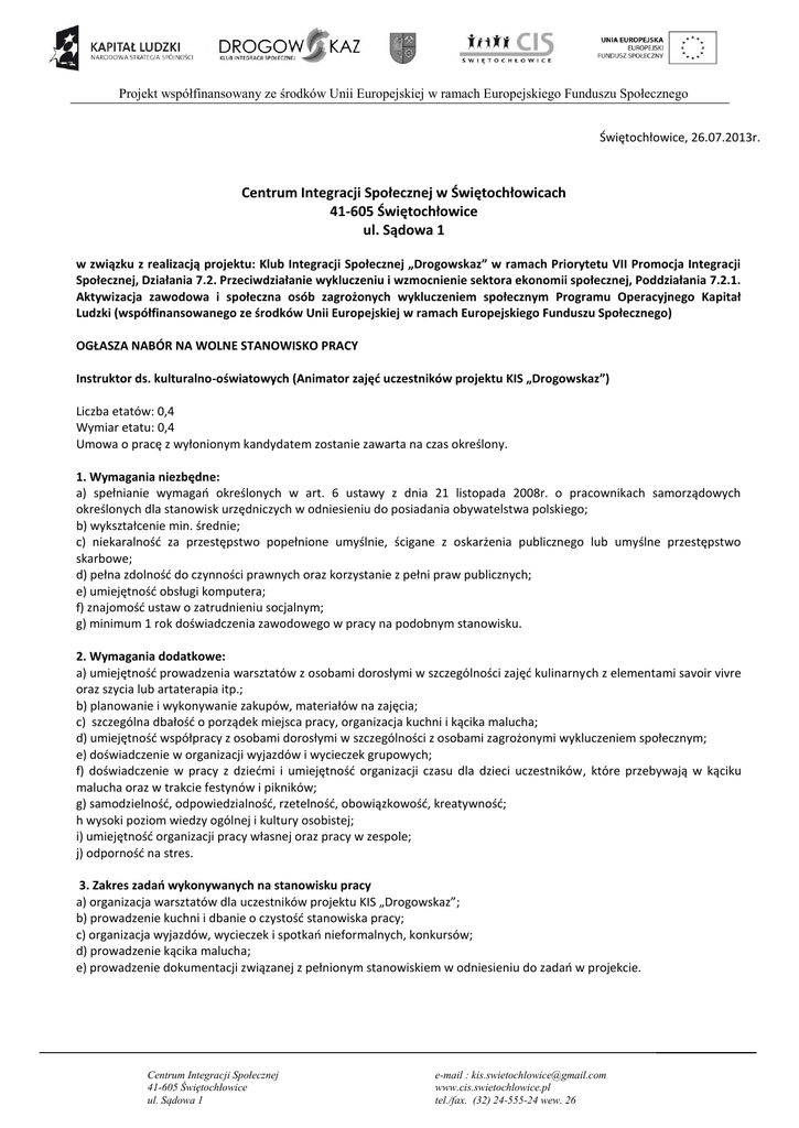 Projekt współfinansowany ze środków Unii Europejskiej w ramach Europejskiego Funduszu Społecznego Świętochłowice, 26.07.2013r. Centrum Integracji Społecznej w Świętochłowicach 41-605 Świętochłowice ul. Sądowa 1 w związku z realizacją projektu: Klub Integracji Społecznej „Drogowskaz” w ramach Priorytetu VII Promocja Integracji Społecznej, Działania 7.2. Przeciwdziałanie wykluczeniu i wzmocnienie sektora ekonomii społecznej, Poddziałania 7.2.1. Aktywizacja zawodowa i społeczna osób zagrożonych wykluczeniem społecznym Programu Operacyjnego Kapitał Ludzki (współfinansowanego ze środków Unii Europejskiej w ramach Europejskiego Funduszu Społecznego) OGŁASZA NABÓR NA WOLNE STANOWISKO PRACY Instruktor ds. kulturalno-oświatowych (Animator zajęć uczestników projektu KIS „Drogowskaz”) Liczba etatów: 0,4 Wymiar etatu: 0,4 Umowa o pracę z wyłonionym kandydatem zostanie zawarta na czas określony. 1. Wymagania niezbędne: a) spełnianie wymagań określonych w art. 6 ustawy z dnia 21 listopada 2008r. o pracownikach samorządowych określonych dla stanowisk urzędniczych w odniesieniu do posiadania obywatelstwa polskiego; b) wykształcenie min. średnie; c) niekaralność za przestępstwo popełnione umyślnie, ścigane z oskarżenia publicznego lub umyślne przestępstwo skarbowe; d) pełna zdolność do czynności prawnych oraz korzystanie z pełni praw publicznych; e) umiejętność obsługi komputera; f) znajomość ustaw o zatrudnieniu socjalnym; g) minimum 1 rok doświadczenia zawodowego w pracy na podobnym stanowisku. 2. Wymagania dodatkowe: a) umiejętność prowadzenia warsztatów z osobami dorosłymi w szczególności zajęć kulinarnych z elementami savoir vivre oraz szycia lub artaterapia itp.; b) planowanie i wykonywanie zakupów, materiałów na zajęcia; c) szczególna dbałość o porządek miejsca pracy, organizacja kuchni i kącika malucha; d) umiejętność współpracy z osobami dorosłymi w szczególności z osobami zagrożonymi wykluczeniem społecznym; e) doświadczenie w organizacji wyjazdów i wycieczek grupowych; f) doświadczenie w pracy z dziećmi i umiejętność organizacji czasu dla dzieci uczestników, które przebywają w kąciku malucha oraz w trakcie festynów i pikników; g) samodzielność, odpowiedzialność, rzetelność, obowiązkowość, kreatywność; h wysoki poziom wiedzy ogólnej i kultury osobistej; i) umiejętność organizacji pracy własnej oraz pracy w zespole; j) odporność na stres. 3. Zakres zadań wykonywanych na stanowisku pracy a) organizacja warsztatów dla uczestników projektu KIS „Drogowskaz”; b) prowadzenie kuchni i dbanie o czystość stanowiska pracy; c) organizacja wyjazdów, wycieczek i spotkań nieformalnych, konkursów; d) prowadzenie kącika malucha; e) prowadzenie dokumentacji związanej z pełnionym stanowiskiem w odniesieniu do zadań w projekcie. Centrum Integracji Społecznej 41-605 Świętochłowice ul. Sądowa 1 e-mail : [email protected] www.cis.swietochlowice.pl tel./fax. (32) 24-555-24 wew. 26 Projekt współfinansowany ze środków Unii Europejskiej w ramach Europejskiego Funduszu Społecznego 4. Wymagane dokumenty i oświadczenia: a) życiorys (CV); b) list motywacyjny; c) kopia świadectw ukończonych szkół; d) oświadczenie o niekaralności za przestępstwa popełnione umyślnie, ścigane z oskarżenia publicznego lub umyślne przestępstwa skarbowe; e) oświadczenie o pełnej zdolności do czynności prawnej oraz korzystania z pełni praw publicznych; f) kopie dokumentów poświadczających doświadczenie zawodowe; g) oświadczenie o nieprowadzeniu działalności gospodarczej lub o charakterze prowadzonej działalności gospodarczej; h) oświadczenie kandydata o braku przeciwwskazań zdrowotnych do pracy na stanowisku; i) inne dokumenty poświadczające o posiadanych kwalifikacjach i umiejętnościach; j) kwestionariusz osobowy. 5. Zasady przeprowadzania procedury rekrutacyjnej Kandydaci zostaną poddani 2 etapowemu konkursowi: I etap – ocena formalna dokumentów, II etap –do rozmowa kwalifikacyjna oceniająca predyspozycje i zdolności ogólne. Wymagane dokumenty aplikacyjne należy składać osobiście w siedzibie Centrum Integracji w Świętochłowicach lub pocztą na adres Centrum Integracji Społecznej w terminie do dnia 09.08.2013r. Społecznej Aplikacje, które wpłyną do Centrum Integracji Społecznej po wyżej wymienionym terminie nie będą rozpatrywane. Wymagane dokumenty aplikacyjne list motywacyjny, szczegółowe CV (z uwzględnieniem przebiegu kariery zawodowej), powinny być opatrzone klauzulą: „Wyrażam zgodę na przetwarzanie moich danych osobowych zawartych w ofercie pracy dla potrzeb niezbędnych do realizacji procesu rekrutacji zgodnie z ustawą z dnia 29 sierpnia 1997r. o ochronie danych osobowych (tekst jednolity: Dz. U. z 2002r. Nr 101, poz. 926 z późn. zm.) oraz ustawą z dnia 21 listopada 2008r. o pracownikach samorządowych (Dz. U. z 2008r. Nr 223, poz. 1458 ).” Informacja o wyniku naboru będzie umieszczona na stronie internetowej www.cis.swietochlowice.pl oraz na tablicy ogłoszeń Centrum Integracji Społecznej przy ul. Sądowej 1. Dyrektor Centrum Integracji Społecznej w Świętochłowicach Kamil Wójcik Centrum Integracji Społecznej 41-605 Świętochłowice ul. Sądowa 1 e-mail : [email protected] www.cis.swietochlowice.pl tel./fax. (32) 24-555-24 wew. 26