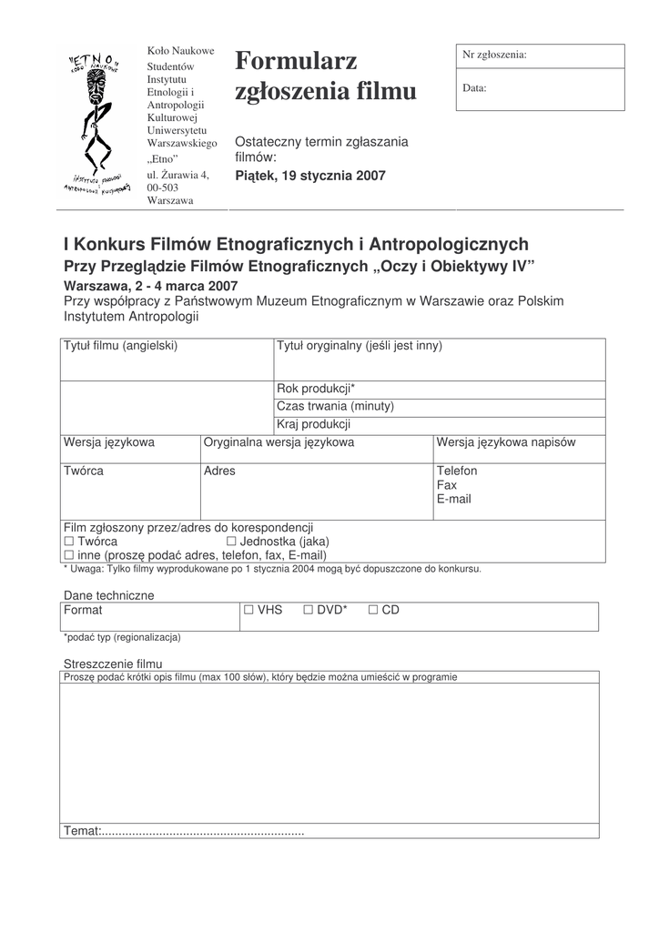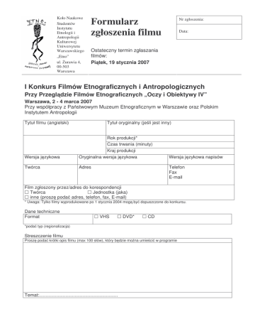 Koło Naukowe Studentów Instytutu Etnologii i Antropologii Kulturowej Uniwersytetu Warszawskiego „Etno” ul. urawia 4, 00-503 Warszawa Formularz zgłoszenia filmu Nr zgłoszenia: Data: Ostateczny termin zgłaszania filmów: Pi tek, 19 stycznia 2007 I Konkurs Filmów Etnograficznych i Antropologicznych Przy Przegl dzie Filmów Etnograficznych „Oczy i Obiektywy IV” Warszawa, 2 - 4 marca 2007 Przy współpracy z Pa stwowym Muzeum Etnograficznym w Warszawie oraz Polskim Instytutem Antropologii Tytuł filmu (angielski) Tytuł oryginalny (je li jest inny) Wersja j zykowa Rok produkcji* Czas trwania (minuty) Kraj produkcji Oryginalna wersja j zykowa Twórca Adres Wersja j zykowa napisów Telefon Fax E-mail Film zgłoszony przez/adres do korespondencji Twórca Jednostka (jaka) inne (prosz poda adres, telefon, fax, E-mail) * Uwaga: Tylko filmy wyprodukowane po 1 stycznia 2004 mog by dopuszczone do konkursu. Dane techniczne Format VHS DVD* CD *poda typ (regionalizacja) Streszczenie filmu Prosz poda krótki opis filmu (max 100 słów), który b dzie mo na umie ci w programie Temat:............................................................ Dodatkowe informacje Wcze niejsze prezentacje Otrzymane nagrody Strona internetowa (równie strona twórcy) Uwagi Preferowany sposób odbioru nagrody* *je li film otrzyma nagrod Zapoznałem si z regulaminem oraz warunkami konkursu i akceptuj je. Podpis.................................................................. Data....................................................... Wysła wraz z filmem I zgod na prezentacj na adres: Koło Naukowe Studentów Instytutu Etnologii i Antropologii Kulturowej Uniwersytetu Warszawskiego „Etno” ul. urawia 4, 00-503 Warszawa Dodatkowe informacje - e-mail: [email protected]