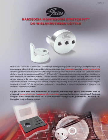 E13/70471 NARZĘDZIA MONTAŻOWE STRETCH FIT™ DO WIELOKROTNEGO UŻYTKU Montaż paska Micro-V® XF Stretch Fit™, podobnie jak każdego innego paska elastycznego, musi przebiegać przy zastosowaniu odpowiednich narzędzi. Firma Gates opracowała dwa uniwersalne narzędzia wielokrotnego użytku umożliwiające mechanikom dokonanie właściwego montażu pasków Micro-V® XF Stretch Fit™. Dzięki nim można obsłużyć szeroki zakres zastosowań Micro-V® XF Stretch Fit™. Narzędzia dostarczane są w solidnym plastikowym oraz odpornym na uderzenia pudełku. Zestaw zawiera uniwersalne narzędzie oraz trzy bolce stabilizujące na kole pasowym. Ze względu na zróżnicowane kształty kół pasowych, bolce te mają różne długości. W celu zapewnienia naszym klientom jeszcze bardziej kompleksowych usług, firma Gates opracowała także narzędzia instalacyjne Stretch Fit™ dla konkretnych zastosowań. Narzędzia te są również dostarczane w odpornym na uderzenia plastikowym pudełku. Czy jest w takim razie sens inwestowania w narzędzia jednorazowego użytku, skoro można mieć do dyspozycji trwałe, efektywne i przyjazne dla środowiska rozwiązania oferowane przez Gates? Ponieważ narzędzia montażowe Gates Stretch Fit™ to produkty wielorazowego użytku, paski Micro-V® XF Stretch Fit™ i narzędzia są sprzedawane osobno. PROGRAM PASKÓW MICRO-V® XF STRETCH FIT™ Rozszerzenie oferty pasków wieloklinowych Micro-V® XF Firma Gates oferuje szeroką gamę produktów dla układów napędu paska pomocniczego, w tym: paski wieloklinowe Micro-V® XF, napinacze DriveAlign®, zestawy Micro-V® XF oraz niezbędne wsparcie techniczne, aby zapewnić niezawodność i trwałość systemów napędowych. Poprzez poszerzenie oferty o nową linię pasków wieloklinowych Micro-V® XF Stretch Fit™, firma Gates pragnie zaoferować niezależnemu rynkowi części zamiennych kolejne profesjonalne rozwiązanie dla układów napędu paska pomocniczego. Coraz większa liczba producentów samochodów wprowadza na rynek modele samochodów, które nie są wyposażone w elementy napinające. Paski Micro-V®XF Stretch Fit™ stanowią najlepsze rozwiązanie dla tych zastosowań. Są one wstępnie napięte na kole pasowym, dzięki czemu utrzymywane jest optymalne napięcie dla efektywnego przenoszenia mocy przez długi czas. Napięcie to jest na tyle niskie, aby umożliwić łatwy montaż i zapobiec uszkodzeniu komponentów. Zrozumiałe i szczegółowe instrukcje montażowe Firma Gates opracowała specjalne instrukcje montażowe dla każdego paska wieloklinowego Micro-V® XF Stretch Fit™. Instrukcje te umieszczone są na wewnętrznej stronie opakowania i określają właściwe narzędzie montażowe Stretch Fit™. Identyfikacja właściwego narzędzia znajduje się również na zewnętrznej stronie opakowania oraz w różnych katalogach firmy Gates. Aktualne dane Szczegółowe informacje dotyczące numerów części, wymiarów, zastosowań i narzędzi znajdują się w nowym drukowanym Katalogu Układu Napędowego Gates E/70107. Dostępne są one również w wersji elektronicznej na stronie www.gatesautocat.com. Twój dystrybutor: Producent zastrzega sobie prawo do wprowadzania zmian w miarę potrzeb. © Gates Corporation 2011 Wydrukowano w Belgii - 05/11.