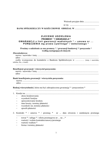 Wniosek przyjęto dnia ........................... nr rej. ..................................................... BANK SPÓŁDZIELCZY W KOŻUCHOWIE ODDZIAŁ W ..................................... ZLECENIE UDZIELENIA PROMESY */ GWARANCJI * GW AR AN C JI z linii gw a rancji w adi al n ych * – umow a nr . .. P ORĘ CZE NI A w g praw a c yw il nego* / w ek slow ego * Prosimy o udzielenie za nas promesy * / gwarancji bankowej */ poręczenia * według następujących danych: Zleceniodawca: nazwa / nazwisko i imię ............................................................................................................... adres ............................................................................................................................................. osoby wyznaczone do kontaktów z Bankiem Spółdzielczym w ………… (imię i nazwisko, telefon, fax., e-mail) ....................................................................................................................................................... Beneficjent gwarancji / wierzyciel poręczenia: nazwa / nazwisko i imię ............................................................................................................... adres …………............................................................................................................................. Bank beneficjenta gwarancji / wierzyciela poręczenia: nazwa .......................................................................................................................................... adres ............................................................................................................................................ Rodzaj wierzytelności, która ma być zabezpieczona gwarancją * / poręczeniem * ........................................................................................................................................................ 1. Kredyt na ..................................................................................................................................... − okres kredytowania − wysokość kredytu − oprocentowanie kredytu − inne koszty, terminy płatności − wysokość rat, terminy płatności − sposób płatności 2. Kontrakt * / umowa * / przetarg * nr ... data otwarcia i zamknięcia przetargu ....................................................................................................................................................... − towar * / usługa * / oferta przetargowa nr ... na ...* − wartość i waluta kontraktu/umowy/przetargu − wartość wadium * − forma i terminy płatności 1 3. Akredytywa * nr ................................................ data ...................................................... − warunki akredytywy − dane dotyczące kontraktu/umowy - pkt 2 4. Konosament * nr ................................................. data ...................................................... − przewoźnik − inne istotne dane dotyczące konosamentu − dane dotyczące kontraktu/umowy - pkt 2 Kwota gwarancji * / poręczenia * Termin ważności gwarancji * / poręczenia * Zobowiązanie wchodzi w życie: z dniem wystawienia ........................................................................................................................................... Gwarancja podlega Jednolitym Regułom: tak nie Treść gwarancji */ poręczenia * według wzoru: Banku Spółdzielczego w Kożuchowie załączonego wzoru Gwarancja * / poręczenie * udzielone przez Bank Spółdzielczy w ………….. przekazana/e będzie bezpośrednio beneficjentowi / wierzycielowi Sposób przekazania gwarancji: SWIFT list polecony poczta kurierska odbierze Zleceniodawca Inne techniczne instrukcje dla Banku Spółdzielczego w Kożuchowie ............................................................................................................................................................ Prowizje i koszty: Banku Spółdzielczego w Kożuchowie płaci: zleceniodawca beneficjent Jeżeli prowizje i koszty bankowe płaci beneficjent, wejście w życie gwarancji * / poręczenia *: 2 jest uzależnione od ich zapłacenia nie jest uzależnione od ich zapłacenia; w przypadku odmowy zapłacenia przez beneficjenta, zapłaci je Zleceniodawca Proponowane zabezpieczenie gwarancji * / poręczenia *: ............................................................................................................................................................ Oświadczam, że posiadam * / nie posiadam * pozwolenie przywozu * / wywozu * przedmiotowego towaru * / usługi * lub indywidualne zezwolenie dewizowe * nr ......................... z dnia .................................................................................................................................................. Oświadczam, że: 1. posiadam * / nie posiadam* następujące rachunki bankowe w innych bankach: ...................................................................................................................................................... 2. posiadam * / nie posiadam* kredyty lub gwarancje w innych bankach * / instytucjach finansowych * w kwocie ........................................................................................................... ubiegałem się * / nie ubiegałem się * / ubiegam się * / nie ubiegam się * w ciągu ostatniego roku o kredyty lub gwarancje w innym bankach * / instytucjach finansowych * .................................................................................................................................................................... 3. inne zobowiązania: ...................................................................................................................... Oświadczam, że toczy * / nie toczy* się wobec mnie postępowanie sądowe w sprawie ...........................................................................
