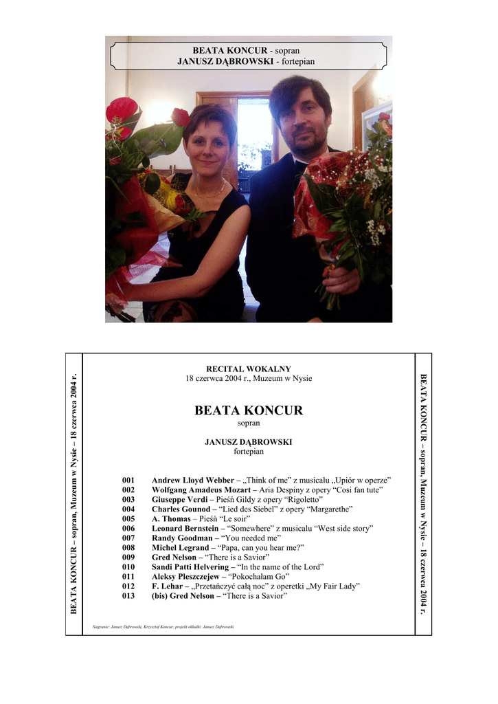 RECITAL WOKALNY 18 czerwca 2004 r., Muzeum w Nysie BEATA KONCUR sopran JANUSZ DĄBROWSKI fortepian 001 002 003 004 005 006 007 008 009 010 011 012 013 Andrew Lloyd Webber – „Think of me” z musicalu „Upiór w operze” Wolfgang Amadeus Mozart – Aria Despiny z opery “Cosi fan tute” Giuseppe Verdi – Pieśń Gildy z opery “Rigoletto” Charles Gounod – “Lied des Siebel” z opery “Margarethe” A. Thomas – Pieśń “Le soir” Leonard Bernstein – “Somewhere” z musicalu “West side story” Randy Goodman – “You needed me” Michel Legrand – “Papa, can you hear me?” Gred Nelson – “There is a Savior” Sandi Patti Helvering – “In the name of the Lord” Aleksy Pleszczejew – “Pokochałam Go” F. Lehar – „Przetańczyć całą noc” z operetki „My Fair Lady” (bis) Gred Nelson – “There is a Savior” Nagranie: Janusz Dąbrowski, Krzysztof Koncur; projekt okładki: Janusz Dąbrowski BEATA KONCUR – sopran, Muzeum w Nysie – 18 czerwca 2004 r. BEATA KONCUR – sopran, Muzeum w Nysie – 18 czerwca 2004 r. BEATA KONCUR - sopran JANUSZ DĄBROWSKI - fortepian