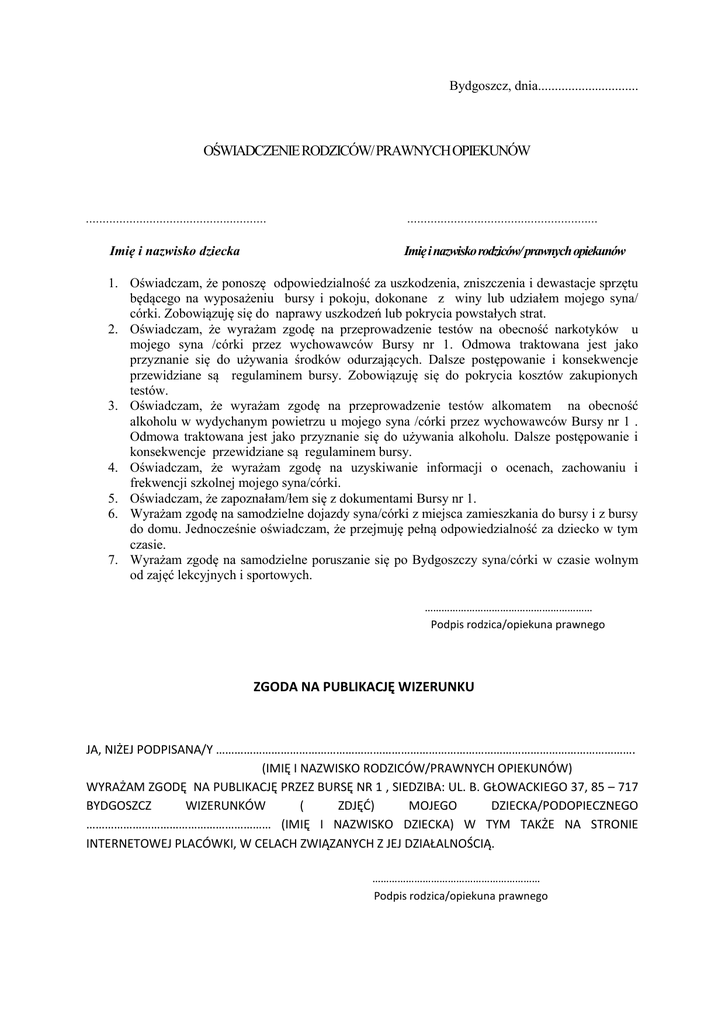 Bydgoszcz, dnia.............................. OŚWIADCZENIE RODZICÓW/ PRAWNYCH OPIEKUNÓW ...................................................... Imię i nazwisko dziecka ......................................................... Imię i nazwisko rodziców/ prawnych opiekunów 1. Oświadczam, że ponoszę odpowiedzialność za uszkodzenia, zniszczenia i dewastacje sprzętu będącego na wyposażeniu bursy i pokoju, dokonane z winy lub udziałem mojego syna/ córki. Zobowiązuję się do naprawy uszkodzeń lub pokrycia powstałych strat. 2. Oświadczam, że wyrażam zgodę na przeprowadzenie testów na obecność narkotyków u mojego syna /córki przez wychowawców Bursy nr 1. Odmowa traktowana jest jako przyznanie się do używania środków odurzających. Dalsze postępowanie i konsekwencje przewidziane są regulaminem bursy. Zobowiązuję się do pokrycia kosztów zakupionych testów. 3. Oświadczam, że wyrażam zgodę na przeprowadzenie testów alkomatem na obecność alkoholu w wydychanym powietrzu u mojego syna /córki przez wychowawców Bursy nr 1 . Odmowa traktowana jest jako przyznanie się do używania alkoholu. Dalsze postępowanie i konsekwencje przewidziane są regulaminem bursy. 4. Oświadczam, że wyrażam zgodę na uzyskiwanie informacji o ocenach, zachowaniu i frekwencji szkolnej mojego syna/córki. 5. Oświadczam, że zapoznałam/łem się z dokumentami Bursy nr 1. 6. Wyrażam zgodę na samodzielne dojazdy syna/córki z miejsca zamieszkania do bursy i z bursy do domu. Jednocześnie oświadczam, że przejmuję pełną odpowiedzialność za dziecko w tym czasie. 7. Wyrażam zgodę na samodzielne poruszanie się po Bydgoszczy syna/córki w czasie wolnym od zajęć lekcyjnych i sportowych. …………………………………………………… Podpis rodzica/opiekuna prawnego ZGODA NA PUBLIKACJĘ WIZERUNKU JA, NIŻEJ PODPISANA/Y ………………………………………………………………………………………………………………………. (IMIĘ I NAZWISKO RODZICÓW/PRAWNYCH OPIEKUNÓW) WYRAŻAM ZGODĘ NA PUBLIKACJĘ PRZEZ BURSĘ NR 1 , SIEDZIBA: UL. B. GŁOWACKIEGO 37, 85 – 717 BYDGOSZCZ WIZERUNKÓW ( ZDJĘĆ) MOJEGO DZIECKA/PODOPIECZNEGO …………………………………………………… (IMIĘ I NAZWISKO DZIECKA) W TYM TAKŻE NA STRONIE INTERNETOWEJ PLACÓWKI, W CELACH ZWIĄZANYCH Z JEJ DZIAŁALNOŚCIĄ. …………………………………………………… Podpis rodzica/opiekuna prawnego
