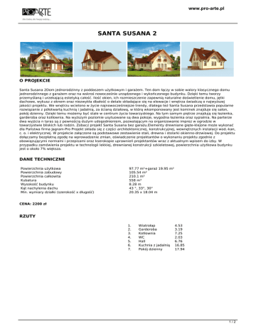 www.pro-arte.pl SANTA SUSANA 2 O PROJEKCIE Santa Susana 2Dom jednorodzinny z poddaszem użytkowym i garażem. Ten dom łączy w sobie walory klasycznego domu jednorodzinnego z garażem oraz na wskroś nowocześnie urządzonego i wykończonego budynku. Dzięki temu tworzy przemyślaną i urzekającą estetyką całość. Ilość okien, ich rozmieszczenie zapewnią naturalne doświetlenie domu, jętki dachowe, wykusz z oknem oraz niezwykła dbałość o detale składające się na elewacje i wnętrza świadczą o najwyższej jakości projektu. We wnętrzu wcielono w życie najnowocześniejsze trendy, dlatego też Santa Susana przedstawia popularne rozwiązanie z półotwartą kuchnią i jadalnią, za ścianą działową, w którą wkomponowany jest kominek znajduje się salon, pokój dzienny. Dzięki temu możemy być stale w centrum życia towarzyskiego. Na tym samym piętrze znajdują się łazienka, garderoba oraz kotłownia. Na wyższym poziomie usytuowane są dwa pokoje, wygodna łazienka oraz sypialnia. Na parterze dwa wyjścia n taras są z pewnością dużym udogodnieniem, pozwalającym na organizowanie imprez w ogrodzie w towarzystwie bliskich lub rodzin. Zobacz projekt Santa Susana bez garażu.Elementy drewniane gięte-klejone może wykonać dla Państwa firma Jagram-Pro Projekt składa się z części architektonicznej, konstrukcyjnej, wewnętrznych instalacji wod.-kan, c. o. i elektrycznej. W projekcie załączone są podstawowe zestawienie stali, drewna i stolarki okienno-drzwiowej. Do projektu dołączamy bezpłatną zgodę na wprowadzenie zmian, oświadczenie projektantów o wykonaniu projektu zgodnie z obowiązującymi normami i przepisami oraz kserokopie uprawnień projektantów wraz z aktualnym wpisem do izby. W przypadku zamówienia projektu w technologii lekkiej, drewnianej konstrukcji szkieletowej, powierzchnia użytkowa budynku jest o około 7% większa. DANE TECHNICZNE Powierzchnia użytkowa Powierzchnia zabudowy Powierzchnia całkowita Kubatura Wysokość budynku Kąt nachylenia dachu Min. wymiary działki (szerokość x długość) 97.77 m²+garaż 19.95 m² 105.54 m² 210.1 m² 558 m³ 8.28 m 43 °, 33°, 30° 20.35 x 18.04 m CENA: 2200 zł RZUTY 1. 2. 3. 4. 5. 6. 7. Wiatrołap Garderoba Kotłownia WC Hall Kuchnia z jadalnią Pokój dzienny 4.53 3.19 7.25 2.03 6.76 16.85 17.94 1/2 www.pro-arte.pl 1. 2. 3. 4. 5. Komunikacja Łazienka Sypialnia Pokój Pokój 5.37 7.82 10.82 11.44 11.02 tel. (32) 43-50-829, 502 575 920, [email protected], www.pro-arte.pl 2/2 Powered by TCPDF (www.tcpdf.org)