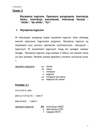 Wyra enia logiczne. Operatory przypisania. Instrukcja