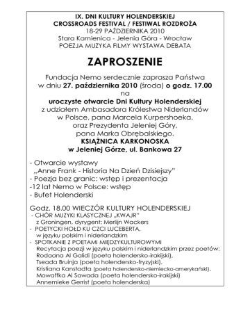 IX. DNI KULTURY HOLENDERSKIEJ CROSSROADS FESTIVAL / FESTIWAL ROZDROŻA 18-29 PAŹDZIERNIKA 2010 Stara Kamienica - Jelenia Góra - Wrocław POEZJA MUZYKA FILMY WYSTAWA DEBATA ZAPROSZENIE Fundacja Nemo serdecznie zaprasza Państwa w dniu 27. października 2010 (środa) o godz. 17.00 na uroczyste otwarcie Dni Kultury Holenderskiej z udziałem Ambasadora Królestwa Niderlandów w Polsce, pana Marcela Kurpershoeka, oraz Prezydenta Jeleniej Góry, pana Marka Obrębalskiego. KSIĄŻNICA KARKONOSKA w Jeleniej Górze, ul. Bankowa 27 - Otwarcie wystawy „Anne Frank - Historia Na Dzień Dzisiejszy” - Poezja bez granic: wstęp i prezentacja -12 lat Nemo w Polsce: wstęp - Bufet Holenderski Godz. 18.00 WIECZÓR KULTURY HOLENDERSKIEJ - CHÓR MUZYKI KLASYCZNEJ „KWAJR” z Groningen, dyrygent: Merlijn Wackers - POETYCKI HOŁD KU CZCI LUCEBERTA, w języku polskim i niderlandzkim - SPOTKANIE Z POETAMI MIĘDZYKULTUROWYMI Recytacja poezji w języku polskim i niderlandzkim przez poetów: Rodaana Al Galidi (poeta holendersko-irakijski), Tseada Bruinja (poeta holendersko-fryzyjski), Kristiana Kanstadta (poeta holendersko-niemiecko-amerykański), Mowaffka Al Sawada (poeta holendersko-irakijski) Annemieke Gerrist (poeta holenderska) dni kultury holenderskie FESTIWAL ´ ROZDROZA 18-29 października 2010 poezja muzyka filmy wystawa i debata POEZJA BEZ GRANIC: poeci międzykulturowi: Rodaan Al Galidi, Mowaffk Al Sawad, Tsead Bruinja, Kristian Kanstadt, Annemieke Gerrist. Hołd ku czci Luceberta Tłumacze poezji: Karol Lesman, Anita Jones Debska, Józef Zaprucki, Marcel Kurpershoek KONCERTY CHÓRÓW HOLENDERSKICH „Mila” i „Kwajr” FILMY HOLENDERSKIE: retrospektywa filmów Paula Verhoevena WYSTAWA ANNY FRANK i FREE2CHOOSE, debata na temat granic wolności STARA KAMIENICA CENTRUM INFORMACJI TURYSTYCZNEJ: wtorek, 19.10, godz.11.00: Otwarcie wystawy fotograficznej „12 lat Nemo w Polsce” i Chór „Mila” CHÓR MUZYKI WSCHODNIOEUROPEJSKIEJ MILA: Poniedziałek, 18.10, godz. 18.00: koncert w Świetlicy Wiejskiej w Chromcu Wtorek, 19.10, godz. 11.00: koncert w CIT w Starej Kamienicy Środa, 20.10, godz.17:30 sala Filharmonii w Jelenie Górze: warsztat z grupa Głosowanie Czwartek, 21.10, godz. 18.00: koncert w Kościele w Kopańcu Piątek, 22.10, godz. 18.00: koncert w Świetlicy Wiejskiej w Barcinku GIMNAZJUM: czwartek, 28.10, godz. 11.00: spotkanie z poetami z Holandii WROCŁAW KATEDRA FILOLOGII NIDERLANDZKIEJ UNIWERSYTETU WROCŁAWSKIEGO: Wtorek, 26.10, godz. 10.00 – 12.00: Konferencja: Odkrywanie granic języka i kultury KSIĘGARNIOKAWIARNIA VEGEDAJNIA NALANDA: Pl. Kościuszki 12, Wrocław Wtorek, 26.10, godz. 18:00: Poezja znikąd: wyprawa nieznaną ścieżką, poezja bez granic JELENIA GÓRA KOLEGIUM KARKONOSKE: środa 27.10, godz. 10.00 – 12.00: Konferencja: Odkrywanie granic języka i kultury. Straty i zyski w poezji międzykulturowej KSIĄŹNICA KARKONOSKA: środa, 27.10, godz. 17.00: Oficjalne otwarcie Festiwalu Rozdroża i wystawy „Anna Frank- historia na dzień dzisiejszy”, przez Ambasadora Królestwa Niderlandów w Polsce i Prezydenta Jeleniej Góry godz. 18.00: Wieczór Kultury Holenderskiej: Chór muzyki klasycznej „Kwajr”; Poetycki hołd ku czci Luceberta; Spotkanie z poetami międzykulturowymi CHÓR MUZYKI KLASYCZNEJ „KWAJR”: Poniedziałek, 25.10, godz. 18.00: Kościół w Wojcieszycach Wtorek, 26.10, godz. 18.00: Kościół Ewangelicko Augsburski w Cieplicach Środa, 27.10, godz. 18.00: Książnica Karkonoska w Jeleniej Górze FILMY HOLENDERSKIE: RETROSPEKTYWA FILMÓW PAULA VERHOEVENA: Sala Kameralna JCK, ul. 1 Maja 60 Czwartek, 28.10, godz. 18.30: Tureckie Owoce / Turks Fruit Piątek, 29.10, godz. 16.30: Żołnierz Orański / Soldaat van Oranje Piątek, 29.10, godz. 18.30: Czwarty Człowiek / De vierde man Fundacja Literatury Niderlandzki ej FESTIWAL ROZDROŻA: ODKRYJ PRZESTRZEŃ MIĘDZY JĘZYKIEM I CZASEM Poezja bez granic - Wyzwania migracji Polsko-holenderska Fundacja Nemo już po raz dziewiąty organizuje Dni Kultury Holenderskiej w Polsce. Od roku 2003 odbywały się one w Starej Kamienicy, a od roku 2009 impreza ta funkcjonuje jako Festiwal Rozdroża (Crossroads Festival) w Jeleniej Górze. Tym razem po raz pierwszy jednym z miejsc wydarzeń będzie także Wrocław. Przyczyną powstania Festiwalu Rozdroża jest zjawisko postrzegania kultury migracyjnej w większości krajów współczesnej Europy, jako małowartościowej wobec dominujących kultur narodowych oraz coraz większa popularność partii nacjonalistycznych. Festiwal Rozdroża chce uświadomić, że kultura powstaje właśnie dzięki migracji i wielości języków, a kultura migracyjna jest niesłychanie wartościowa. Spotkanie holenderskich poetów interkulturowych, tłumaczy i chórów oraz organizacja wystaw odbędzie się dzięki Fundacji Nemo w nadgranicznym obszarze południowozachodniej Polski, blisko Karkonoszy, gdyż ten rejon jest sercem Europy, skrzyżowaniem kultur i języków. Na tym skrzyżowaniu będzie można zrozumieć, że historia Europy jest historią migracji, aż po dziś dzień. Każdy Europejczyk jest migrantem... Podczas festiwalu po raz pierwszy w Polsce zostanie pokazana odnowiona wystawa Anny Frank. Wraz z edukacyjnym projektem Free2Choose ma ona na celu wywołanie debaty na temat praw obywatelskich i granic wolności. Interkulturowa poezja i muzyka są dowodem, że „jeszcze Europa nie zginęła”. Dlatego serdecznie Państwa zapraszamy, jako migrantów, do wzięcia udziału we wspólnej podróży przez obszary ziemi niczyjej, pustkowia języków i kultur oraz rzadko odwiedzane rozdroża. Festiwal organizuje Fundacja NEMO z Kopańca-Międzylesia (Stara Kamienica) we współpracy z Miastem Jelenia Góra, Gminą Stara Kamienica, Kolegium Karkonoskim w Jeleniej Górze, Katedrą Filologii Niderlandzkiej Uniwersytetu Wrocławskiego, Jeleniogórskim Centrum Kultury, Książnicą Karkonoską oraz Fundacją Anny Frank z Amsterdamu. Festiwal odbywa się przy wsparciu Ambasady Królestwa