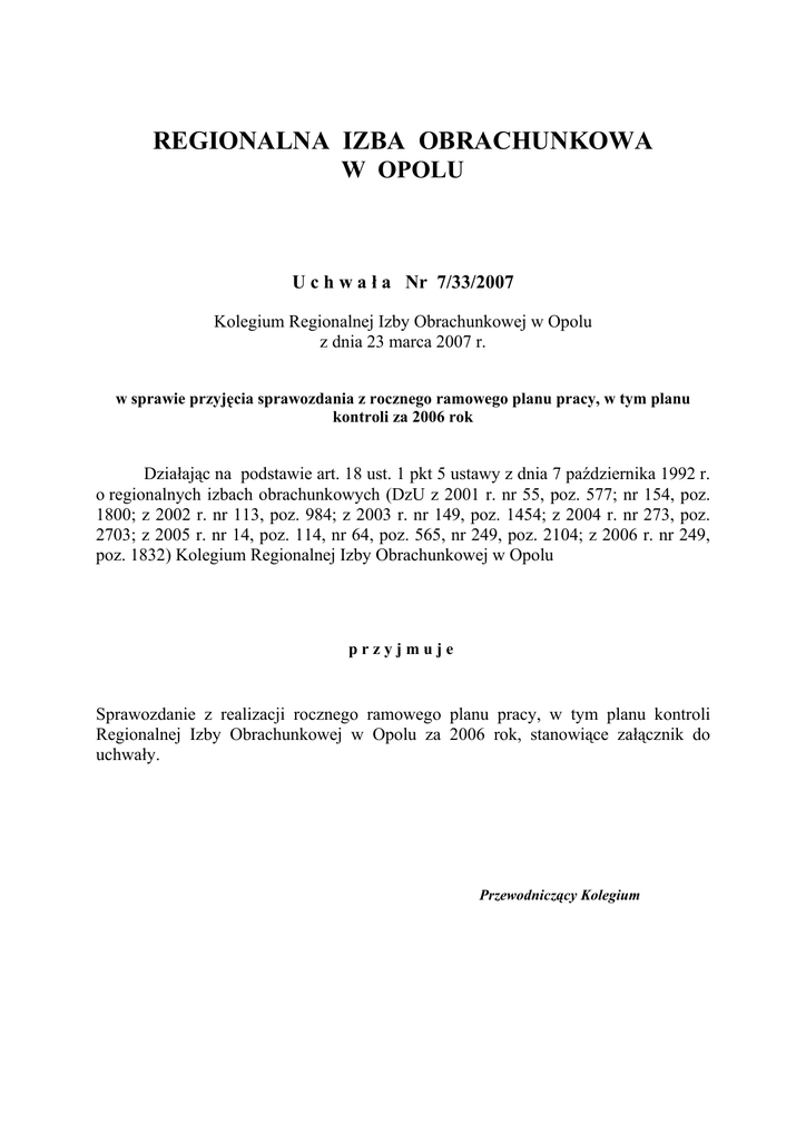 REGIONALNA IZBA OBRACHUNKOWA W OPOLU U c h w a ł a Nr 7/33/2007 Kolegium Regionalnej Izby Obrachunkowej w Opolu z dnia 23 marca 2007 r. w sprawie przyjęcia sprawozdania z rocznego ramowego planu pracy, w tym planu kontroli za 2006 rok Działając na podstawie art. 18 ust. 1 pkt 5 ustawy z dnia 7 października 1992 r. o regionalnych izbach obrachunkowych (DzU z 2001 r. nr 55, poz. 577; nr 154, poz. 1800; z 2002 r. nr 113, poz. 984; z 2003 r. nr 149, poz. 1454; z 2004 r. nr 273, poz. 2703; z 2005 r. nr 14, poz. 114, nr 64, poz. 565, nr 249, poz. 2104; z 2006 r. nr 249, poz. 1832) Kolegium Regionalnej Izby Obrachunkowej w Opolu przyjmuje Sprawozdanie z realizacji rocznego ramowego planu pracy, w tym planu kontroli Regionalnej Izby Obrachunkowej w Opolu za 2006 rok, stanowiące załącznik do uchwały. Przewodniczący Kolegium Sprawozdanie z Ramowego planu pracy RIO w Opolu za 2006 r. I. ZADANIA W ZAKRESIE ORGANIZACJI 1. Opracować roczne sprawozdanie z realizacji ramowego planu pracy Izby za 2005 r. wraz ze sprawozdaniem z realizacji planu kontroli. Rozpatrzyć je na posiedzeniu Kolegium Izby. WIAS przy współpracy z kierownikami komórek organizacyjnych przygotował w terminie sprawozdanie z realizacji ramowego planu pracy Izby za 2005 rok i przedstawił je na posiedzeniu Kolegium. Sprawozdanie zostało przyjęte przez Kolegium uchwałą nr 5/21/2006 z 30 marca 2006 r. 2. Opracować sprawozdanie z wykonania budżetu RIO za 2005 r. wraz z informacją opisową. Rozpatrzyć je na posiedzeniu Kolegium. Sprawozdanie z wykonania budżetu RIO w Opolu za 2005 r. wraz z informacją opisową opracowano w terminie i przedstawiono Kolegium. Sprawozdanie zostało przyjęte przez Kolegium uchwałą 5/20/2006 z dnia 30 marca 2006 r. 3. Rozpatrzyć sprawozdania z działalności kontrolnej i informacyjno – szkoleniowej. Kolegium rozpatrzyło sprawozdania z działalności kontrolnej oraz informacyjno – szkoleniowej i przyjęło je odpowiednio uchwałami nr 5/22/2006 i 5/23/2006 z dnia 30 marca 2006 r. 4. Sporządzić roczne sprawozdanie o udzielonych zamówieniach publicznych i przekazać Prezesowi Urzędu Zamówień Publicznych. Sporządzono sprawozdanie z udzielonych zamówień publicznych zgodnie z przepisami prawa i w dniu 25 stycznia 2006 r. przekazano do Urzędu Zamówień Publicznych. 5. Sporządzić bilans RIO za 2005 r. Bilans RIO w Opolu za 2005 r. sporządzono zgodnie z obowiązującymi przepisami i przekazano w dniu 31 marca 2006 r. do MSWiA. 6. Sporządzić plan rzeczowy i finansowy na 2006 r. rachunku dochodów własnych służący do realizacji zadań w zakresie działalności szkoleniowej i informacyjnej. Plan rzeczowy zawierający przewidywaną ilość i zakres tematyczny szkoleń dla jednostek samorządu terytorialnego opracował WIAS. Na podstawie planu rzeczowego Główna księgowa opracowała plan finansowy przychodów i wydatków rachunku dochodów własnych, który został zatwierdzony przez Prezesa RIO w Opolu w dniu 17 marca 2006 r. 7. Opracować układ wykonawczy budżetu RIO na 2006 r. i przekazać go do realizacji. Dysponent części budżetowej w piśmie z dnia 9 marca 2006 r. przekazał RIO w Opolu ostateczne kwoty dochodów i wydatków budżetowych wynikające z układu wykonawczego budżetu Państwa. Na podstawie tych danych sporządzono plan finansowy na 2006 r., który został zatwierdzony przez Prezesa RIO w Opolu w dniu 17 marca 2006 r. 8. W okresach kwartalnych analizować przebieg realizacji budżetu RIO ze szczególnym uwzględnieniem funduszu wynagrodzeń oraz wydatków rzeczowych. Przebieg wykonania budżetu Izby w 2006 r. analizowano na bieżąco. W okresach kwartalnych sporządzano opisową analizę z realizacji planu dochodów i wydatków budżetowych. Analiza ta zawierała szczegółowe omówienie zagadnień zawartych w piśmie MSWiA z dnia 13 kwietnia 2006 r. Nr DB-S-0372/3-100/2006 r. a w szczególności: − prawidłowość i terminowość pobierania dochodów, − zgodność wydatków z planowanym przeznaczeniem, − prawidłowość wykorzystania środków finansowych, w tym przebieg i zakres zrealizowanych zadań, − wykorzystanie środków finansowych z otrzymanych rezerw, − przestrzeganie realizacji procedur kontroli finansowej oraz przeprowadzania wstępnej oceny celowości zaciągniętych zobowiązań i dokonywania wydatków. Analizy kwartalne przekazywane były do Departamentu Budżetu Ministerstwa Spraw Wewnętrznych i Administracji. 9. Kontynuować realizację zadań inwestycyjnych w zakresie: − przebudowy wejścia do siedziby Izby wraz z podjazdem dla osób niepełnosprawnych, − elewacji budynku , − zakupu sprzętu komputerowego. Prace związane z przebudową wejścia i elewacją budynku od strony ul. Oleskiej rozpoczęto w marcu 2006 r., po otrzymaniu z MSWiA ostatecznego limitu wydatków inwestycyjnych. Zakres prac na I etapie dotyczył: wyboru projektanta do wykonania projektu budowlanego, wykonania projektu, uzyskania decyzji administracyjnych związanych z realizowanym zadaniem, a następnie udzielenia zamówienia, przy uwzględnieniu przepisów Prawo zamówień publicznych. We wrześniu 2006 r. dokonano wyboru wykonawcy w trybie z wolnej ręki (ogłoszone dwa przetargi nieograniczone na realizację tego zadania nie dały możliwości wyboru oferenta i zostały unieważnione). Wykonanie zadania w zakresie przebudowy wejścia, wykonania elewacji na frontowej części budynku zakończono 30.12.2006 r. Projekt przebudowy wejścia do siedziby RIO nie uwzględniał podjazdu dla osób niepełnosprawnych, gdyż warunki techniczne tej części budynku nie pozwalają na jego budowę. Podjazd ten planowany jest do wybudowania od strony podwórza. Zadanie to realizowane było wspólnie z SKO w Opolu. Łączne wydatkowano kwotę 179 883 zł, w tym udział SKO - 40 000 zł. W 2006 r. realizowano zakupy komputerów z budżetu Izby i rachunku dochodów własnych. W ramach środków inwestycyjnych z budżetu na zakup 7 laptopów i 6 zestawów ko