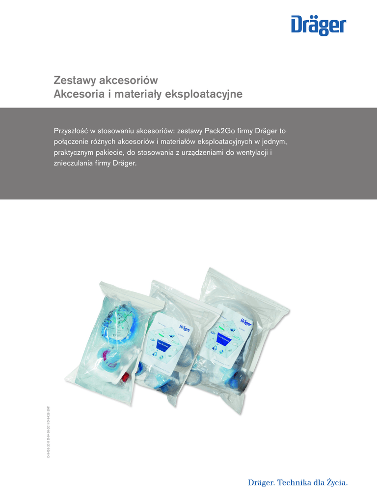 Zestawy akcesoriów Akcesoria i materiały eksploatacyjne D-9426-2011 D-9420-2011 D-9428-2011 Przyszłość w stosowaniu akcesoriów: zestawy Pack2Go firmy Dräger to połączenie różnych akcesoriów i materiałów eksploatacyjnych w jednym, praktycznym pakiecie, do stosowania z urządzeniami do wentylacji i znieczulania firmy Dräger. 02 | Zestawy akcesoriów Zalety Pack2Go Firma Dräger opracowała i oferuje szeroką gamę jednorazowych akcesoriów do stosowania w wentylacji i anestezjologii. Szpitale mogą teraz w prosty sposób zamawiać wszystkie istotne jednorazowe akcesoria w jednym pakiecie. Ta koncepcja ma na celu optymalizację procesów logistycznych i klinicznych, jak również zmniejszenie kosztów. ‒ Wszystkie wymagane produkty (np. niezbędne akcesoria do respiratora Evita) są kompleksowo dostarczane przez firmę Dräger. ‒ Minimalizacja czasu koniecznego na przygotowanie respiratora dla kolejnego pacjenta, bez opóźnień wynikających ze sterylizacji lub czasochłonnych czynności montażowych. ‒ Stosowanie Pack2Go z ich jednorazowymi komponentami zmniejsza ryzyko zakażeń oraz daje pewność, iż zawsze w użyciu znajdują się wyłącznie czyste klinicznie produkty.1) ‒ Wszystkie produkty, wyprodukowane aby spełniać najwyższe normy w dziedzinie techniki medycznej oraz bezpieczeństwa pacjenta, przetestowane są również pod kątem kompatybilności pracy z odpowiadającymi im urządzeniami firmy Dräger. 1)Na oddziałach intensywnej terapii na całym świecie, zakażenia wewnątrzszpitalne stanowią poważne wyzwanie dla zdrowia pacjentów oraz pracy personelu, utrudniając powrót do zdrowia, przedłużając pobyt w szpitalu oraz powodując wzrost kosztów związanych z leczeniem pacjenta. W Stanach Zjednoczonych i Europie respiratorowe zapalenie płuc jest najczęstszym powikłaniem na OIT. Procedury profilaktyczne polegają na minimalizacji zakażeń krzyżowych oraz stosowaniu najwyższej jakości akcesoriów wentylacyjnych. Ricks, D.: Germ Warfare, in: MS Magazine, 2007,43-45 Infection Control B.V.: Nosocomial Infections: What it is, what it does and how to treat, 2006, 3-10 Dodek P. et al.: Evidence-Based Clinical Practice Guideline for the Prevention of Ventilator Associated Pneumonia, in: Ann Intern Med., 2004, 141:305-13 Brun-Buisson, C.: Preventing ventilator associated pneumonia, in: BMJ, 2007, 334:871-2Dräger has developed and offers an extensive portfolio of disposable accessories for use in ventilation and anaesthesia. Zestawy akcesoriów | 03 Informacje zamówieniowe PACK2GO® — ZESTAWY DO WENTYLACJI EVITA Sztuk w opakowaniu Numer maskę pełnotwarzową 1 MP01650 maskę pełnotwarzową 1 MP01651 maskę pełnotwarzową 1 MP01652 maskę pełnotwarzową 1 MP01653 maskę pełnotwarzową 1 MP01654 maskę pełnotwarzową 1 MP01655 Pack2Go® Evita – zestaw akcesoriów do nieinwazyjnej wentylacji Zestaw zawiera: zastawkę wydechową Evita (8414776), układ oddechowy VentStar® Basic 180 (MP00349), filtr/HME TwinStar® 55 (MP01805) oraz: ClassicStar® SE NIV, rozmiar S (MP01573) ClassicStar® SE NIV, rozmiar M (MP01574) ClassicStar® SE NIV, rozmiar L (MP01575) NovaStar® SE NIV, rozmiar S (MP01579) NovaStar® SE NIV, rozmiar M (MP01580) NovaStar® SE NIV, rozmiar L (MP01581) Sztuk w opakowaniu Numer układ oddechowy VentStar® Basic 180 (MP00349) z jednorazową kuwetą CO2 dla 5 MP01656 układ oddechowy VentStar® Basic 180 (MP00349) 5 MP01657 5 MP01676 układ oddechowy VentStar® Coax 180 (współosiowy) (MP00356) 5 MP01677 Sztuk w opakowaniu Numer Pack2Go® Evita – zestaw akcesoriów do inwazyjnej wentylacji Zestaw zawiera: zastawkę wydechową Evita (8414776), filtr/HME TwinStar® 55 (MP01805), łącznik ErgoStar® CM45 (MP01845) oraz: dorosłych (MP01062) układ oddechowy VentStar® Coax 180 (współosiowy) (MP00356) z jednorazową kuwetą CO2 dla dorosłych (MP01062) SAVINA Pack2Go® Savina – zestaw akcesoriów do inwazyjnej wentylacji Zestaw zawiera: zastawkę wydechową Savina (MP01061), filtr/HME TwinStar® (MP01805), łącznik ErgoStar® CM45 (MP01845) oraz: 04 | Zestawy akcesoriów układ oddechowy VentStar® Coax 180 (współosiowy) (MP00356) układ oddechowy VentStar® Basic 180 (MP00349) 5 MP01673 5 MP01674 CARINA Pack2Go® Carina – zestaw akcesoriów do nieinwazyjnej wentylacji Sztuk w opakowaniu Numer maskę pełnotwarzową 1 MP01660 maskę pełnotwarzową 1 MP01661 maskę pełnotwarzową 1 MP01662 maskę pełnotwarzową 1 MP01663 maskę pełnotwarzową 1 MP01664 maskę pełnotwarzową 1 MP01665 Zestaw zawiera: filtr CareStar 30, (MP01770), układ oddechowy VentStar Carina LeakV (MP00312) oraz: NovaStar® SE NIV, rozmiar S (MP01579) NovaStar® SE NIV, rozmiar M (MP01580) NovaStar® SE NIV, rozmiar L (MP01581) ClassicStar® SE NIV, rozmiar S (MP01573) ClassicStar® SE NIV, rozmiar M (MP01574) ClassicStar® SE NIV, rozmiar L (MP01575) OXYLOG Sztuk w opakowaniu Numer filtr/HME TwinStar® 55 (MP01805) z jednorazową kuwetą CO2 dla dorosłych 5 MP01668 filtr/HME TwinStar® 55 (MP01805) 5 MP01669 Sztuk w opakowaniu Numer 10 MP01671 Pack2Go® Oxylog 3000/3000plus/2000 plus – zestaw akcesoriów do nieinwazyjnej wentylacji Zestaw zawiera: układ oddechowy VentStar® Oxylog 3000 Family, 2000 plus 150 (5702871), maskę twarzową ComfortStar®, rozmiar 5 (MP01515), miękką opaskę mocującą, rozmiar L (MP01562) oraz: (MP01062) ZESTAW MINI Pack2Go® – zestaw mini do inwazyjnej wentylacji Zestaw zawiera: filtr/HME TwinStar® 55 (MP01805) oraz łącznik ErgoStar® CM45 (MP01845) Zestawy akcesoriów | 05 ANESTEZJOLOGIA Sztuk w opakowaniu Numer maskę twarzową ComfortStar®, rozmiar 5 (MP01515) 5 MP01680 maskę twarzową ComfortStar® o zapachu miętowym, rozmiar 5 (MP01545) 5 MP01681 Pack2Go® Watertrap – zestaw anestezjologiczny dla dorosłych Sztuk w opakowaniu Numer 5 MP01682 Sztuk w opakowaniu Numer maskę twarzową ComfortStar®, rozmiar 3 (MP01513) 5 MP01683 maskę twarzową ComfortStar® o zapachu truskawkowym, rozmiar 3