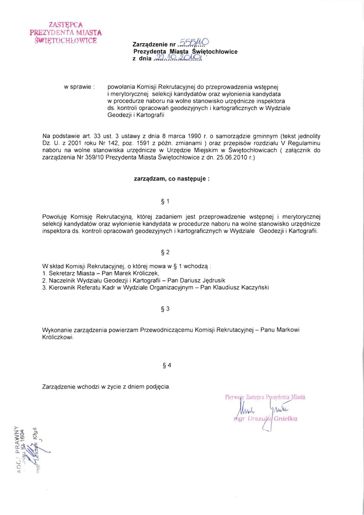 Z~-n;PCA PRElYD E, ITA MIASTA 1';1'0 ' HV WlCE w sprawie : -:hF\~O Zarz"dzenie nr. LJ04: ... Prezydenta Miasta Swi~toch.owice z dnia . ...19.~ J'.C>Y2( ' powolania Komisji Rekrutacyjnej do przeprowadzenia wst~pnej i merytorycznej selekcji kandydat6w oraz wylonienia kandydata w procedurze naboru na wolne stanowisko urz~dnicze inspektora ds. kontroli opracowan geodezyjnych i kartograficznych w Wydziale Geodezji i Kartografii Na podstawie art. 33 ust. 3 ustawy z dnia 8 marca 1990 r. 0 samorzqdzie gminnym (tekst jednolity Dz. U. z 2001 roku Nr 142, poz . 1591 z p6zn . zmianami ) oraz przepis6w rozdzialu V Regulaminu naboru na wolne stanowiska urz~dnicze w Urz~dzie Miejskim w Swi~tochlowicach ( zalqcznik do zarzqdzenia Nr 359/10 Prezydenta Miasta Swi~tochlowice z dn. 25 .06 .2010 r.) zarz"dzam, co nast~puje : §1 Powoluj~ Komisj~ Rekrutacyjnq, kt6rej zadaniem jest przeprowadzenie wst~pnej i merytorycznej selekcji kandydat6w oraz wylonienie kandydata w procedurze naboru na wolne stanowisko urz~dnicze inspektora ds. kontroli opracowan geodezyjnych i kartograficznych w Wydziale Geodezji i Kartografii. §2 W sklad Komisji Rekrutacyjnej , 0 kt6rej mowa w § 1 wchodzq : 1. Sekretarz Miasta - Pan Marek Kr6liczek, 2. Naczelnik Wydzialu Geodezji i Kartografii - Pan Dariusz J~drusik 3. Kierownik Referatu Kadr w Wydziale Organizacyjnym - Pan Klaudiusz Kaczynski §3 Wykonanie zarzqdzenia powierzam Przewodniczqcemu Komisji Rekrutacyjnej - Panu Markowi Kr6liczkowi . §4 Zarzqdzenie wchodzi w zycie z dniem podj~cia. Pi( r ~ ~ ~a·( pc:! Pf.ll\'~ ,> \Ha la .tv f 9' u ..~;tw'~ Zt/ Gruelka