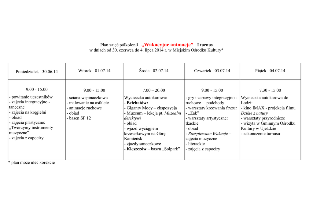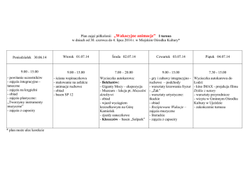Plan zajęć półkolonii „Wakacyjne animacje” I turnus w dniach od 30. czerwca do 4. lipca 2014 r. w Miejskim Ośrodku Kultury* Poniedziałek 30.06.14 Wtorek 01.07.14 Środa 02.07.14 Czwartek 03.07.14 Piątek 04.07.14 9.00 - 15.00 9.00 - 15.00 7.00 – 20.00 9.00 - 15.00 7.30 - 15.00 Wycieczka autokarowa: - Bełchatów: - Giganty Mocy – ekspozycja - Muzeum – lekcja pt. Muzealni detektywi - obiad - wjazd wyciągiem krzesełkowym na Górę Kamieńsk - zjazdy saneczkowe - Kleszczów – basen „Solpark” - gry i zabawy integracyjno ruchowe – podchody - warsztaty kreowania fryzur - „Żak” - warsztaty artystyczne: tkackie - obiad - Rozśpiewane Wakacje – zajęcia muzyczne - literackie - zajęcia z capoeiry - powitanie uczestników - zajęcia integracyjno taneczne - zajęcia na kręgielni - obiad - zajęcia plastyczne: „Tworzymy instrumenty muzyczne” - zajęcia z capoeiry * plan może ulec korekcie - ściana wspinaczkowa - malowanie na asfalcie - animacje ruchowe - obiad - basen SP 12 Wycieczka autokarowa do Łodzi: - kino IMAX - projekcja filmu Dzikie z natury - warsztaty przyrodnicze - wizyta w Gminnym Ośrodku Kultury w Ujeździe - zakończenie turnusu Plan zajęć półkolonii „Wakacyjne animacje” II turnus w dniach 7. – 11. lipca 2014 r. w Miejskim Ośrodku Kultury* Poniedziałek 07.07.14 Wtorek 08.07.14 Środa 09.07.14 Czwartek 10.07.14 Piątek 11.07.14 9.00 – 15.00 9.00 – 15.00 7.00 – 20.00 9.00 – 15.00 9.00 – 15.00 Wycieczka autokarowa: - Nowa Słupia: - Centrum Kulturalno Archeologiczne - Bodzentyn: - Muzeum Siekier - Zabytkowa Zagroda Czernikiewiczów - obiad - Adamów: - Prywatne Muzeum Ludowe - Sielpia: - Muzeum Techniki i zagłębia Staropolskiego - Opoczno - basen - warsztaty wizażu „Żak” – makijaż sceniczny - XI Miejski Konkurs Piosenki Wakacyjnej NATURA-lnie piosenka - parada instrumentów - wspólna piosenka nauczona podczas Rozśpiewanych wakacji - obiad - warsztaty kulinarne: Zdrowe przekąski - powitanie uczestników - wyjazd do skansenu „Niebowo” w Wincentynowie - obiad - Rozśpiewane Wakacje – zajęcia muzyczne - kalambury literackie - warsztaty artystyczne: papier czerpany * plan może ulec korekcie - wyjście na strzelnicę „Strzelec” - obiad - warsztaty artystyczne: - glina - zajęcia integracyjno – taneczne Dzień bardzo sportowy: - zajęcia - ściana wspinaczkowa MDK - zajęcia na kręgielni NAVI - obiad - wyjście na basen SP 12 - zakończenie turnusu Plan zajęć półkolonii „Wakacyjne animacje” III turnus w dniach 14. – 18. lipca 2014 r. w Miejskim Ośrodku Kultury* Poniedziałek 14.07.14 Wtorek 15.07.14 Środa 16.07.14 Czwartek 17.07.14 Piątek 18.07.14 9.00 – 15.00 9.00 – 15.00 7.00 – 20.00 9.00 – 15.00 9.00 – 15.00 - powitanie uczestników - zajęcia integracyjne - wyjście na kręgielnię - obiad - muzeum – Poszukiwanie skarbów * plan może ulec korekcie - spacer do Nagórzyc - zwiedzanie Grot - obiad - interpretacja plastyczna Legendy o Zbóju Madeju – zajęcia artystyczne - Opowieści dziwne Wycieczka autokarowa: - Częstochowa: - Muzeum Produkcji Zapałek - Wycieczka do Zaczarowanego lasu - Olsztyn: - zwiedzanie ruin zamku - obiad - Kleszczów – basen „Solpark” - wyjście do Sali Zabaw Kajtek - warsztaty artystyczne: malowanie toreb - kalambury filmowe - obiad - wyjście na basen SP 12 - wyjście do Parku Linowego - obiad - animacje ruchowe – Gry nasze, naszych rodziców i dziadków - warsztaty wizażu i stylizacji „Żak” – Mini analiza kolorystyczna, brokatowe tatuaże - zakończenie turnusu