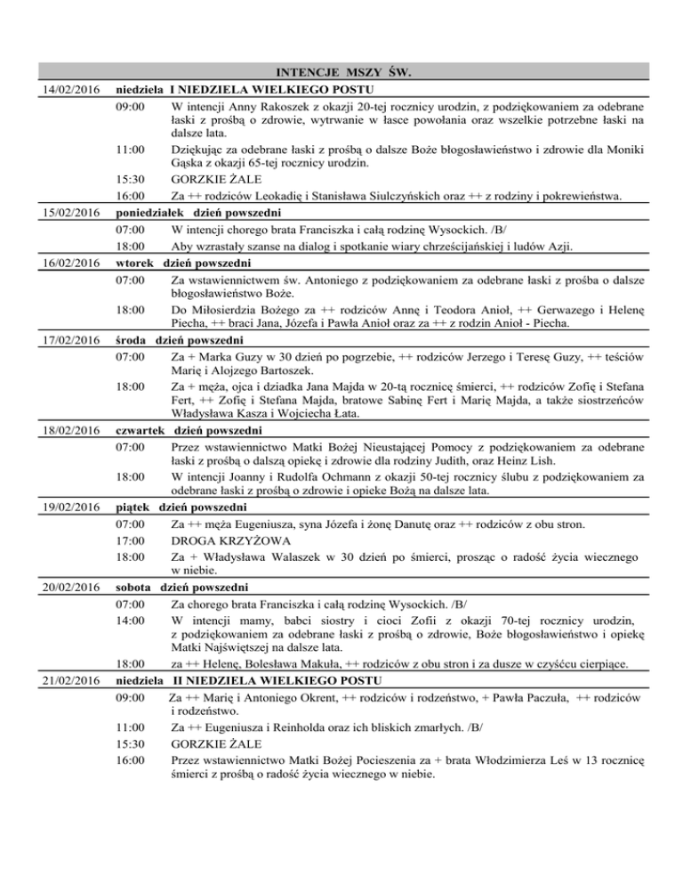 14/02/2016 15/02/2016 16/02/2016 17/02/2016 18/02/2016 19/02/2016 20/02/2016 21/02/2016 INTENCJE MSZY ŚW. niedziela I NIEDZIELA WIELKIEGO POSTU 09:00 W intencji Anny Rakoszek z okazji 20-tej rocznicy urodzin, z podziękowaniem za odebrane łaski z prośbą o zdrowie, wytrwanie w łasce powołania oraz wszelkie potrzebne łaski na dalsze lata. 11:00 Dziękując za odebrane łaski z prośbą o dalsze Boże błogosławieństwo i zdrowie dla Moniki Gąska z okazji 65-tej rocznicy urodzin. 15:30 GORZKIE ŻALE 16:00 Za ++ rodziców Leokadię i Stanisława Siulczyńskich oraz ++ z rodziny i pokrewieństwa. poniedziałek dzień powszedni 07:00 W intencji chorego brata Franciszka i całą rodzinę Wysockich. /B/ 18:00 Aby wzrastały szanse na dialog i spotkanie wiary chrześcijańskiej i ludów Azji. wtorek dzień powszedni 07:00 Za wstawiennictwem św. Antoniego z podziękowaniem za odebrane łaski z prośba o dalsze błogosławieństwo Boże. 18:00 Do Miłosierdzia Bożego za ++ rodziców Annę i Teodora Anioł, ++ Gerwazego i Helenę Piecha, ++ braci Jana, Józefa i Pawła Anioł oraz za ++ z rodzin Anioł - Piecha. środa dzień powszedni 07:00 Za + Marka Guzy w 30 dzień po pogrzebie, ++ rodziców Jerzego i Teresę Guzy, ++ teściów Marię i Alojzego Bartoszek. 18:00 Za + męża, ojca i dziadka Jana Majda w 20-tą rocznicę śmierci, ++ rodziców Zofię i Stefana Fert, ++ Zofię i Stefana Majda, bratowe Sabinę Fert i Marię Majda, a także siostrzeńców Władysława Kasza i Wojciecha Łata. czwartek dzień powszedni 07:00 Przez wstawiennictwo Matki Bożej Nieustającej Pomocy z podziękowaniem za odebrane łaski z prośbą o dalszą opiekę i zdrowie dla rodziny Judith, oraz Heinz Lish. 18:00 W intencji Joanny i Rudolfa Ochmann z okazji 50-tej rocznicy ślubu z podziękowaniem za odebrane łaski z prośbą o zdrowie i opieke Bożą na dalsze lata. piątek dzień powszedni 07:00 Za ++ męża Eugeniusza, syna Józefa i żonę Danutę oraz ++ rodziców z obu stron. 17:00 DROGA KRZYŻOWA 18:00 Za + Władysława Walaszek w 30 dzień po śmierci, prosząc o radość życia wiecznego w niebie. sobota dzień powszedni 07:00 Za chorego brata Franciszka i całą rodzinę Wysockich. /B/ 14:00 W intencji mamy, babci siostry i cioci Zofii z okazji 70-tej rocznicy urodzin, z podziękowaniem za odebrane łaski z prośbą o zdrowie, Boże błogosławieństwo i opiekę Matki Najświętszej na dalsze lata. 18:00 za ++ Helenę, Bolesława Makuła, ++ rodziców z obu stron i za dusze w czyśćcu cierpiące. niedziela II NIEDZIELA WIELKIEGO POSTU 09:00 Za ++ Marię i Antoniego Okrent, ++ rodziców i rodzeństwo, + Pawła Paczuła, ++ rodziców i rodzeństwo. 11:00 Za ++ Eugeniusza i Reinholda oraz ich bliskich zmarłych. /B/ 15:30 GORZKIE ŻALE 16:00 Przez wstawiennictwo Matki Bożej Pocieszenia za + brata Włodzimierza Leś w 13 rocznicę śmierci z prośbą o radość życia wiecznego w niebie.