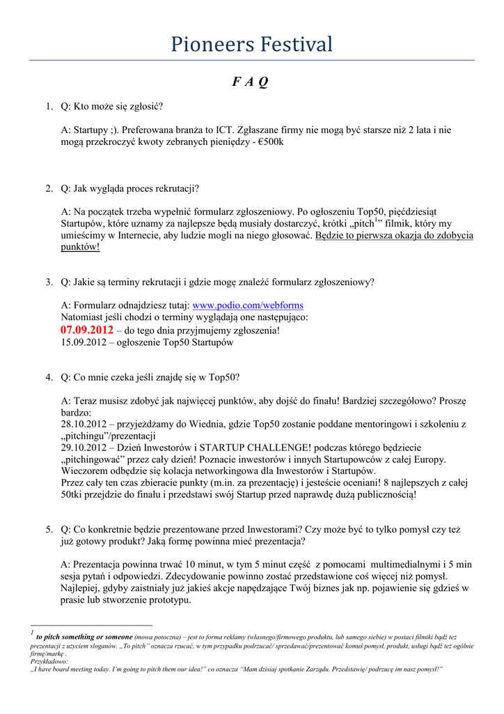 PioneersFestival FAQ 1. Q: Kto może się zgłosić? A: Startupy ;). Preferowana branża to ICT. Zgłaszane firmy nie mogą być starsze niż 2 lata i nie mogą przekroczyć kwoty zebranych pieniędzy - €500k 2. Q: Jak wygląda proces rekrutacji? A: Na początek trzeba wypełnić formularz zgłoszeniowy. Po ogłoszeniu Top50, pięćdziesiąt Startupów, które uznamy za najlepsze będą musiały dostarczyć, krótki „pitch1” filmik, który my umieścimy w Internecie, aby ludzie mogli na niego głosować. Będzie to pierwsza okazja do zdobycia punktów! 3. Q: Jakie są terminy rekrutacji i gdzie mogę znaleźć formularz zgłoszeniowy? A: Formularz odnajdziesz tutaj: www.podio.com/webforms Natomiast jeśli chodzi o terminy wyglądają one następująco: 07.09.2012 – do tego dnia przyjmujemy zgłoszenia! 15.09.2012 – ogłoszenie Top50 Startupów 4. Q: Co mnie czeka jeśli znajdę się w Top50? A: Teraz musisz zdobyć jak najwięcej punktów, aby dojść do finału! Bardziej szczegółowo? Proszę bardzo: 28.10.2012 – przyjeżdżamy do Wiednia, gdzie Top50 zostanie poddane mentoringowi i szkoleniu z „pitchingu”/prezentacji 29.10.2012 – Dzień Inwestorów i STARTUP CHALLENGE! podczas którego będziecie „pitchingować” przez cały dzień! Poznacie inwestorów i innych Startupowców z całej Europy. Wieczorem odbędzie się kolacja networkingowa dla Inwestorów i Startupów. Przez cały ten czas zbieracie punkty (m.in. za prezentację) i jesteście oceniani! 8 najlepszych z całej 50tki przejdzie do finału i przedstawi swój Startup przed naprawdę dużą publicznością! 5. Q: Co konkretnie będzie prezentowane przed Inwestorami? Czy może być to tylko pomysł czy też już gotowy produkt? Jaką formę powinna mieć prezentacja? A: Prezentacja powinna trwać 10 minut, w tym 5 minut część z pomocami multimedialnymi i 5 min sesja pytań i odpowiedzi. Zdecydowanie powinno zostać przedstawione coś więcej niż pomysł. Najlepiej, gdyby zaistniały już jakieś akcje napędzające Twój biznes jak np. pojawienie się gdzieś w prasie lub stworzenie prototypu. 1 to pitch something or someone (mowa potoczna) – jest to forma reklamy (własnego/firmowego produktu, lub samego siebie) w postaci filmiki bądź też prezentacji z użyciem sloganów. „To pitch” oznacza rzucać, w tym przypadku podrzucać/ sprzedawać/prezentować komuś pomysł, produkt, usługi bądź też ogólnie firmę/markę . Przykładowo: „I have board meeting today. I’m going to pitch them our idea!” co oznacza “Mam dzisiaj spotkanie Zarządu. Przedstawię/ podrzucę im nasz pomysł!” 6. Q: Jaka jest cena biletów i czy są możliwe jakieś zniżki? A: Top50 Startupów dostanie zaproszenia czyli po 2 bilety. Oferujemy również podstawowe Bilety dla Startupów na te dni, w których odbędzie się konferencja (30.09 i 31.09.2012) ich koszt wynosi 249€ za osobę. Są one możliwe do nabycia dla tych, którzy zgłaszali się ze swoimi Startupami, ale nie weszli do pierwszej 50. Dla osób, które nie zgłaszały się do udziału w naszym konkursie 249€ jest jedynie ceną „early bird2”(więc jeśli jesteś Startupowcem warto zgłosić się do konkursu, nawet jeśli uważasz, że nie masz szans!), dodatkowo oferujemy zniżkę dla studentów - 149€. Szczegółowe ceny biletów znajdziesz tutaj: www.pioneersfestival.com/tickets 7. Q: Czy oferujecie pomoc networkingową (w poszukiwaniu inwestorów, partnerów itd.) najlepszym Startupom po zakończeniu festiwalu? A: W dalszym ciągu utrzymujemy kontakt z zeszłorocznymi uczestnikami i staramy się im pomagać, kiedy tego potrzebują. Przykładowo Startup, który zwyciężył bardzo potrzebował pomocy w związku z PRem, ponieważ dużo różnych mediów było nimi zainteresowanych, a jego twórcy nie za bardzo wiedzieli jak sobie poradzić z takim nawałem zainteresowania medialnego, więc staramy się ich wspierać za pomocą jednego z naszych partnerów, który zajmuje się takimi sprawami. Aby poznać szczegóły na temat Pioneers Festival odwiedź stronę internetową http://www.pioneersfestival.com 2 Early bird – tak zwany wcześniak, ranny ptaszek lub coś co się dzieje przedterminowo. W przypadku ceny oznacza to zniżkę za wcześniejszy zakup, więc generalnie im wcześniej kupisz bilet tym lepiej dla Ciebie!