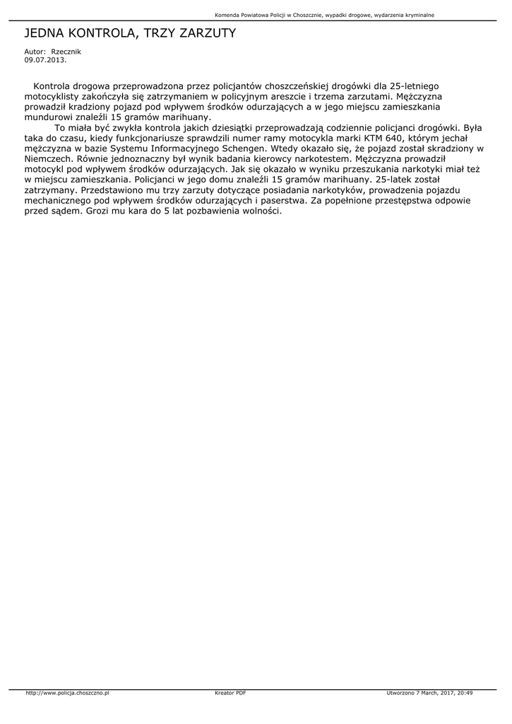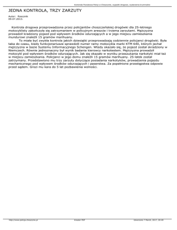 Komenda Powiatowa Policji w Choszcznie, wypadki drogowe, wydarzenia kryminalne JEDNA KONTROLA, TRZY ZARZUTY Autor: Rzecznik 09.07.2013. Kontrola drogowa przeprowadzona przez policjantów choszczeńskiej drogówki dla 25-letniego motocyklisty zakończyła się zatrzymaniem w policyjnym areszcie i trzema zarzutami. Mężczyzna prowadził kradziony pojazd pod wpływem środków odurzających a w jego miejscu zamieszkania mundurowi znaleźli 15 gramów marihuany. To miała być zwykła kontrola jakich dziesiątki przeprowadzają codziennie policjanci drogówki. Była taka do czasu, kiedy funkcjonariusze sprawdzili numer ramy motocykla marki KTM 640, którym jechał mężczyzna w bazie Systemu Informacyjnego Schengen. Wtedy okazało się, że pojazd został skradziony w Niemczech. Równie jednoznaczny był wynik badania kierowcy narkotestem. Mężczyzna prowadził motocykl pod wpływem środków odurzających. Jak się okazało w wyniku przeszukania narkotyki miał też w miejscu zamieszkania. Policjanci w jego domu znaleźli 15 gramów marihuany. 25-latek został zatrzymany. Przedstawiono mu trzy zarzuty dotyczące posiadania narkotyków, prowadzenia pojazdu mechanicznego pod wpływem środków odurzających i paserstwa. Za popełnione przestępstwa odpowie przed sądem. Grozi mu kara do 5 lat pozbawienia wolności. http://www.policja.choszczno.pl Kreator PDF Utworzono 7 March, 2017, 20:49