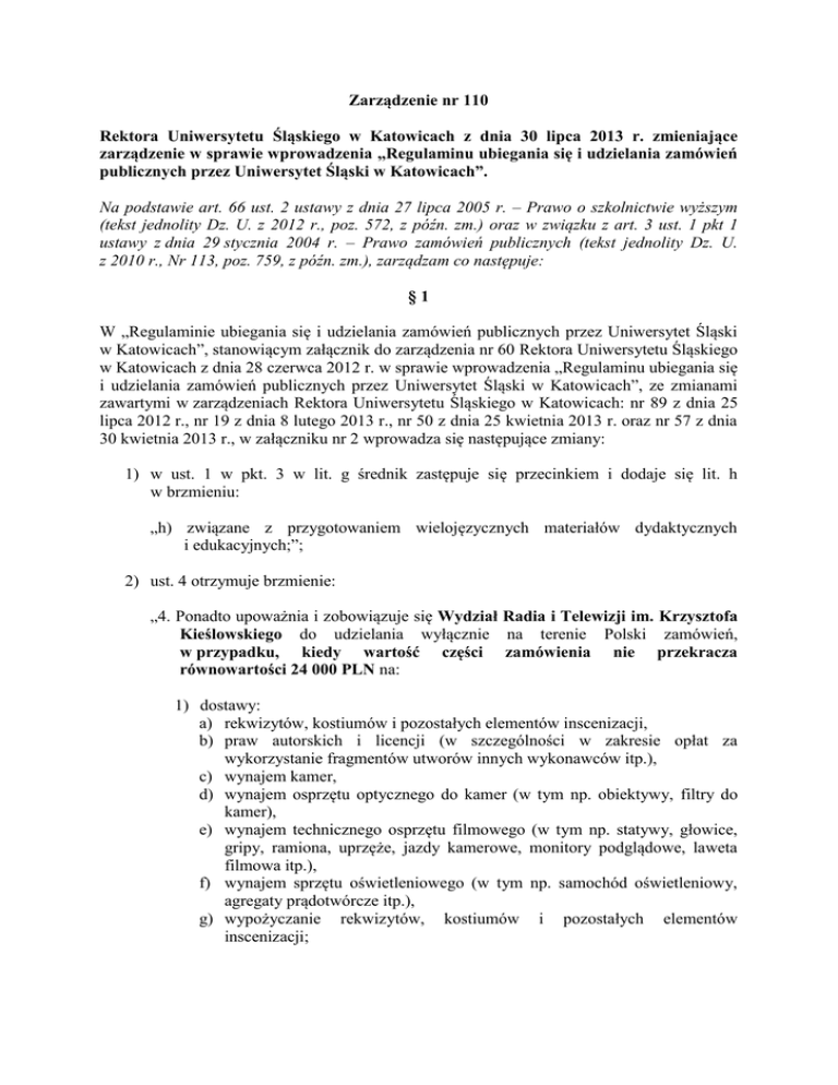 Zarządzenie nr 110 Rektora Uniwersytetu Śląskiego w Katowicach z dnia 30 lipca 2013 r. zmieniające zarządzenie w sprawie wprowadzenia „Regulaminu ubiegania się i udzielania zamówień publicznych przez Uniwersytet Śląski w Katowicach”. Na podstawie art. 66 ust. 2 ustawy z dnia 27 lipca 2005 r. – Prawo o szkolnictwie wyższym (tekst jednolity Dz. U. z 2012 r., poz. 572, z późn. zm.) oraz w związku z art. 3 ust. 1 pkt 1 ustawy z dnia 29 stycznia 2004 r. – Prawo zamówień publicznych (tekst jednolity Dz. U. z 2010 r., Nr 113, poz. 759, z późn. zm.), zarządzam co następuje: §1 W „Regulaminie ubiegania się i udzielania zamówień publicznych przez Uniwersytet Śląski w Katowicach”, stanowiącym załącznik do zarządzenia nr 60 Rektora Uniwersytetu Śląskiego w Katowicach z dnia 28 czerwca 2012 r. w sprawie wprowadzenia „Regulaminu ubiegania się i udzielania zamówień publicznych przez Uniwersytet Śląski w Katowicach”, ze zmianami zawartymi w zarządzeniach Rektora Uniwersytetu Śląskiego w Katowicach: nr 89 z dnia 25 lipca 2012 r., nr 19 z dnia 8 lutego 2013 r., nr 50 z dnia 25 kwietnia 2013 r. oraz nr 57 z dnia 30 kwietnia 2013 r., w załączniku nr 2 wprowadza się następujące zmiany: 1) w ust. 1 w pkt. 3 w lit. g średnik zastępuje się przecinkiem i dodaje się lit. h w brzmieniu: „h) związane z przygotowaniem wielojęzycznych materiałów dydaktycznych i edukacyjnych;”; 2) ust. 4 otrzymuje brzmienie: „4. Ponadto upoważnia i zobowiązuje się Wydział Radia i Telewizji im. Krzysztofa Kieślowskiego do udzielania wyłącznie na terenie Polski zamówień, w przypadku, kiedy wartość części zamówienia nie przekracza równowartości 24 000 PLN na: 1) dostawy: a) rekwizytów, kostiumów i pozostałych elementów inscenizacji, b) praw autorskich i licencji (w szczególności w zakresie opłat za wykorzystanie fragmentów utworów innych wykonawców itp.), c) wynajem kamer, d) wynajem osprzętu optycznego do kamer (w tym np. obiektywy, filtry do kamer), e) wynajem technicznego osprzętu filmowego (w tym np. statywy, głowice, gripy, ramiona, uprzęże, jazdy kamerowe, monitory podglądowe, laweta filmowa itp.), f) wynajem sprzętu oświetleniowego (w tym np. samochód oświetleniowy, agregaty prądotwórcze itp.), g) wypożyczanie rekwizytów, kostiumów i pozostałych elementów inscenizacji; 2) usługi: a) montaż filmów, b) budowa dekoracji, c) obsługa i zabezpieczenie planu filmowego.”. §2 Zarządzenie wchodzi w życie z dniem podpisania. REKTOR Prof. zw. dr hab. Wiesław Banyś 2