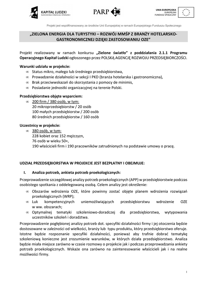 Projekt jest współfinansowany ze środków Unii Europejskiej w ramach Europejskiego Funduszu Społecznego „ZIELONA ENERGIA DLA TURYSTYKI – ROZWÓJ MMŚP Z BRANŻY HOTELARSKOGASTRONOMICZNEJ DZIĘKI ZASTOSOWANIU OZE” Projekt realizowany w ramach konkursu „Zielone światło” z poddziałania 2.1.1 Programu Operacyjnego Kapitał Ludzki ogłoszonego przez POLSKĄ AGENCJĘ ROZWOJU PRZEDSIĘBIORCZOŚCI. Warunki udziału w projekcie: • Status mikro, małego lub średniego przedsiębiorstwa, • Prowadzenie działalności w sekcji I PKD (branża hotelarska i gastronomiczna), • Brak przeciwwskazań do skorzystania z pomocy de minimis, • Posiadanie jednostki organizacyjnej na terenie Polski. Przedsiębiorstwa objęte wsparciem: • 200 firm / 380 osób, w tym: 20 mikroprzedsiębiorstw / 20 osób 100 małych przedsiębiorstw / 200 osób 80 średnich przedsiębiorstw / 160 osób Uczestnicy w projekcie: • 380 osób, w tym: 228 kobiet oraz 152 mężczyzn, 76 osób w wieku 50+, 190 właścicieli firm i 190 pracowników zatrudnionych na podstawie umowy o pracę. UDZIAŁ PRZEDSIĘBIORSTWA W PROJEKCIE JEST BEZPŁATNY I OBEJMUJE: I. Analiza potrzeb, ankieta potrzeb proekologicznych: Przeprowadzenie szczegółowej analizy potrzeb proekologicznych (APP) w przedsiębiorstwie podczas osobistego spotkania z oddelegowaną osobą. Celem analizy jest określenie: • • • Obszarów wdrożenia OZE, które powinny zostać objęte planem wdrożenia rozwiązań proekologicznych (WRP); Luk kompetencyjnych uniemożliwiających przedsiębiorstwu wdrożenie OZE w ww. obszarach; Optymalnej tematyki szkoleniowo-doradczej dla przedsiębiorstwa, wytypowania uczestników szkoleń i doradztwa. Przeprowadzenie pogłębionej analizy potrzeb dot. specyfiki działalności firmy i jej otoczenia będzie dostosowane w zależności od wielkości, branży lub typu produktu, który przedsiębiorstwo oferuje. Istotne będzie rozpoznanie specyfiki działalności, ponieważ aby trafnie dobrać tematykę szkoleniową konieczne jest zrozumienie warunków, w których działa przedsiębiorstwo. Analiza będzie miała miejsce zarówno w czasie rozmowy o projekcie jak i podczas przeprowadzania ankiety potrzeb proekologicznych. Wskaże ona zarówno na zainteresowanie właścicieli jak i na realne możliwości firmy. 1 Projekt jest współfinansowany ze środków Unii Europejskiej w ramach Europejskiego Funduszu Społecznego II. Szkolenia: Założenia szkoleniowe w projekcie: • • • • • • Średnio 8 osób w grupie, Jedno szkolenie trwa 2 dni (8 godzin szkoleniowych / dzień), Przedsiębiorstwo może skorzystać z 8 osobodni szkoleń, tj. jedna osoba korzystająca ze szkolenia to 2 osobodni, 2 osoby to 4 osobodni itp., Miejsce szkolenia – dogodne lokalizacyjnie dla uczestników, Szkolenia przeprowadzone będą w odstępach dogodnych dla przedsiębiorców, W ramach szkolenia uczestnik otrzymuje: materiały szkoleniowe, certyfikat, wyżywienie Tematyka szkoleń obejmie wybrane z następujących tematów: − Kolektory słoneczne, powietrzne pompy cieplne – darmowe źródło ciepłej wody użytkowej, − Fotowoltaika – słoneczne źródło energii elektrycznej, systemy dołączone do sieci oraz systemy autonomiczne, − Budownictwo energooszczędne i pasywne w branży hotelarsko-gastronomicznej – techniczne możliwości oszczędzania energii poprzez prawidłowe projektowanie i przeprojektowanie obiektu turystycznego, − Wentylacja z rekuperacją – efektywny sposób zarządzania rozprowadzaniem energii, − Źródła i możliwości finansowania proekologicznych rozwiązań w zakresie OZE, − Zarządzanie rozproszonymi źródłami energii w obiekcie wraz z optymalizacją energetyczną, − Mikroinstalacje wiatrowe w turystyce – aspekty techniczne i energetyczne, − Gruntowe pompy i wymienniki ciepła – tanie źródła ciepła z ziemi, − Prawne aspekty wdrażania OZE w MMŚP w branży hotelarsko-gastronomicznej, − Korzyści marketingowe ze stosowania OZE w branży turystycznej, − Systemy wsparcia proekologicznych inwestycji energetycznych – dotacje na OZE Termin szkoleń będzie dostosowany do możliwości przedsiębiorstw. Możliwe jest stworzenie grup weekendowych. III. Doradztwo poszkoleniowe i opracowanie planu wdrożenia rozwiązań proekologicznych: Założenia doradztwa w projekcie: • • Indywidualne spotkanie z właścicielem firmy lub osobą oddelegowaną w miejscu wskazanym przez beneficjenta projektu, Każdemu przedsiębiorstwu przysługuje 16 h doradztwa (średnio po 4h doradztwa po każdym szkoleniu). Cel doradztwa: Opracowanie dla przedsiębiorstwa planu wdrożenia rozwiązań proekologicznych (WRP) w obszarze OZE, opartych o wyniki analizy potrzeb proekologicznych (APP), tematy szkoleniowe i efekty doradztwa poszkoleniowego. Plan WRP będzie zawierał opis obszarów, dla których będzie realizowane wdrożenie OZE, opis i harmonogram planowanego wdrożenia, zestaw wskaźników do pomiaru skuteczności wdrożenia. Plan WRP przekazany zostanie przedsiębiorcy w czasie sesji doradztwa. Realizacja planów WRP będzie ewaluowana w okresie do 3 miesięcy od ich opracowania. 2 Projekt jest współfinansowany ze środków Unii Europejskiej w ramach Europejskiego Funduszu Społecznego Podsumowując – udział w projekcie jest bezpłatny. Obejmuje przeprowadzenie ankiety potrzeb proekologicznych, udział w indywidualnie dobranych szkoleniach o tematyce OZE, wielogodzinne spotkania z doradcą/ami celem dostosowania tematyki do rzeczywistości, w której osadzone jest przedsiębiorstwo. www.zielona-turystyka.com.pl KORZYŚCI UDZIAŁU W PROJEKCIE: − Projekt dostosowany do indywidualnych potrzeb przedsiębiorcy, − Wzrost wiedzy nt. odnawialnych źródeł energii, możliwej do wykorzystania w prowadzeniu firmy jak i prywatnie, − Posiadanie indywidualnego planu i szczegółowej wiedzy nt. możliwości wprowadzenia rozwiązań proekologicznych w przedsiębiorstwie, − Wsparcie w zakresie wd