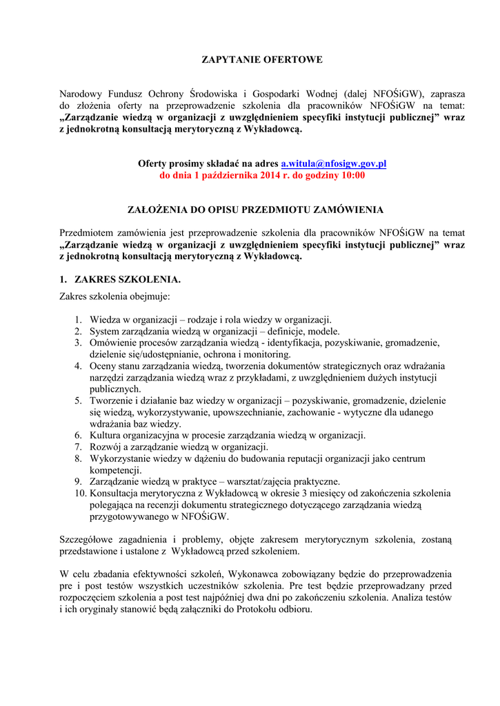 ZAPYTANIE OFERTOWE Narodowy Fundusz Ochrony Środowiska i Gospodarki Wodnej (dalej NFOŚiGW), zaprasza do złożenia oferty na przeprowadzenie szkolenia dla pracowników NFOŚiGW na temat: „Zarządzanie wiedzą w organizacji z uwzględnieniem specyfiki instytucji publicznej” wraz z jednokrotną konsultacją merytoryczną z Wykładowcą. Oferty prosimy składać na adres [email protected] do dnia 1 października 2014 r. do godziny 10:00 ZAŁOŻENIA DO OPISU PRZEDMIOTU ZAMÓWIENIA Przedmiotem zamówienia jest przeprowadzenie szkolenia dla pracowników NFOŚiGW na temat „Zarządzanie wiedzą w organizacji z uwzględnieniem specyfiki instytucji publicznej” wraz z jednokrotną konsultacją merytoryczną z Wykładowcą. 1. ZAKRES SZKOLENIA. Zakres szkolenia obejmuje: 1. Wiedza w organizacji – rodzaje i rola wiedzy w organizacji. 2. System zarządzania wiedzą w organizacji – definicje, modele. 3. Omówienie procesów zarządzania wiedzą - identyfikacja, pozyskiwanie, gromadzenie, dzielenie się/udostępnianie, ochrona i monitoring. 4. Oceny stanu zarządzania wiedzą, tworzenia dokumentów strategicznych oraz wdrażania narzędzi zarządzania wiedzą wraz z przykładami, z uwzględnieniem dużych instytucji publicznych. 5. Tworzenie i działanie baz wiedzy w organizacji – pozyskiwanie, gromadzenie, dzielenie się wiedzą, wykorzystywanie, upowszechnianie, zachowanie - wytyczne dla udanego wdrażania baz wiedzy. 6. Kultura organizacyjna w procesie zarządzania wiedzą w organizacji. 7. Rozwój a zarządzanie wiedzą w organizacji. 8. Wykorzystanie wiedzy w dążeniu do budowania reputacji organizacji jako centrum kompetencji. 9. Zarządzanie wiedzą w praktyce – warsztat/zajęcia praktyczne. 10. Konsultacja merytoryczna z Wykładowcą w okresie 3 miesięcy od zakończenia szkolenia polegająca na recenzji dokumentu strategicznego dotyczącego zarządzania wiedzą przygotowywanego w NFOŚiGW. Szczegółowe zagadnienia i problemy, objęte zakresem merytorycznym szkolenia, zostaną przedstawione i ustalone z Wykładowcą przed szkoleniem. W celu zbadania efektywności szkoleń, Wykonawca zobowiązany będzie do przeprowadzenia pre i post testów wszystkich uczestników szkolenia. Pre test będzie przeprowadzany przed rozpoczęciem szkolenia a post test najpóźniej dwa dni po zakończeniu szkolenia. Analiza testów i ich oryginały stanowić będą załączniki do Protokołu odbioru. Zamawiający określa zamówienie na łącznie 16 godzin szkoleniowych (1 godzina szkoleniowa = 45 minut). 2. TERMIN I MIEJSCE REALIZACJI ZAMÓWIENIA. Termin realizacji zamówienia: 6-7 października 2014 r. Miejsce realizacji zamówienia: Narodowy Fundusz Ochrony Środowiska i Gospodarki Wodnej ul. Bracka 4, Warszawa. 3. UCZESTNICY. W szkoleniu będą uczestniczyć pracownicy NFOŚiGW. Maksymalna liczba uczestników szkolenia wynosi 15 osób. 4. TRENER / WYKŁADOWCA. 4.1.Warunkiem przystąpienia do postępowania o udzielenie zamówienia na przeprowadzenie szkolenia nt. „Zarządzanie wiedzą w organizacji z uwzględnieniem specyfiki instytucji publicznej” dla pracowników NFOŚiGW wraz z jednokrotną konsultacją merytoryczną ww. zakresie jest wskazanie przez Wykonawcę tylko jednego Wykładowcy do przeprowadzenia szkolenia o co najmniej nastepujących kwalifikacjach: a) posiadanie przez Wykładowcę wykształcenia kierunkowego (tj. ukończony ze stopniem magistra jeden z kierunków studiów z zakresu: zarządzanie, ekonomia, finanse), b) udokumentowany udział Wykładowcy w co najmniej 5 projektach wdrożeniowych z zakresu zarządzania wiedzą na poziomie strategicznym lub operacyjnym w ciągu ostatnich 3 lat, c) posiadanie przez Wykładowcę doświadczenia w prowadzeniu szkoleń tj. przeprowadzenie przez niego minimum 5 szkoleń z zakresu zarządzania wiedzą w ciągu ostatnich 3 lat od dnia otrzymania/publikacji zapytania ofertowego. 5. PROGRAM SZKOLENIA. Zamawiający oczekuje od Wykonawcy, przed rozpoczęciem szkolenia, propozycji programu szkolenia opartego o wymienione w pkt. 1, zagadnienia wraz z propozycją czasu na poszczególne zagadnienia. Wykonawca powinien kierować się swoim doświadczeniem w doborze metod szkolenia. 6. MATERIAŁY SZKOLENIOWE. 6.1. Wykonawca przygotuje i przekaże Zamawiającemu najpóźniej na 1 dzień roboczy przed rozpoczęciem szkolenia jeden egzemplarz materiałów merytorycznych i reminderów (przypominaczy – specjalnie przygotowanych arkuszy zawierających najważniejsze elementy szkolenia w formie skondensowanej, w celu łatwiejszego wykorzystania ich w codziennej pracy) w formie elektronicznej do zatwierdzenia przez Zamawiającego. 6.2. Wykonawca zapewni każdemu uczestnikowi szkolenia papierową wersję merytorycznych materiałów szkoleniowych i reminderów. 6.3. Wykonawca przekaże jeden egzemplarz materiałów szkoleniowych, reminderów oraz pre i post testów w formie papierowej i elektronicznej (płyta CD) dla Zamawiającego, jako załącznik do protokołu odbioru szkolenia, które zostaną załączone do dokumentacji szkolenia. 2 6.4. Wykonawca poniesie pełny koszt przygotowania dokumentów określonych w ppkt. 1, 2 i 3 bez dodatkowych roszczeń w stosunku do Zamawiającego związanych ze zwrotem kosztów zakupu, czy ich przygotowania. 7. ORGANIZACJA SZKOLENIA. 7.1. Zamawiający dostarczy Wykonawcy imienną listę uczestników szkolenia na co najmniej 1 dzień przed rozpoczęciem szkolenia, z zastrzeżeniem możliwości jej zmiany/modyfikacji w celu zapewnienia pełnego wykorzystania miejsc na szkoleniu. Wykonawca jest zobowiązany do ścisłej współpracy z Zamawiającym w zakresie maksymalnego wykorzystania miejsc zaplanowanych na szkoleniu. 7.2. Zamawiający zapewnia salę szkoleniową z wyposażeniem. 7.3. Wykonawca opracuje i przedłoży Zamawiającemu protokół odbioru po zakończeniu szkolenia. Płatność faktury za realizację szkolenia nastąpi po podpisaniu przez Zamawiającego protokołu odbioru potwierdzającego prawidłowe wykonan