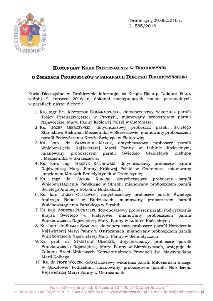 Drohiczyn, 09.06.2016 r. L. 585/2016 KOMUNIKAT KURII DIECEZJALNEJ W DROHICZYNIE o ZMIANACH PROBOSZCZÓW W PARAFIACH DIECEZJI DROHICZYŃSKIEJ Kuria Diecezjalna w Drohiczynie informuje, że Ksiądz Biskup Tadeusz Pikus w dniu 9 czerwca 2016 r. dokonał następujących zmian personalnych w parafiach naszej diecezji: 1. Ks. mgr lic. KRZYSZTOF DOMARACZEŃKO, dotychczasowy wikariusz parafii Trójcy Przenajświętszej w Prostyni, mianowany proboszczem parafii Najświętszej Maryi Panny Królowej Polski w Czeremsze; 2 . Ks. JÓZEF GIERCZYŃSKI, dotychczasowy proboszcz parafii Świętego Stanisława Biskupa i Męczennika w Skrzeszewie, mianowany proboszczem parafii Podwyższenia Krzyża Świętego w Platerowie; 3 . Ks. kan. dr SŁAWOMIR MAZUR, dotychczasowy proboszcz parafii Wniebowzięcia Najświętszej Maryi Panny w Łubinie Kościelnym, mianowany proboszczem parafii Świętego Stanisława Biskupa i Męczennika w Skrzeszewie; 4 . Ks. kan. mgr HENRYK KALINOWSKI, dotychczasowy proboszcz parafii Najświętszej Maryi Panny Królowej Polski w Czeremsze, mianowany kapelanem Mniszek Benedyktynek w Drohiczynie; 5. Ks. mgr lic. ANTONI KUNICKI, dotychczasowy proboszcz parafii Wniebowstąpienia Pańskiego w Strabli, mianowany proboszczem parafii Świętego Andrzeja Boboli w Budziskach; 6 . Ks. kan. JERZY OLSZEWSKI, dotychczasowy proboszcz parafii Świętego Andrzeja Boboli w Budziskach, mianowany proboszczem parafii Wniebowstąpienia Pańskiego w Strabli; 7. Ks. kan. ANDRZEJ PUCHALSKI, dotychczasowy proboszcz parafii Podwyższenia Krzyża Świętego w Platerowie, mianowany proboszczem parafii Wniebowzięcia Najświętszej Maryi Panny w Łubinie Kościelnym; 8. Ks. kan. dr ROMAN SZMURŁO, dotychczasowy proboszcz parafii Narodzenia Najświętszej Maryi Panny w Ostrożanach, mianowany proboszczem parafii Wniebowzięcia Najświętszej Maryi Panny w Siemiatyczach; 9 . Ks. prał. dr STANISŁAW ULACZYK, dotychczasowy proboszcz parafii Wniebowzięcia Najświętszej Maryi Panny w Siemiatyczach, wstępuje do Zakonu Braci Mniejszych Konwentualnych Prowincji Św. Maksymiliana Marii Kolbego; 10. Ks. dr PIOTR WÓJCIK, dotychczasowy wikariusz parafii Miłosierdzia Bożego w Sokołowie Podlaskim, mianowany proboszczem parafii Narodzenia Najświętszej Maryi Panny w Ostrożanach. Kuria Diecezjalna * ul. Kościelna 10 * PL 17-312 Drohiczyn * tel. 85/655 78 08, 85/655 70 01 * fax 85/655 80 04 * www.drohiczynska.pl * e-mail: [email protected] Księża proboszczowie kończą posługę w dotychczasowych parafiach w dniu 25 czerwca 2016 r, natomiast objęcie nowych placówek nastąpi z dniem 26 czerwca 2016 r. Wszystkim Księżom życzymy Bożego błogosławieństwa w nowych placówkach, Diecezjan drohiczyńskich zachęcamy do modlitwy w intencji kapłanów naszej diecezji.