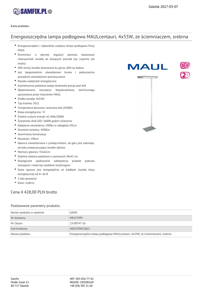 Gdańsk 2017-03-07 Karta produktu: Energooszczędna lampa podłogowa MAULcentauri, 4x55W, ze ściemniaczem, srebrna Energooszczędna i najbardziej wydajna lampa podłogowa firmy MAUL Ściemniacz o płynnej regulacji pozwala dopasować intensywność światła do bieżących potrzeb (np. czytanie lub relaks) 40% emisji światła skierowane ku górze, 60% ku dołowi Jest bezpośrednim oświetleniem biurka i jednocześnie pośrednim oświetleniem pomieszczenia Wysoka wydajność energetyczna Asymetryczna podstawa lampy doskonale pasuje pod stół Opatentowana koncepcja bezpieczeństwa technicznego opracowana przez inżynierów MAUL Źródło światła: 4x55W Typ trzonka: 2G11 Temperatura barwowa: neutralna biel (4500K) Klasa energetyczna: "A" Średnie zużycie energii: 61 kWh/1000h Żywotność diod LED: 16000 godzin świecenia Natężenie oświetlenia: 1900lx w odległości 85cm Strumień świetlny: 4500lm Aluminiowa konstrukcja Wysokość: 190cm Głowica oświetleniowa z przełącznikiem, od góry jest osłonięta, od dołu przepuszczający światło dyfuzor Wymiary głowicy: 33x62cm Stabilna stalowa podstawa o wymiarach 28x42 cm Ekologiczne opakowanie zabezpiecza produkt podczas transportu i może być poddane recyklingowi Sama oprawa jest kompatybilna ze źródłami światła klasy energetycznej od A+ do B 2 lata gwarancji Kolor: srebrny Cena 4 428,00 PLN brutto Podstawowe parametry produktu Numer produktu w systemie 62041 Nr dostawcy M8257095 Nr Celcen 13-00747-16 Kod kreskowy 4002390052863 Nazwa produktu Energooszczędna lampa podłogowa MAULcentauri, 4x55W, ze ściemniaczem, srebrna Samfix Miałki Szlak 52 80-717 Gdańsk NIP: 583-026-77-81 REGON: 190500169 +48 (58) 305 31 60 Gdańsk 2017-03-07 Karta katalogowa produktu cd. Energooszczędna lampa podłogowa MAULcentauri, 4x55W, ze ściemniaczem, srebrna Opis Energooszczędna i najbardziej wydajna lampa podłogowa firmy MAUL; ściemniacz o płynnej regulacji pozwala dopasować intensywność światła do bieżących potrzeb (np. czytanie lub relaks); 40% emisji światła skierowane ku górze, 60% ku dołowi; jest bezpośrednim oświetleniem biurka i jednocześnie pośrednim oświetleniem pomieszczenia; wysoka wydajność energetyczna; asymetryczna podstawa lampy doskonale pasuje pod stół; opatentowana koncepcja bezpieczeństwa technicznego opracowana przez inżynierów MAUL; źródło światła: 4x55W; typ trzonka: 2G11; temperatura barwowa: neutralna biel (4500K); klasa energetyczna: "A"; średnie zużycie energii: 61 kWh/1000h; żywotność diod LED: 16000 godzin świecenia; natężenie oświetlenia: 1900lx w odległości 85cm; strumień świetlny: 4500lm; aluminiowa konstrukcja; wysokość: 190cm; głowica oświetleniowa z przełącznikiem, od góry jest osłonięta, od dołu przepuszczający światło dyfuzor; wymiary głowicy: 33x62cm; stabilna stalowa podstawa o wymiarach 28x42 cm; ekologiczne opakowanie zabezpiecza produkt podczas transportu i może być poddane recyklingowi; sama oprawa jest kompatybilna ze źródłami światła klasy energetycznej od A+ do B; 2 lata gwarancji; kolor: srebrny Kategoria Lampki Klasa Premium Marka MAUL Cecha Natężenie światła LUMEN 4500 Natężenie światła LUX 1900 Rodzaj 4x55W Cykl życia (h) 16 000 Typ Energooszczędna Produkt Lampka podłogowa W ofercie od 2016-10 Klasa energetyczna A Materiał Metal/plastik Wymiary Wysokość (mm) 1900 Wspólny słownik zamówień CPV 31521200-6 Certyfikaty Ilość lat gwarancji 2 Hit Standard Nowy produkt w ofercie Nowość Samfix Miałki Szlak 52 80-717 Gdańsk NIP: 583-026-77-81 REGON: 190500169 +48 (58) 305 31 60 Gdańsk 2017-03-07 Karta katalogowa produktu cd. Energooszczędna lampa podłogowa MAULcentauri, 4x55W, ze ściemniaczem, srebrna Kolor Kolor Srebrny Pozostałe zdjęcia produktu Serdecznie zapraszamy do współpracy Zespół Samfix. Samfix Miałki Szlak 52 80-717 Gdańsk NIP: 583-026-77-81 REGON: 190500169 +48 (58) 305 31 60