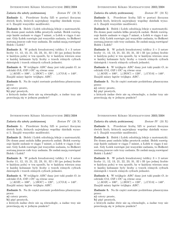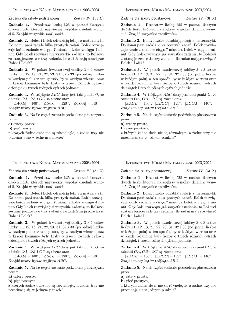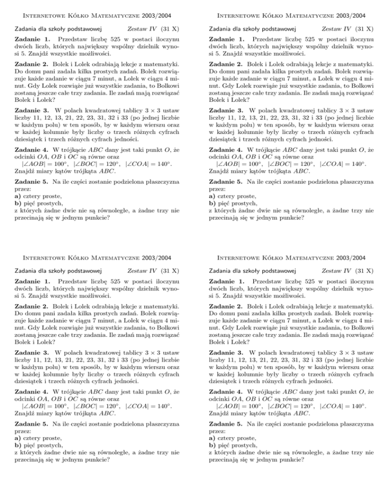Internetowe Kółko Matematyczne 2003/2004 Zadania dla szkoły podstawowej Zestaw IV (31 X) Internetowe Kółko Matematyczne 2003/2004 Zadania dla szkoły podstawowej Zestaw IV (31 X) Zadanie 1. Przedstaw liczbę 525 w postaci iloczynu dwóch liczb, których największy wspólny dzielnik wynosi 5. Znajdź wszystkie możliwości. Zadanie 1. Przedstaw liczbę 525 w postaci iloczynu dwóch liczb, których największy wspólny dzielnik wynosi 5. Znajdź wszystkie możliwości. Zadanie 2. Bolek i Lolek odrabiają lekcje z matematyki. Do domu pani zadała kilka prostych zadań. Bolek rozwiązuje każde zadanie w ciągu 7 minut, a Lolek w ciągu 4 minut. Gdy Lolek rozwiąże już wszystkie zadania, to Bolkowi zostaną jeszcze całe trzy zadania. Ile zadań mają rozwiązać Bolek i Lolek? Zadanie 2. Bolek i Lolek odrabiają lekcje z matematyki. Do domu pani zadała kilka prostych zadań. Bolek rozwiązuje każde zadanie w ciągu 7 minut, a Lolek w ciągu 4 minut. Gdy Lolek rozwiąże już wszystkie zadania, to Bolkowi zostaną jeszcze całe trzy zadania. Ile zadań mają rozwiązać Bolek i Lolek? Zadanie 3. W polach kwadratowej tablicy 3 × 3 ustaw liczby 11, 12, 13, 21, 22, 23, 31, 32 i 33 (po jednej liczbie w każdym polu) w ten sposób, by w każdym wierszu oraz w każdej kolumnie były liczby o trzech różnych cyfrach dziesiątek i trzech różnych cyfrach jedności. Zadanie 3. W polach kwadratowej tablicy 3 × 3 ustaw liczby 11, 12, 13, 21, 22, 23, 31, 32 i 33 (po jednej liczbie w każdym polu) w ten sposób, by w każdym wierszu oraz w każdej kolumnie były liczby o trzech różnych cyfrach dziesiątek i trzech różnych cyfrach jedności. Zadanie 4. W trójkącie ABC dany jest taki punkt O, że odcinki OA, OB i OC są równe oraz |∠AOB| = 100◦ , |∠BOC| = 120◦ , |∠COA| = 140◦ . Znajdź miary kątów trójkąta ABC. Zadanie 4. W trójkącie ABC dany jest taki punkt O, że odcinki OA, OB i OC są równe oraz |∠AOB| = 100◦ , |∠BOC| = 120◦ , |∠COA| = 140◦ . Znajdź miary kątów trójkąta ABC. Zadanie 5. Na ile części zostanie podzielona płaszczyzna przez: a) cztery proste, b) pięć prostych, z których żadne dwie nie są równoległe, a żadne trzy nie przecinają się w jednym punkcie? Zadanie 5. Na ile części zostanie podzielona płaszczyzna przez: a) cztery proste, b) pięć prostych, z których żadne dwie nie są równoległe, a żadne trzy nie przecinają się w jednym punkcie? Internetowe Kółko Matematyczne 2003/2004 Internetowe Kółko Matematyczne 2003/2004 Zadania dla szkoły podstawowej Zestaw IV (31 X) Zadania dla szkoły podstawowej Zestaw IV (31 X) Zadanie 1. Przedstaw liczbę 525 w postaci iloczynu dwóch liczb, których największy wspólny dzielnik wynosi 5. Znajdź wszystkie możliwości. Zadanie 1. Przedstaw liczbę 525 w postaci iloczynu dwóch liczb, których największy wspólny dzielnik wynosi 5. Znajdź wszystkie możliwości. Zadanie 2. Bolek i Lolek odrabiają lekcje z matematyki. Do domu pani zadała kilka prostych zadań. Bolek rozwiązuje każde zadanie w ciągu 7 minut, a Lolek w ciągu 4 minut. Gdy Lolek rozwiąże już wszystkie zadania, to Bolkowi zostaną jeszcze całe trzy zadania. Ile zadań mają rozwiązać Bolek i Lolek? Zadanie 2. Bolek i Lolek odrabiają lekcje z matematyki. Do domu pani zadała kilka prostych zadań. Bolek rozwiązuje każde zadanie w ciągu 7 minut, a Lolek w ciągu 4 minut. Gdy Lolek rozwiąże już wszystkie zadania, to Bolkowi zostaną jeszcze całe trzy zadania. Ile zadań mają rozwiązać Bolek i Lolek? Zadanie 3. W polach kwadratowej tablicy 3 × 3 ustaw liczby 11, 12, 13, 21, 22, 23, 31, 32 i 33 (po jednej liczbie w każdym polu) w ten sposób, by w każdym wierszu oraz w każdej kolumnie były liczby o trzech różnych cyfrach dziesiątek i trzech różnych cyfrach jedności. Zadanie 3. W polach kwadratowej tablicy 3 × 3 ustaw liczby 11, 12, 13, 21, 22, 23, 31, 32 i 33 (po jednej liczbie w każdym polu) w ten sposób, by w każdym wierszu oraz w każdej kolumnie były liczby o trzech różnych cyfrach dziesiątek i trzech różnych cyfrach jedności. Zadanie 4. W trójkącie ABC dany jest taki punkt O, że odcinki OA, OB i OC są równe oraz |∠AOB| = 100◦ , |∠BOC| = 120◦ , |∠COA| = 140◦ . Znajdź miary kątów trójkąta ABC. Zadanie 4. W trójkącie ABC dany jest taki punkt O, że odcinki OA, OB i OC są równe oraz |∠AOB| = 100◦ , |∠BOC| = 120◦ , |∠COA| = 140◦ . Znajdź miary kątów trójkąta ABC. Zadanie 5. Na ile części zostanie podzielona płaszczyzna przez: a) cztery proste, b) pięć prostych, z których żadne dwie nie są równoległe, a żadne trzy nie przecinają się w jednym punkcie? Zadanie 5. Na ile części zostanie podzielona płaszczyzna przez: a) cztery proste, b) pięć prostych, z których żadne dwie nie są równoległe, a żadne trzy nie przecinają się w jednym punkcie?