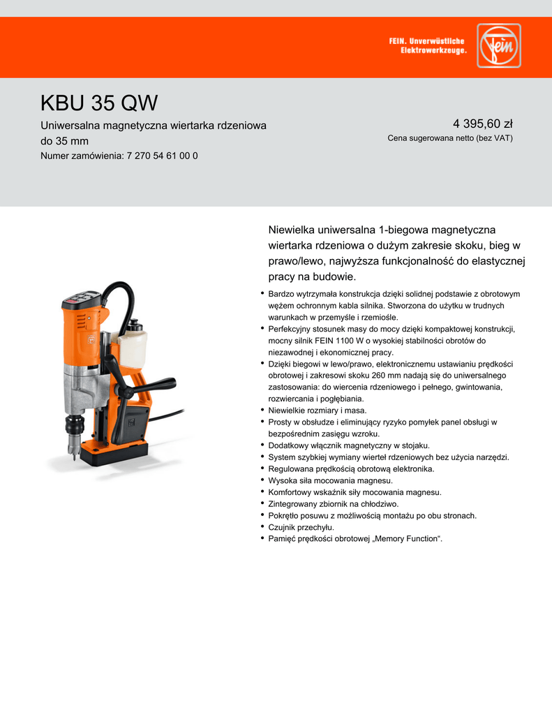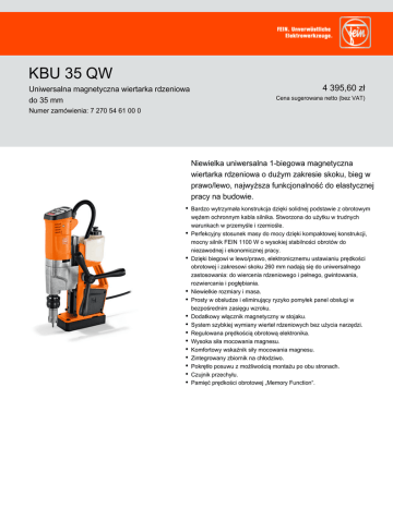 KBU 35 QW Uniwersalna magnetyczna wiertarka rdzeniowa do 35 mm 4 395,60 zł Cena sugerowana netto (bez VAT) Numer zamówienia: 7 270 54 61 00 0 Niewielka uniwersalna 1-biegowa magnetyczna wiertarka rdzeniowa o dużym zakresie skoku, bieg w prawo/lewo, najwyższa funkcjonalność do elastycznej pracy na budowie. Bardzo wytrzymała konstrukcja dzięki solidnej podstawie z obrotowym wężem ochronnym kabla silnika. Stworzona do użytku w trudnych warunkach w przemyśle i rzemiośle. Perfekcyjny stosunek masy do mocy dzięki kompaktowej konstrukcji, mocny silnik FEIN 1100 W o wysokiej stabilności obrotów do niezawodnej i ekonomicznej pracy. Dzięki biegowi w lewo/prawo, elektronicznemu ustawianiu prędkości obrotowej i zakresowi skoku 260 mm nadają się do uniwersalnego zastosowania: do wiercenia rdzeniowego i pełnego, gwintowania, rozwiercania i pogłębiania. Niewielkie rozmiary i masa. Prosty w obsłudze i eliminujący ryzyko pomyłek panel obsługi w bezpośrednim zasięgu wzroku. Dodatkowy włącznik magnetyczny w stojaku. System szybkiej wymiany wierteł rdzeniowych bez użycia narzędzi. Regulowana prędkością obrotową elektronika. Wysoka siła mocowania magnesu. Komfortowy wskaźnik siły mocowania magnesu. Zintegrowany zbiornik na chłodziwo. Pokrętło posuwu z możliwością montażu po obu stronach. Czujnik przechyłu. Pamięć prędkości obrotowej „Memory Function“. KBU 35 QW Uniwersalna magnetyczna wiertarka rdzeniowa do 35 mm Numer zamówienia: 7 270 54 61 00 0 Dane techniczne Pobór mocy Moc użytkowa Cena obejmuje: 1 100 W 550 W 1 walizka 1 zbiornik na chłodziwo Prędkość obrotowa pod obciążeniem 130 - 520 obr/min 1 pas mocujący Wiertło kręte, maks. średnica 16 mm 1 hak do wiórów Maks. głębokość wiercenia wiertła koronowego 50 mm 1 sztyfty centrujące Gwintowanie M 14 Pogłębianie Ø maks. 31 mm Rozwiercanie maks. Ø 16 mm Wiertło rdzeniowe Ø maks. 35 mm Wiertło rdzeniowe HSS Ø maks. 35 mm Uchwyt do wierteł koronowych Wymiana wiertła 3/4 in Weldon bez użycia narzędzi Skok roboczy 135 mm Całk. zakres skoku 260 mm Siła mocowania magnetycznego Wymiary stopy magnetycznej 10 000 N 175 x 80 mm Kabel z wtyczką 4m Ciężar wg EPTA 10,6 kg Sieciowe X 1 osłona