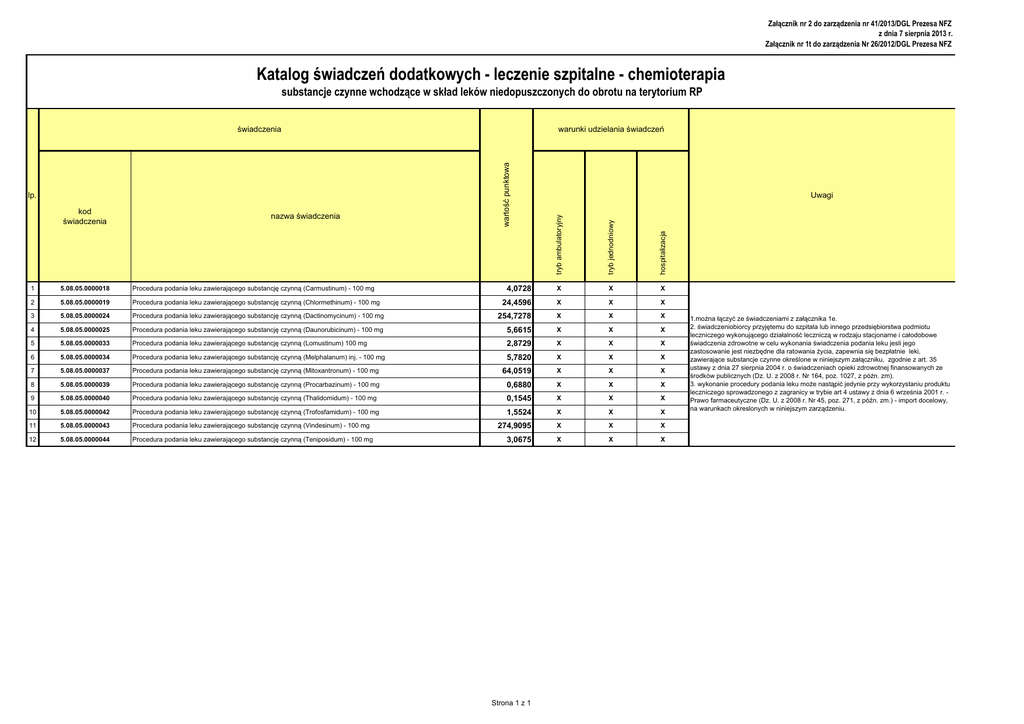 Załącznik nr 2 do zarządzenia nr 41/2013/DGL Prezesa NFZ z dnia 7 sierpnia 2013 r. Załącznik nr 1t do zarządzenia Nr 26/2012/DGL Prezesa NFZ Katalog świadczeń dodatkowych - leczenie szpitalne - chemioterapia substancje czynne wchodzące w skład leków niedopuszczonych do obrotu na terytorium RP lp. tryb jednodniowy hospitalizacja nazwa świadczenia Uwagi tryb ambulatoryjny kod świadczenia warunki udzielania świadczeń wartość punktowa świadczenia 4,0728 X X X 24,4596 X X X Procedura podania leku zawierającego substancję czynną (Dactinomycinum) - 100 mg 254,7278 X X X 5.08.05.0000025 Procedura podania leku zawierającego substancję czynną (Daunorubicinum) - 100 mg 5,6615 X X X 5 5.08.05.0000033 Procedura podania leku zawierającego substancję czynną (Lomustinum) 100 mg 2,8729 X X X 6 5.08.05.0000034 Procedura podania leku zawierającego substancję czynną (Melphalanum) inj. - 100 mg 5,7820 X X X 7 5.08.05.0000037 Procedura podania leku zawierającego substancję czynną (Mitoxantronum) - 100 mg 64,0519 X X X 8 5.08.05.0000039 Procedura podania leku zawierającego substancję czynną (Procarbazinum) - 100 mg 0,6880 X X X 9 5.08.05.0000040 Procedura podania leku zawierającego substancję czynną (Thalidomidum) - 100 mg 0,1545 X X X 10 5.08.05.0000042 Procedura podania leku zawierającego substancję czynną (Trofosfamidum) - 100 mg 1,5524 X X X 11 5.08.05.0000043 Procedura podania leku zawierającego substancję czynną (Vindesinum) - 100 mg 274,9095 X X X 12 5.08.05.0000044 Procedura podania leku zawierającego substancję czynną (Teniposidum) - 100 mg 3,0675 X X X 1 5.08.05.0000018 Procedura podania leku zawierającego substancję czynną (Carmustinum) - 100 mg 2 5.08.05.0000019 Procedura podania leku zawierającego substancję czynną (Chlormethinum) - 100 mg 3 5.08.05.0000024 4 Strona 1 z 1 1.można łączyć ze świadczeniami z załącznika 1e. 2. świadczeniobiorcy przyjętemu do szpitala lub innego przedsiębiorstwa podmiotu leczniczego wykonującego działalność leczniczą w rodzaju stacjonarne i całodobowe świadczenia zdrowotne w celu wykonania świadczenia podania leku jesli jego zastosowanie jest niezbędne dla ratowania życia, zapewnia się bezpłatnie leki, zawierające substancje czynne określone w niniejszym załączniku, zgodnie z art. 35 ustawy z dnia 27 sierpnia 2004 r. o świadczeniach opieki zdrowotnej finansowanych ze środków publicznych (Dz. U. z 2008 r. Nr 164, poz. 1027, z późn. zm). 3. wykonanie procedury podania leku może nastąpić jedynie przy wykorzystaniu produktu leczniczego sprowadzonego z zagranicy w trybie art 4 ustawy z dnia 6 września 2001 r. Prawo farmaceutyczne (Dz. U. z 2008 r. Nr 45, poz. 271, z późn. zm.) - import docelowy, na warunkach okreslonych w niniejszym zarządzeniu.
