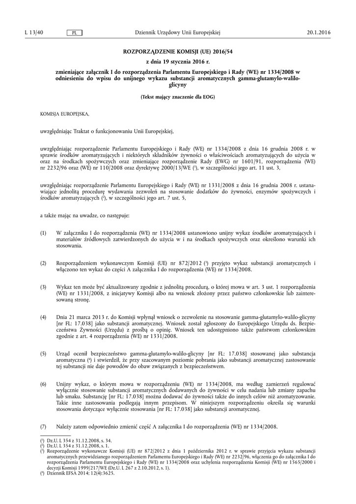 L 13/40 Dziennik Urzędowy Unii Europejskiej PL 20.1.2016 ROZPORZĄDZENIE KOMISJI (UE) 2016/54 z dnia 19 stycznia 2016 r. zmieniające załącznik I do rozporządzenia Parlamentu Europejskiego i Rady (WE) nr 1334/2008 w odniesieniu do wpisu do unijnego wykazu substancji aromatycznych gamma-glutamylo-waliloglicyny (Tekst mający znaczenie dla EOG) KOMISJA EUROPEJSKA, uwzględniając Traktat o funkcjonowaniu Unii Europejskiej, uwzględniając rozporządzenie Parlamentu Europejskiego i Rady (WE) nr 1334/2008 z dnia 16 grudnia 2008 r. w sprawie środków aromatyzujących i niektórych składników żywności o właściwościach aromatyzujących do użycia w oraz na środkach spożywczych oraz zmieniające rozporządzenie Rady (EWG) nr 1601/91, rozporządzenia (WE) nr 2232/96 oraz (WE) nr 110/2008 oraz dyrektywę 2000/13/WE (1), w szczególności jego art. 11 ust. 3, uwzględniając rozporządzenie Parlamentu Europejskiego i Rady (WE) nr 1331/2008 z dnia 16 grudnia 2008 r. ustana wiające jednolitą procedurę wydawania zezwoleń na stosowanie dodatków do żywności, enzymów spożywczych i środków aromatyzujących (2), w szczególności jego art. 7 ust. 5, a także mając na uwadze, co następuje: (1) W załączniku I do rozporządzenia (WE) nr 1334/2008 ustanowiono unijny wykaz środków aromatyzujących i materiałów źródłowych zatwierdzonych do użycia w i na środkach spożywczych oraz określono warunki ich stosowania. (2) Rozporządzeniem wykonawczym Komisji (UE) nr 872/2012 (3) przyjęto wykaz substancji aromatycznych i włączono ten wykaz do części A załącznika I do rozporządzenia (WE) nr 1334/2008. (3) Wykaz ten może być aktualizowany zgodnie z jednolitą procedurą, o której mowa w art. 3 ust. 1 rozporządzenia (WE) nr 1331/2008, z inicjatywy Komisji albo na wniosek złożony przez państwo członkowskie lub zaintere sowaną stronę. (4) Dnia 21 marca 2013 r. do Komisji wpłynął wniosek o zezwolenie na stosowanie gamma-glutamylo-walilo-glicyny [nr FL: 17.038] jako substancji aromatycznej. Wniosek został zgłoszony do Europejskiego Urzędu ds. Bezpie czeństwa Żywności (Urzędu) z prośbą o opinię. Wniosek ten udostępniono także państwom członkowskim zgodnie z art. 4 rozporządzenia (WE) nr 1331/2008. (5) Urząd ocenił bezpieczeństwo gamma-glutamylo-walilo-glicyny [nr FL: 17.038] stosowanej jako substancja aromatyczna (4) i stwierdził, że przy szacowanym poziomie pobrania jako substancji aromatycznej zastosowanie tej substancji nie daje powodów do obaw związanych z bezpieczeństwem. (6) Unijny wykaz, o którym mowa w rozporządzeniu (WE) nr 1334/2008, ma według zamierzeń regulować wyłącznie stosowanie substancji aromatycznych dodawanych do żywności w celu nadania lub zmiany zapachu lub smaku. Substancję [nr FL: 17.038] można dodawać do żywności także do innych celów niż aromatyzowanie. Takie inne zastosowania podlegają innym przepisom. W niniejszym rozporządzeniu określa się warunki stosowania dotyczące wyłącznie stosowania [nr FL: 17.038] jako substancji aromatycznej. (7) Należy zatem odpowiednio zmienić część A załącznika I do rozporządzenia (WE) nr 1334/2008. (1) Dz.U. L 354 z 31.12.2008, s. 34. (2) Dz.U. L 354 z 31.12.2008, s. 1. (3) Rozporządzenie wykonawcze Komisji (UE) nr 872/2012 z dnia 1 października 2012 r. w sprawie przyjęcia wykazu substancji aromatycznych przewidzianego rozporządzeniem Parlamentu Europejskiego i Rady (WE) nr 2232/96, włączenia go do załącznika I do rozporządzenia Parlamentu Europejskiego i Rady (WE) nr 1334/2008 oraz uchylenia rozporządzenia Komisji (WE) nr 1565/2000 i decyzji Komisji 1999/217/WE (Dz.U. L 267 z 2.10.2012, s. 1). (4) Dziennik EFSA 2014; 12(4):3625. 20.1.2016 (8) PL Dziennik Urzędowy Unii Europejskiej L 13/41 Środki przewidziane w niniejszym rozporządzeniu są zgodne z opinią Stałego Komitetu ds. Roślin, Zwierząt, Żywności i Pasz, PRZYJMUJE NINIEJSZE ROZPORZĄDZENIE: Artykuł 1 W części A załącznika I do rozporządzenia (WE) nr 1334/2008 wprowadza się zmiany zgodnie z załącznikiem do niniejszego rozporządzenia. Artykuł 2 Niniejsze rozporządzenie wchodzi w życie dwudziestego dnia po jego opublikowaniu w Dzienniku Urzędowym Unii Europejskiej. Niniejsze rozporządzenie wiąże w całości i jest bezpośrednio stosowane we wszystkich państwach członkowskich. Sporządzono w Brukseli dnia 19 stycznia 2016 r. W imieniu Komisji Jean-Claude JUNCKER Przewodniczący L 13/42 ZAŁĄCZNIK W części A sekcja 2 załącznika I do rozporządzenia (WE) nr 1334/2008 dodaje się następującą pozycję dotyczącą [nr FL: 17.038] na końcu tabeli: „17.038 338837-70-6 2123 5-okso-L-prolilo-L-walilo-glicyna (PCAVal-Gly) i L-alfa-glutamylo-L-walilo-gli cyna mniej niż 0,7 %, L-gamma-gluta mylo-L-walilo-L-walilo-glicyna mniej niż 2,0 %. Toluen niewykrywalny (granica oznaczalności: 10 mg/kg) Ograniczenie stosowania jako substancji aroma tycznej: EFSA” PL gamma-glutamylowalilo-glicyna W kategorii 1 – nie więcej niż 50 mg/kg W kategoriach 2 i 5 – nie więcej niż 60 mg/kg W kategorii 6.3, śniadaniowe przetwory zbożowe – nie więcej niż 160 mg/kg W kategorii 7.2 – nie więcej niż 60 mg/kg. W kategorii 12 – nie więcej niż 160 mg/kg W kategorii 14.1 – nie więcej niż 15 mg/kg W kategorii 15 – nie więcej niż 160 mg/kg Dziennik Urzędowy Unii Europejskiej W kategorii 8 – nie więcej niż 45 mg/kg 20.1.2016