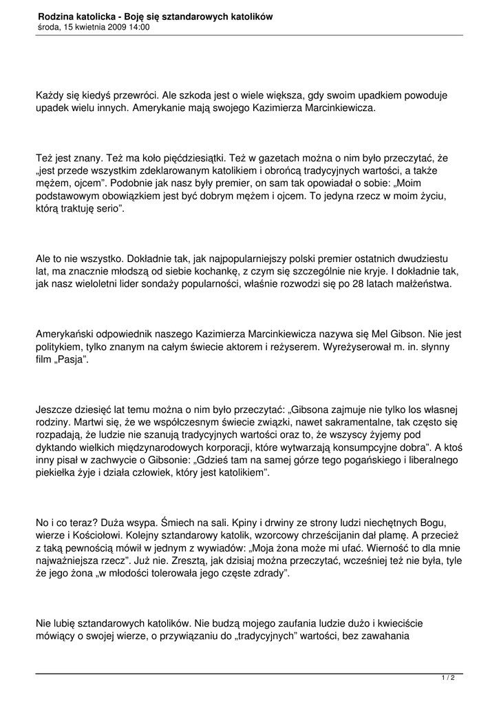 Rodzina katolicka - Boję się sztandarowych katolików środa, 15 kwietnia 2009 14:00 Każdy się kiedyś przewróci. Ale szkoda jest o wiele większa, gdy swoim upadkiem powoduje upadek wielu innych. Amerykanie mają swojego Kazimierza Marcinkiewicza. Też jest znany. Też ma koło pięćdziesiątki. Też w gazetach można o nim było przeczytać, że „jest przede wszystkim zdeklarowanym katolikiem i obrońcą tradycyjnych wartości, a także mężem, ojcem”. Podobnie jak nasz były premier, on sam tak opowiadał o sobie: „Moim podstawowym obowiązkiem jest być dobrym mężem i ojcem. To jedyna rzecz w moim życiu, którą traktuję serio”. Ale to nie wszystko. Dokładnie tak, jak najpopularniejszy polski premier ostatnich dwudziestu lat, ma znacznie młodszą od siebie kochankę, z czym się szczególnie nie kryje. I dokładnie tak, jak nasz wieloletni lider sondaży popularności, właśnie rozwodzi się po 28 latach małżeństwa. Amerykański odpowiednik naszego Kazimierza Marcinkiewicza nazywa się Mel Gibson. Nie jest politykiem, tylko znanym na całym świecie aktorem i reżyserem. Wyreżyserował m. in. słynny film „Pasja”. Jeszcze dziesięć lat temu można o nim było przeczytać: „Gibsona zajmuje nie tylko los własnej rodziny. Martwi się, że we współczesnym świecie związki, nawet sakramentalne, tak często się rozpadają, że ludzie nie szanują tradycyjnych wartości oraz to, że wszyscy żyjemy pod dyktando wielkich międzynarodowych korporacji, które wytwarzają konsumpcyjne dobra”. A ktoś inny pisał w zachwycie o Gibsonie: „Gdzieś tam na samej górze tego pogańskiego i liberalnego piekiełka żyje i działa człowiek, który jest katolikiem”. No i co teraz? Duża wsypa. Śmiech na sali. Kpiny i drwiny ze strony ludzi niechętnych Bogu, wierze i Kościołowi. Kolejny sztandarowy katolik, wzorcowy chrześcijanin dał plamę. A przecież z taką pewnością mówił w jednym z wywiadów: „Moja żona może mi ufać. Wierność to dla mnie najważniejsza rzecz”. Już nie. Zresztą, jak dzisiaj można przeczytać, wcześniej też nie była, tyle że jego żona „w młodości tolerowała jego częste zdrady”. Nie lubię sztandarowych katolików. Nie budzą mojego zaufania ludzie dużo i kwieciście mówiący o swojej wierze, o przywiązaniu do „tradycyjnych” wartości, bez zawahania 1/2 Rodzina katolicka - Boję się sztandarowych katolików środa, 15 kwietnia 2009 14:00 pozwalający się obsadzać na stanowisku moralnych wzorów i nieskazitelnych autorytetów. Boję się ich. Znam proboszcza, który budził powszechne zdumienie seminaryjnych przełożonych, co roku wystawiając jednemu ze swych kleryków super pozytywną opinię, którą za każdym razem kończył takim samym zdaniem: „Uważam, że nie nadaje się na księdza”. „Jak to, przecież to najlepszy kleryk, jakiego spotkałem w swojej karierze?” – dziwił się rektor seminarium. „Właśnie dlatego nie nadaje się na księdza” – odpowiadał zagadkowo proboszcz. Pięć lat po święceniach były idealny kleryk porzucił kapłaństwo, gdy już się nie dało ukryć, że właśnie w drodze jest jego drugie dziecko. Po tym fakcie proboszcz jego rodzinnej parafii na tydzień wyłączył komórkę, bo miał dość tłumaczenia, skąd wiedział, że chłopak nie da rady wytrwać jako ksiądz. Ks. Józef Tischner stwierdził kiedyś: „W moim życiu filozoficzno-kapłańskim nie spotkałem kogoś, kto stracił wiarę po przeczytaniu Marksa, Lenina, Nietzschego, natomiast na kopy można liczyć tych, którzy ją stracili po spotkaniu z własnym proboszczem”. Mam nadzieję, że ks. Tischner nie obrazi się na moją parafrazę: „Marks, Lenin, Nietzsche razem wzięci nie zrobią Kościołowi takiej szkody, jak jeden sztandarowy katolik, który upadnie i okaże się zwykłym, słabym katolikiem-grzesznikiem”. Takim samym, jak ja. Święty Paweł ostrzegał już dawno wszystkich wyznawców Jezusa: „Niech przeto ten, komu się zdaje, że stoi, baczy, aby nie upadł”. Myślę, że trzeba nieustannie przypominać to ostrzeżenie. Nie tylko sztandarowym katolikom. Wszystkim. Także tym, którzy na widok owych chodzących ideałów wpadają w bezrozumny i bezkrytyczny zachwyt. Każdy się kiedyś przewróci. Ale szkoda jest o wiele większa, gdy swoim upadkiem powoduje upadek wielu innych. Ks. Artur Stopka Źródło: Wiara.pl 2/2