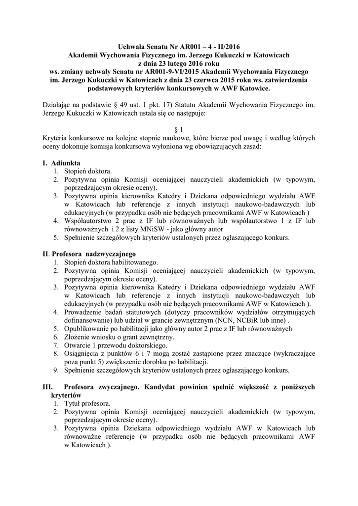 Uchwała Senatu Nr AR001 – 4 - II/2016 Akademii Wychowania Fizycznego im. Jerzego Kukuczki w Katowicach z dnia 23 lutego 2016 roku ws. zmiany uchwały Senatu nr AR001-9-VI/2015 Akademii Wychowania Fizycznego im. Jerzego Kukuczki w Katowicach z dnia 23 czerwca 2015 roku ws. zatwierdzenia podstawowych kryteriów konkursowych w AWF Katowice. Działając na podstawie § 49 ust. 1 pkt. 17) Statutu Akademii Wychowania Fizycznego im. Jerzego Kukuczki w Katowicach ustala się co następuje: §1 Kryteria konkursowe na kolejne stopnie naukowe, które bierze pod uwagę i według których oceny dokonuje komisja konkursowa wyłoniona wg obowiązujących zasad: I. Adiunkta 1. Stopień doktora. 2. Pozytywna opinia Komisji oceniającej nauczycieli akademickich (w typowym, poprzedzającym okresie oceny). 3. Pozytywna opinia kierownika Katedry i Dziekana odpowiedniego wydziału AWF w Katowicach lub referencje z innych instytucji naukowo-badawczych lub edukacyjnych (w przypadku osób nie będących pracownikami AWF w Katowicach ) 4. Współautorstwo 2 prac z IF lub równoważnych lub współautorstwo 1 z IF lub równoważnych i 2 z listy MNiSW - jako główny autor 5. Spełnienie szczegółowych kryteriów ustalonych przez ogłaszającego konkurs. II. Profesora nadzwyczajnego 1. Stopień doktora habilitowanego. 2. Pozytywna opinia Komisji oceniającej nauczycieli akademickich (w typowym, poprzedzającym okresie oceny). 3. Pozytywna opinia kierownika Katedry i Dziekana odpowiedniego wydziału AWF w Katowicach lub referencje z innych instytucji naukowo-badawczych lub edukacyjnych (w przypadku osób nie będących pracownikami AWF w Katowicach ). 4. Prowadzenie badań statutowych (dotyczy pracowników wydziałów otrzymujących dofinansowanie) lub udział w grancie zewnętrznym (NCN, NCBiR lub inne) . 5. Opublikowanie po habilitacji jako główny autor 2 prac z IF lub równoważnych 6. Złożenie wniosku o grant zewnętrzny. 7. Otwarcie 1 przewodu doktorskiego. 8. Osiągnięcia z punktów 6 i 7 mogą zostać zastąpione przez znaczące (wykraczające poza punkt 5) zwiększenie dorobku po habilitacji. 9. Spełnienie szczegółowych kryteriów ustalonych przez ogłaszającego konkurs. III. Profesora zwyczajnego. Kandydat powinien spełnić większość z poniższych kryteriów 1. Tytuł profesora. 2. Pozytywna opinia Komisji oceniającej nauczycieli akademickich (w typowym, poprzedzającym okresie oceny). 3. Pozytywna opinia Dziekana odpowiedniego wydziału AWF w Katowicach lub równoważne referencje (w przypadku osób nie będących pracownikami AWF w Katowicach ). 4. Prowadzenie badań statutowych (dotyczy pracowników wydziałów otrzymujących dofinansowanie). 5. Udział w realizowanym (lub zakończonym) grancie zewnętrznym na badania naukowe (NCN, NCBiR lub inne). 6. Udokumentowana współpraca zagraniczna (np. wspólne granty lub publikacje). 7. Promotorstwo w 4 zakończonych obronami przewodach doktorskich. 8. Udział w pracach redakcyjnych (jako redaktor lub recenzent) w periodyku naukowym o zasięgu międzynarodowym. 9. Kandydat powinien spełnić większość z kryteriów zawartych w punktach 4-8. 10. Spełnienie szczegółowych kryteriów ustalonych przez ogłaszającego konkurs. IV. Starszego Wykładowcy 1. Stopień doktora. 2. Pozytywna opinia Komisji oceniającej nauczycieli akademickich (w typowym, poprzedzającym okresie oceny). 3. Pozytywna opinia kierownika Katedry. 4. Wysokie kwalifikacje zawodowe potwierdzone dyplomami lub certyfikatami ukończonych studiów podyplomowych, kursów i szkoleń). 5. Dorobek dydaktyczno-naukowy (publikacje naukowe, dydaktyczne, podręczniki i skrypty akademickie, szkolenia, warsztaty). 6. Udokumentowane doświadczenie zawodowe zdobyte poza uczelnią. 7. Organizacja konferencji metodyczno-szkoleniowych, prowadzenie kursów trenerskich, instruktorskich oraz studiów podyplomowych. 8. Spełnienie szczegółowych kryteriów ustalonych przez ogłaszającego konkurs. Zatrudnienie na stanowisko starszego wykładowcy osoby z tytułem magistra jest możliwe tylko w przypadku wybitnych osiągnięć zawodowych (trenerskich, artystycznych). Kryteria dodatkowe brane pod uwagę (dotyczy każdego stopnia): 1. Nagrody Rektora lub inne (np. ministerialne) za działalność naukową lub dydaktyczną 2. Pełnienie obowiązków kierownika katedry, zakładu, laboratorium lub pracowni 3. Pełnienie wybieralnej funkcji na Uczelni §2 Uchwała wchodzi w życie z dniem podjęcia, jednocześnie traci moc Uchwała Senatu nr AR001-27-V/2014 Akademii Wychowania Fizycznego im. Jerzego Kukuczki w Katowicach z dnia 27 maja 2014 roku ws. zatwierdzenia podstawowych kryteriów konkursowych w AWF Katowice. V. Głosowanie: 17 TAK, 0 NIE, 0 WSTRZ. Uprawnionych do głosowania – 25 osób. Obecnych 17 osób. Głosowało 17 osób. Senat Akademii Wychowania Fizycznego im. Jerzego Kukuczki w Katowicach w głosowaniu jawnym, jednogłośnie podjął uchwałę ws. zmiany uchwały Senatu nr AR001-9-VI/2015 Akademii Wychowania Fizycznego im. Jerzego Kukuczki w Katowicach z dnia 23 czerwca 2015 roku ws. zatwierdzenia podstawowych kryteriów konkursowych w AWF Katowice. Rektor Prof. dr hab. Adam Zając
