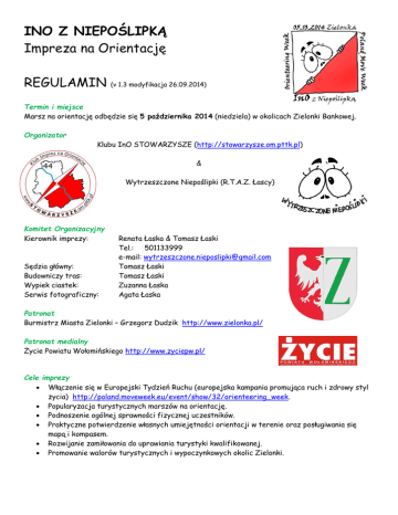 INO Z NIEPOŚLIPKĄ Impreza na Orientację REGULAMIN (v 1.3 modyfikacja 26.09.2014) Termin i miejsce Marsz na orientację odbędzie się 5 października 2014 (niedziela) w okolicach Zielonki Bankowej. Organizator Klubu InO STOWARZYSZE (http://stowarzysze.om.pttk.pl) & Wytrzeszczone Niepoślipki (R.T.A.Z. Łascy) Komitet Organizacyjny Kierownik imprezy: Sędzia główny: Budowniczy tras: Wypiek ciastek: Serwis fotograficzny: Renata Łaska & Tomasz Łaski Tel.: 501133999 e-mail: [email protected] Tomasz Łaski Tomasz Łaski Zuzanna Łaska Agata Łaska Patronat Burmistrz Miasta Zielonki – Grzegorz Dudzik http://www.zielonka.pl/ Patronat medialny Życie Powiatu Wołomińskiego http://www.zyciepw.pl/ Cele imprezy Włączenie się w Europejski Tydzień Ruchu (europejska kampania promująca ruch i zdrowy styl życia) http://poland.moveweek.eu/event/show/32/orienteering_week. Popularyzacja turystycznych marszów na orientację. Podnoszenie ogólnej sprawności fizycznej uczestników. Praktyczne potwierdzenie własnych umiejętności orientacji w terenie oraz posługiwania się mapą i kompasem. Rozwijanie zamiłowania do uprawiania turystyki kwalifikowanej. Promowanie walorów turystycznych i wypoczynkowych okolic Zielonki. Forma, etapy, kategorie Turystyczne marsze na orientację TF (trasa familijna - idealna na niedzielny spacer) – 1 etap dzienny – start w zespołach 1-7 os, 1 pkt. na OInO (3,4km, 80+25minut). TP (trasa dla początkujących) – 1 etap dzienny– start w zespołach 1- 5 os., 1 pkt. na OInO (4,6km, 15PK, 130+35minut). TU (trasa dla średniozaawansowanych) – 1 etap dzienny– start w zespołach 1- 3 os., 1 pkt. na OInO (4,43km, 17PK, 120+35minut). TZ (trasa dla zaawansowanych) – 1 etap dzienny – start w zespołach 1- 2 os., 1 pkt. na OInO (5,3km, 16PK,140+35minut). Turystyczno-rekraacyjna InO (http://trino.pttk.pl) Trasa krajoznawcza po Zielonce do przebycia w dowolnym czasie (http://trino.pttk.pl/images/pdf/mapa/trino_zielonka.pdf), 1 pkt. na OInO. W czasie oczekiwania na przeliczenie wyników zapraszamy na mini trasę, nie wliczaną do klasyfikacji InOwca Tygodnia, 1 etap dzienny- start w zespołach 1-5osobowych., 1 pkt. na OInO, długość ok 500m. Impreza jest zaliczana do cyklu Orienteering Week: http://stowarzysze.om.pttk.pl/?p=3518. Punktacja dla każdej trasy do klasyfikacji ogólnej Orienteering Week (OW) jest zgodna z punktacją rankingu GWIAZDA (http://stowarzysze.om.pttk.pl/?page_id=2764) - odpowiednio dla każdej kategorii i rangi zawodów. Najlepszym InOwcem Tygodnia zostaje uczestnik, który ma najwyższą sumę punktów z 3 najlepszych wyników swoich startów. Teren, mapy Teren leśny o zróżnicowanej przebieżności, miejscami może być podmokły i zakomarzony . Mapy: w kat. TF mapa pełna, kolorowa. w kat. TP mapa pełna lub prawie pełna, kolorowa, w kat. TU mapa z „niewielkimi” urozmaiceniami. w kat. TZ mapa silnie przekształcona, dążąca do ideału - „carte blanche” . Start i Dojazd Start w Zielonce Bankowej, w okolicach skrzyżowania ulic Bankowej i Wojska Polskiego. Dokładna lokalizacja startu i komunikat techniczny zostanie opublikowany na stronie organizatora http://stowarzysze.om.pttk.pl do niedzieli 28 września 2014 r. Dojazd Od strony Rembertowa (do Rembertowa polecamy dojazd SKM S2/KM) autobusami ZTM do pętli autobusowej „Pastuszków” (153) lub „Mokry Ług” (115, 153, 325) i ok 1km dojścia pieszo lub dojazd autobusem LZ-1; autobusem LZ-1 lub LZ-2 do Zielonki Bankowej (z CH Marki – autobus bezpłatny); Pociągiem KM z dworca Warszawa Wileńska do stacji Zielonka i ok 2,5km dojścia pieszo lub autobusami LZ-1, LZ-2. Rozkłady jazdy linii LZ-1 i LZ-2: http://www.zielonka.pl/rozkladJazdy. Start czynny od godz. 11:00, zamknięcie startu: godz. 12:00. Program imprezy: 10:30 Rozpoczęcie pracy sekretariatu. 11:00 – 12:00 Start etapów głównych (TF,TP,TU,TZ) – w miarę potrzeb będzie możliwy start wcześniejszy przed godziną 11:00 – szczególnie dla trasy najdłuższej TZ. 12:00-15:00 Podliczanie wyników w miarę powrotu uczestników z tras. Dla chętnych start na etap Mini. Ok: 15:30 Ogłoszenie wyników (po powrocie ostatniego zawodnika), rozdanie dyplomów, podsumowanie rankingu na InOwca Tygodnia, Zgłoszenia i wpisowe Poprzez formularz zgłoszeń na stronie http://orienteering.waw.pl/pl/entry/team/188 lub u kierownika telefonicznie (Tomasz Łaski 50113399) /e-mailem przyjmowane są do godziny 12:00 3 października 2014 (piątek). Wpisowe 0 zł. dzięki wsparciu finansowemu Burmistrza Miasta Zielonki. Zgłoszenie na starcie nie gwarantuje pełnych świadczeń. Bieżące informacje na stronie: http://stowarzysze.om.pttk.pl/ Świadczenia Każdy uczestnik otrzymuje: mapę, okolicznościową naklejkę, potwierdzenie pkt. Na OInO (możliwość zakupu na imprezie książeczki OInOw cenie 2zł), wodę, słodki poczęstunek na mecie, protokół w wersji elektronicznej dostępny na stronie organizatora ( http://stowarzysze.om.pttk.pl/ ). Na imprezie możliwa będzie weryfikacja odznak: OInO (w stopniach od popularnego do małego złotego), TRInO, Lampion. Nagrody Dyplomy dla trzech pierwszych miejsc na trasach, drobne upominki. Postanowienia końcowe Marsz nie ma charakteru komercyjnego. Jest to impreza non-profit, odbywająca się na zasadach samorealizacji. Członkowie PTTK objęci będą ubezpieczeniem od NNW członków Towarzystwa, pozostali uczestnicy ubezpieczają się we własnym zakresie. Impreza odbędzie się bez względu na stan pogody. Uczestnicy powinni być zaopatrzeni w ubiór odpowiedni do warunków pogodowych, kompas, przybory do pisania, może przydać się latarka i środek do odstraszania komarów. Za szkody wynikłe wobec uczestników jak i osób trzecich organizator nie odpowiada. Na imprezie obowiązuje punktacja Komisji InO ZG PTTK. Osoby niepełnoletnie mogą uczestniczyć pod opieką dorosłego opiekuna. Obowiązkiem uczestnika jest przestrzeganie zasad Karty Turysty, Kodeksu Drogowego 