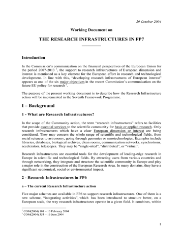 29 October 2004 Working Document on THE RESEARCH INFRASTRUCTURES IN FP7 _________ Introduction In the Commission’s communication on the financial perspectives of the European Union for the period 2007-2013 1, the support to research infrastructures of E uropean dimension and interest is mentioned as a key element for the European effort in research and technological development. In line with this, “developing research infrastructures of European interest” appears as one of the six major objectives in the recent Commission’s communication on the future EU policy for research 2. The purpose of the present working document is to describe how the Research Infrastructure action will be implemented in the Seventh Framework Programme. I – Background 1 - What are Research Infrastructures? In the scope of the Community action, the term “research infrastructures” refers to facilities that provide essential services to the scientific community for basic or applied research. Only research infrastructures which have a clear European dimension or interest are being considered. They may concern the whole range of scientific and technological fields, from social sciences to astronomy, going through genomics or nanotechnologies. Examples include libraries, databases, biological archives, clean rooms, communication networks, synchrotrons, accelerators, telescopes. They may be “single-sited”, “distributed”, or “virtual”. Research infrastructures are essential tools for the development of leading-edge research in Europe in scientific and technological fields. By attracting users from various countries and through networking, they integrate and structure the scientific community in Europe and play a major role in the construction of the European Research Area. In many domains, they have a significant economical, social or environmental impact. 2 - Research Infrastructures in FP6 a – The current Research Infrastructure action Five major schemes are available in FP6 to support research infrastructures. One of them is a new scheme, “integrating activities”, which has been introduced to structure better, on a European scale, the way research infrastructures operate in a given field. It combines, within 1 2 COM(2004) 101 – 10 February 2004 COM(2004) 353 – 16 June 2004 1 the single I3 contract (Integrated Infrastructure Initiatives), “access”, “networking” and “research” activities that were supported through individual contracts in previous Framework Programmes. Two other new schemes, “design studies” and “construction”, have been introduced to promote the creation of new research infrastructures. The five schemes are outlined below: 1. Transnational Access: to support new opportunities for research teams to obtain access to the best research infrastructures in Europe; 2. Integrating Activities: to support the integrated provision of infrastructure-related services (“networking” “access” and “joint research activities”) to the research community at a European level, for a group of infrastructures in the same field; 3. Communication Network Development: to help establish the GEANT communication network and support Grid type activities; 4. Design Studies: to support feasibility studies or technical preparatory work for new infrastructures; 5. Construction of New Infrastructures: to partly support (10% maximum) the development costs of new research infrastructures. b – Lessons learnt from FP6 For all the above schemes, the calls for proposals published so far under FP6 have attracted a large number of high quality proposals, in a wide range of fields. The overall financial request was much above the financial resources available. These results clearly show that the existing schemes for the Research Infrastructures action should be continued and better supported. It appears however, that the newly introduced “construction” scheme should be given a more strategic approach. II - Research Infrastructures in FP7: Proposed lines of action It is proposed to continue and improve the current line of action, aiming at optimising the utilisation of existing research infrastructures and improving their performance. This will be implemented through calls for proposals covering all fields of science and technology, in a “bottom-up” approach. In addition, it is proposed to reinforce the Research Infrastructure action by adding a new line of action for the development of new research infrastructures (new facilities or major upgrades to existing ones) of pan-European interest. This “strategic” approach will concern “unique” infrastructures with a crucial impact for the development of the relevant field in Europe (their size and cost will depend on the field). In line with the conclusions of the informal Competitiveness Council of 1-3 July 2004, this approach will require the development of a vision and roadmap for research infrastructures in Europe in the next 10 to 20 years and the development of a new operational mechanism. 2 1 - The “bottom-up” approach This will include the continuation of the following schemes: • Access to research infrastructures: to support access to individual research infrastructure; • Integrating Activities : to support networking of research infrastructures in a given field, coordinated access to these infrastructures, and research activities to improve their performance; • Communication Network Development: to support interconnection and improvement of communication networks, and development of new architectures; • Design Studies: to explore possibilities for the creation of new infrastructures. 2 – The strategic approach This will consist of two components: the first one being the development of a vision and roadmap for the preparation of a number of priority projects, the second one being an operational mechanism for the concrete implementation of the priority projects. The experience drawn from the tran