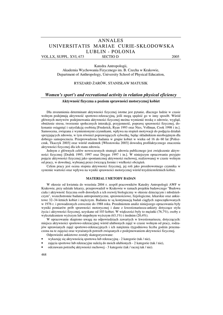 ANNALES UNIVERSITATIS MARIAE CURIE-SKŁODOWSKA LUBLIN - POLONIA VOL.LX, SUPPL. XVI, 673 SECTIO D 2005 Katedra Antropologii, Akademia Wychowania Fizycznego im. B. Czecha w Krakowie, Department of Anthropology, University School of Physical Education, RYSZARD ŻARÓW, STANISŁAW MATUSIK Women’s sport’s and recreational activity in relation physical eficiency Aktywność fizyczna a poziom sprawności motorycznej kobiet Dla zrozumienia determinant aktywności fizycznej istotne jest pytanie, dlaczego ludzie w czasie wolnym podejmują aktywność sportowo-rekreacyjną, jeśli mogą spędzić go w inny sposób. Wśród głównych motywów podejmowania aktywności fizycznej można wymienić troskę o zdrowie, wygląd, obniżenie stresu, tworzenie społecznych interakcji, przyjemność, poprawę sprawności fizycznej, dokonanie osiągnięć i satysfakcję osobistą [Frederick, Ryan 1993 oraz Nies, Vollman, Cook 1998 i in.]. Samoocena, związana z wymienionymi czynnikami, wpływa na stopień motywacji do podjęcia działań sprzyjających zdrowiu, w tym również poprawiających sylwetkę, będąc składnikiem nieobojętnym dla dobrego samopoczucia. Przeprowadzone badania w grupie kobiet w wieku od 16 do 60 lat [Poliszczuk, Tkaczyk 2003] oraz wśród studentek [Włostowska 2003] dowodzą profilaktycznego znaczenia aktywności fizycznej dla ich stanu zdrowia. Jednym z głównych celów nowoczesnych strategii zdrowia publicznego jest zwiększenie aktywności fizycznej [Drabik 1995, 1997 oraz Drygas 1997 i in.]. W niniejszym opracowaniu przyjęto pojęcie aktywności fizycznej jako spontanicznej aktywności ruchowej, realizowanej w czasie wolnym od pracy, w dowolnej, wybranej przez ćwiczącą formie i wielkości obciążeń. Celem pracy jest ocena stopnia aktywności fizycznej, jej roli jako prozdrowotnego czynnika w systemie wartości oraz wpływu na wyniki sprawności motorycznej wśród trzydziestoletnich kobiet. MATERIAŁ I METODY BADAN W okresie od kwietnia do września 2004 r. zespół pracowników Katedry Antropologii AWF w Krakowie, przy udziale lekarzy, przeprowadził w Krakowie w ramach projektu badawczego "Budowa ciała i aktywność fizyczna osób dorosłych a ich rozwój biologiczny w okresie dziecięcym i młodzieńczym", wszechstronne badania antropometryczne, sprawnościowe, fizjologiczne, lekarskie oraz ankietowe 32–34-letnich kobiet i mężczyzn. Badania te są kontynuacją badań ciągłych zapoczątkowanych w 1976 r. i prowadzonych corocznie do 1988 roku. Przedmiotem analiz niniejszego opracowania były wyniki pomiarów prób sprawności motorycznej i dane z kwestionariusza-ankiety dotyczące stylu życia i aktywności fizycznej, uzyskane od 103 kobiet. W większości były to mężatki (76,7%), osoby z wykształceniem wyższym lub niepełnym wyższym (63,1%) i średnim (20,4%). W opracowaniu skupiono uwagę na odpowiedziach zawartych w kwestionariuszu, dotyczących: miejsca aktywności sportowo-rekreacyjnej wśród ulubionych zajęć w czasie wolnym od pracy, rodzajów uprawianych zajęć sportowo-rekreacyjnych i ich natężenia (tygodniowa liczba godzin przeznaczona na te zajęcia) oraz wyrażanych potrzeb związanych z podejmowaniem aktywności fizycznej. Odpowiedzi ankietowe zostały skategoryzowane: • wykazuję się aktywnością sportowa lub rekreacyjną - 2 kategorie (tak / nie), • zajęcia sportowe lub rekreacyjne należą do moich ulubionych - 2 kategorie (tak / nie), • odczuwam potrzebę aktywności ruchowej - 3 kategorie (tak / raczej tak / nie). 468 Dodatkowo, na podstawie danych ankietowych, oceniono deklarowaną aktywność ruchową w weekendy w 3 kategoriach (niska aktywność fizyczna lub jej brak / średnia aktywność / duża aktywność). Próby sprawności motorycznej obejmowały: tapping, skłon dosiężny w siadzie, skok w dal z miejsca, zaciskanie ręki prawej, zaciskanie ręki lewej, rzut piłką lekarską w tył ponad głową oraz bieg „po kopercie”. Zdolności motoryczne wpływające wyniki prób sprawności zbadano posługując się analizą czynnikową, natomiast zależności stochastyczne oceniono posługując się testem Chi-kwadrat i współczynnikami korelacji warunkowej gamma. WYNIKI I DYSKUSJA Wśród badanych 58,8% wykazuje się aktywnością sportową lub rekreacyjną w czasie wolnym, natomiast zajęcia tego typu nie należą do ulubionych dla 64,1% kobiet. Należy podkreślić, że związek między podejmowaniem aktywności fizycznej a wskazywaniem takiej formy spędzania czasu jako ulubionej (γ = 0,598) jest statystycznie istotny (χ2 = 9,17, α<0,05). Oznacza to, że częściej aktywnością fizyczną wykazują się kobiety, które zajęcia ruchowe. Wśród nieaktywnych kobiet 19% deklaruje, że takie zajęcia lubi, choć nie decyduje się na ich uprawianie. Podejmowanie różnych form aktywności ruchowej przez blisko 52% wśród nie zaliczających do ulubionych tego typu zajęć kobiet świadczy, że świadomość ich korzystnego wpływu na zdrowie, sylwetkę lub kondycję fizyczną, przeważa nad stroną emocjonalną, w odniesieniu wysiłku związanego z ruchem. Sugeruje to równocześnie wysokie usytuowanie w hierarchii wartości aktywności fizycznej jako elementu utrzymania bądź poprawienia dobrego samopoczucia, będącego ważnym, subiektywnym wskaźnikiem zdrowia [Bulicz i Murawow 2003]. Brak aktywności ruchowej Wykazuje aktywność ruchową 100 86,7 80 65,2 66,7 % 60 40 20 33,3 34,8 13,3 0 Nie oraz raczej nie Raczej tak Tak Deklarowana potrzeba aktywności ruchowej Ryc. 1. Aktywność ruchowa w grupach kobiet deklarujących potrzebę jej uprawiania Potrzebę aktywności fizycznej deklaruje ponad 85% kobiet (odpowiedź „tak” i „raczej tak”, ryc. 1). Wśród pozytywnych deklaracji aż 2/3 badanych rzeczywiście podejmuje rozmaite formy aktywności ruchowej. Trzeba dodać, iż także wśród nie odczuwających takiej potrzeby ponad 13% uczestniczy w zajęciach ruchowych. Związek ten jest statystycznie istot