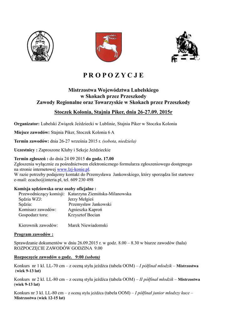 PROPO ZYCJ E Mistrzostwa Województwa Lubelskiego w Skokach przez Przeszkody Zawody Regionalne oraz Towarzyskie w Skokach przez Przeszkody Stoczek Kolonia, Stajnia Piker, dnia 26-27.09. 2015r Organizator: Lubelski Związek Jeździecki w Lublinie, Stajnia Piker w Stoczku Kolonia Miejsce zawodów: Stajnia Piker, Stoczek Kolonia 6 A Termin zawodów: dnia 26-27 września 2015 r. (sobota, niedziela) Uczestnicy : Zaproszone Kluby i Sekcje Jeździeckie Termin zgłoszeń : do dnia 24 09 2015 do godz. 17.00 Zgłoszenia wyłącznie za pośrednictwem elektronicznego formularza zgłoszeniowego dostępnego na stronie internetowej www.lzj-konie.pl. W razie potrzeby podajemy kontakt do Przemysława Jankowskiego, który sporządza list startowe e-mail: [email protected], tel. 609 230 498 Komisja sędziowska oraz osoby oficjalne : Przewodniczący komisji: Katarzyna Ziemińska-Milanowska Sędzia WZJ: Jerzy Mełgieś Sędzia: Przemysław Jankowski Komisarz zawodów: Agnieszka Kaproń Gospodarz toru: Krzysztof Bocian Kierownik zawodów: Marek Niewiadomski Program zawodów : Sprawdzanie dokumentów w dniu 26.09.2015 r. w godz. 8.00 – 8.30 w biurze zawodów (hala) ROZPOCZĘCIE ZAWODÓW GODZINA 9.00 Rozpoczęcie zawodów o godz. 9:00 (sobota) Konkurs nr 1 kl. LL-70 cm – z oceną stylu jeźdźca (tabela OOM) – I półfinał młodzik – Mistrzostwa (wiek 9-13 lat) Konkurs nr 2 kl. LL-80 cm – z oceną stylu jeźdźca (tabela OOM) – II półfinał młodzik – Mistrzostwa (wiek 9-13 lat) Konkurs nr 3 kl. LL-80 cm – z oceną stylu jeźdźca (tabela OOM) – I półfinał junior młodszy kuce – Mistrzostwa (wiek 12-15 lat) 2 Konkurs nr 4 kl. LL-80 cm – z oceną stylu jeźdźca (tabela OOM) – II półfinał junior młodszy kuce Mistrzostwa (wiek 12-15 lat) Konkurs nr 5 kl. LL-80 cm – z oceną stylu jeźdźca - (Reg. Skoki 2015, tab. III) konkurs towarzyski Konkurs nr 6 kl. L (100 cm) – zwykły (art. 238.2.1) Konkurs nr 7 kl. L (100 cm) – z oceną stylu jeźdźca (tabela OOM) – I półfinał junior młodszy – Mistrzostwa (wiek 12-15 lat ) Konkurs nr 8 kl. P (110 cm) – dokładności (tabela OOM) – II półfinał junior młodszy – Mistrzostwa (wiek 12-15 lat ) Konkurs nr 9 kl. P (110 cm) – dokładności (art. 238.1.1) – I półfinał junior – Mistrzostwa (wiek 14-18 lat) Konkurs nr 10 kl. P (110 cm) – dokładności (art. 238.1.1) – II półfinał junior – Mistrzostwa (wiek 14-18 lat) Konkurs nr 11 kl. P (110 cm) – zwykły (art. 238.2.1) Konkurs nr 12 kl. P (110 cm) – szybkości (art. 239.1.2.6) – I półfinał młody jeździec – Mistrzostwa (wiek 16- 21 lat) Konkurs nr 13 kl. N (120 cm) – dokładności (art. 238.1.1) – II półfinał młody jeździec – Mistrzostwa (wiek 16-21 lat) Konkurs nr 14 kl. N (120 cm) – dwunawrotowy (art. 273. 2.1./3.3.2.) Konkurs nr 15 kl. N (120 cm) – szybkości (art. 239.1.2.6) – I półfinał seniorzy – Mistrzostwa (wiek 18 lat +) Konkurs nr 16 kl. C (130 cm) – dokładności (art. 238.1.1) – II półfinał seniorzy – Mistrzostwa wiek 18 lat +) Rozpoczęcie zawodów o godz. 8:00 (niedziela) Konkurs nr 17 kl. LL-80 cm – dokładności (tabela OOM) – I nawrót finału młodzik – Mistrzostwa (wiek 9-13 lat) Konkurs nr 18 kl. LL-80 cm – zwykły (tabela OOM) – II nawrót finału młodzik – Mistrzostwa (wiek 9-13 lat) Konkurs nr 19 kl. LL-80 cm – dokładności (tabela OOM) – I nawrót finału junior młodszy kuce – Mistrzostwa (wiek 12-15 lat) Konkurs nr 20 kl. LL-80 cm – zwykły (tabela OOM) – II nawrót finału junior młodszy kuce – Mistrzostwa (wiek 12-15 lat) Konkurs nr 21 kl. LL (80 cm) – zwykły (art. 238.2.1) konkurs towarzyski Konkurs nr 22 kl. L (100 cm) – zwykły (art. 238.2.1) konkurs towarzyski Konkurs nr 23 kl. P (110 cm) – dokładności (tabela OOM) – I nawrót finału junior młodszy – Mistrzostwa (wiek 12-15 lat) Konkurs nr 24 kl. P (110 cm) – zwykły (tabela OOM) – II nawrót finału junior młodszy – Mistrzostwa (wiek 12-15 lat) Konkurs nr 25 kl. P (110 cm) – zwykły (art. 238.2.1) Konkurs nr 26 kl. N (120 cm) – dokładności (art. 238.1.1) – I nawrót finału junior – Mistrzostwa (wiek 14-18 lat) Konkurs nr 27 kl. N (120 cm) – zwykły (art. 238.2.1) – II nawrót finału junior – Mistrzostwa (wiek 14-18 lat) Konkurs nr 28 kl. N (120 cm) – dokładności (art. 238.1.1) – I nawrót finału młody jeździec – Mistrzostwa (wiek 16-21 lat) 3 Konkurs nr 29 kl. N (120 cm) – zwykły (art. 238.2.1) – II nawrót finału młody jeździec – Mistrzostwa (wiek 16-21 lat) Konkurs nr 30 kl. N (120 cm) – zwykły (art. 238.2.1) Konkurs nr 31 kl. C (130 cm) – dokładności (art. 238.1.1) – I nawrót finału seniorzy – Mistrzostwa (wiek 18 lat+) Konkurs nr 32 kl. C (130 cm) – zwykły (art. 238.2.1) – II nawrót finału seniorzy – Mistrzostwa (wiek 18 lat+) Sprawy organizacyjne: Dla zwycięzców puchary, medale, flot’s, nagrody pieniężne Zapewniamy Bar – sobota, niedziela Plac konkursowy o podłożu kwarcowym 32m x 75m Rozprężalnia na hali o podłożu kwarcowym 21m x 60m Boks 120zł za całe zawody, możliwość przyjazdu w dniu 25 09 2015 Wcześniejsza rezerwacja imienna tel. 602 378 719 Marek Niewiadomski. Rezerwacja boksów możliwa po wpłacie na konto 57 1020 3150 0000 3102 0043 7160. Ilość boksów ograniczona. Opłata organizacyjna dot. uczestników Mistrzostw 150,00 zł. od konia za cale zawody (bez startowego) Opłata organizacyjna za konkursy otwarte 150zł za dwa dni oraz 100 zł jeden dzień od konia, plus opłata startowa 20 zł – od konkursu – całe startowe przeznaczone na nagrody dla zawodników. Podczas zawodów obowiązują przepisy PZJ i LZJ Organizator nie odpowiada za ewentualne wypadki kradzieże zaistniałe w czasie transportu i podczas trwania zawodów. Kodeks postępowania z koniem : I. Na wszystkich etapach treningu i przygotowań konia do startu w zawodach, dobro konia musi stać ponad wszelkimi innymi wymagani